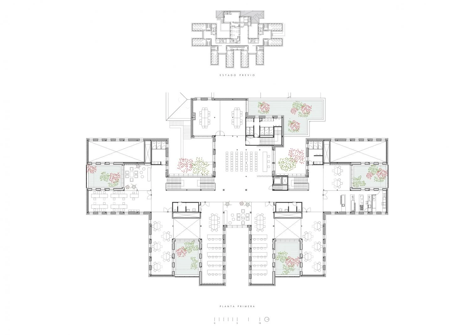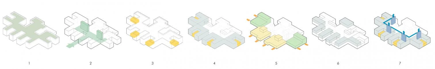 Entre las principales estrategias adoptadas en el proyecto se encuentran: la instalación de una cubierta verde extensiva con riego integrado y recuperación de aguas pluviales, que incluye placas fotovoltaicas; la mejora de la eficiencia energética del edificio que presenta un alto aislamiento térmico; la construcción de dos nuevos núcleos de comunicaciones verticales; y la cubrición de los patios en planta baja para obtener cuatro amplias áreas de trabajo. Este nivel alberga las actividades que precisan maquinaria pesada o de mayor altura. En planta primera, con divisiones diáfanas fijas y móviles, se sitúan las aulas, los laboratorios y las salas de reunión.