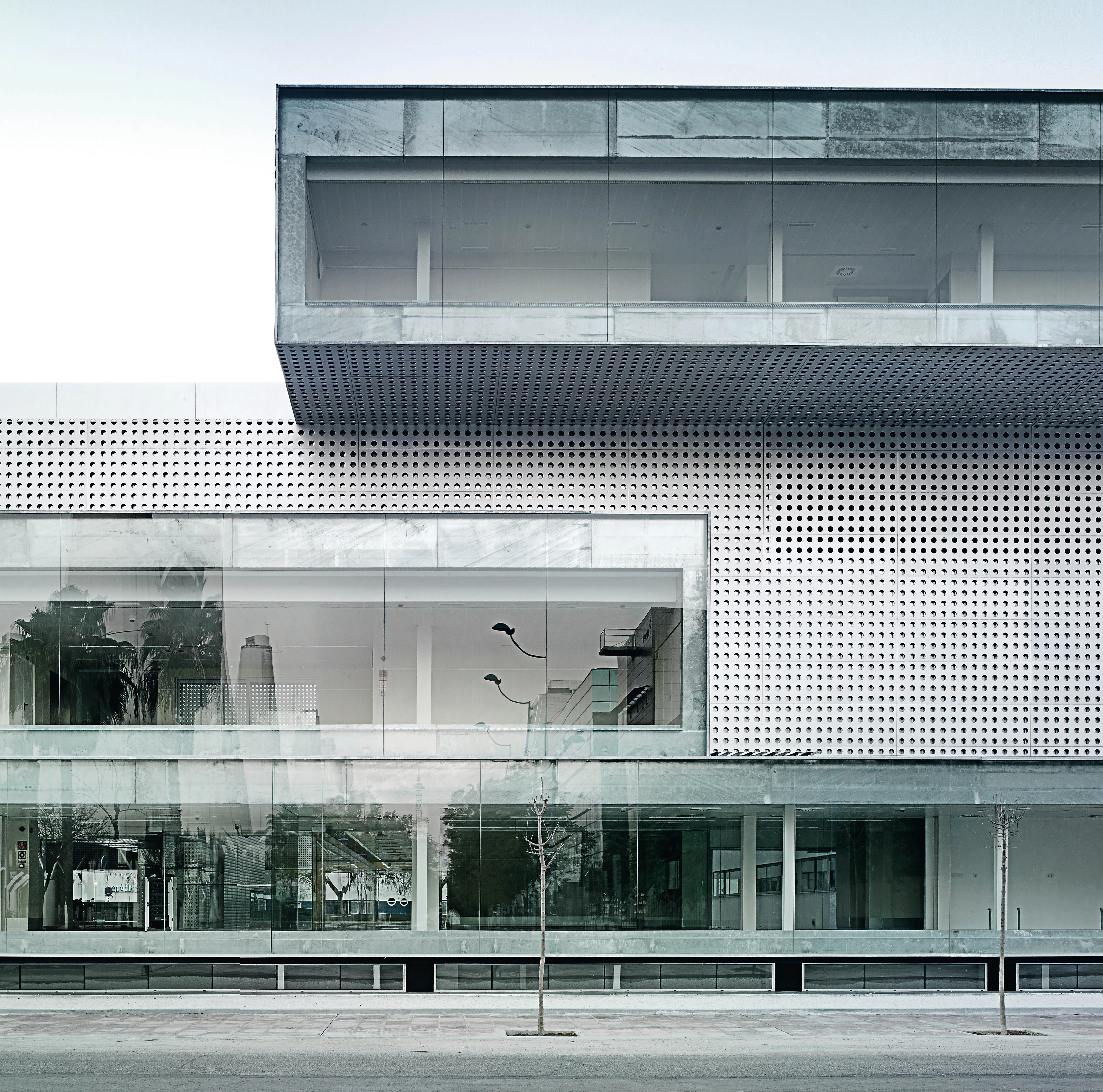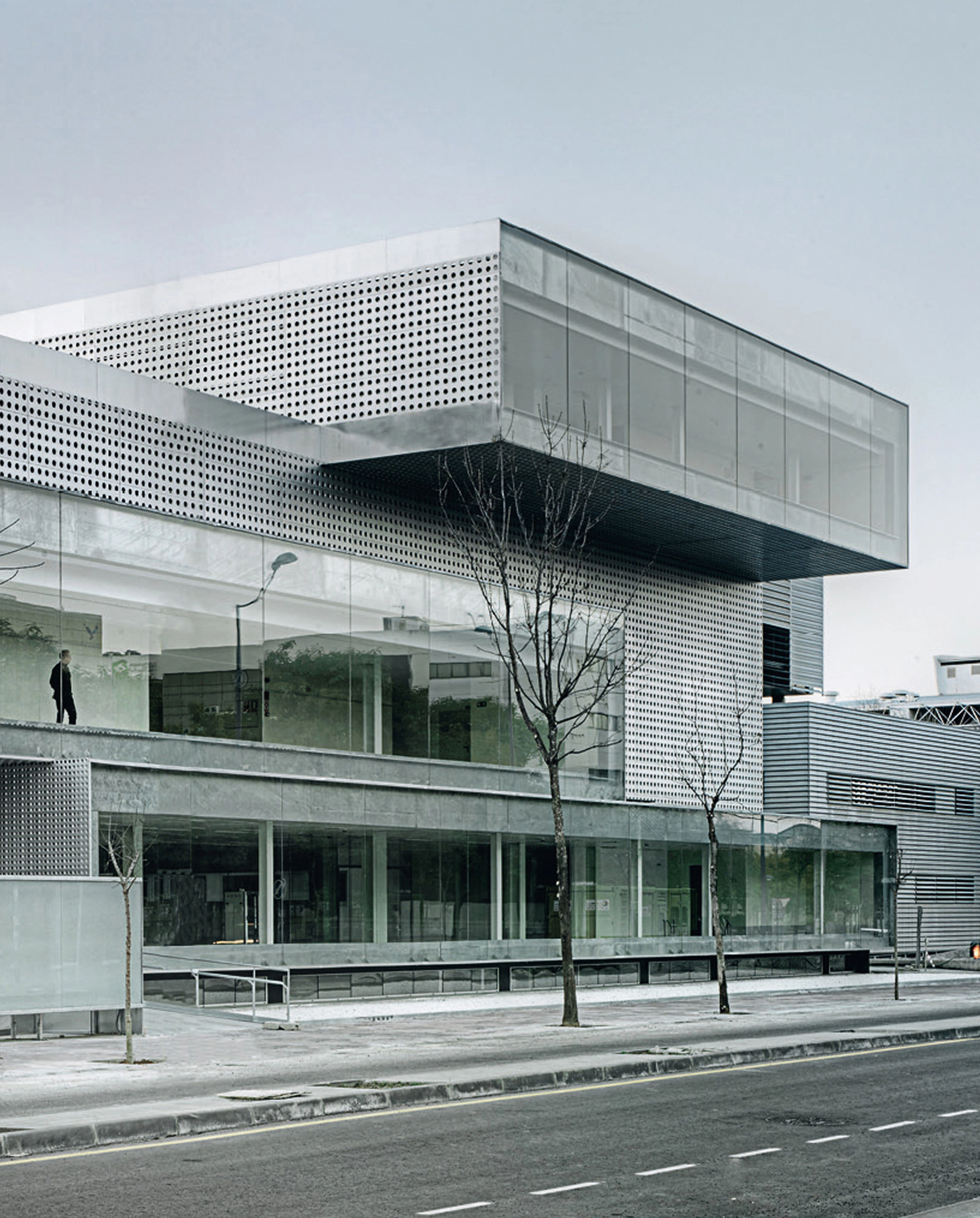 Tanto las fachadas exteriores como las de los patios interiores se recubren con un acabado de chapa metálica perforada acompañada de vidrio transparente en las áreas que deben recibir una iluminación directa y en los vestíbulos de cada planta. La combinación de vidrio y chapa en dos capas superpuestas posibilita la iluminación, ventilación y privacidad de las estancias que vuelcan a los patios, sin romper la homogeneidad general.