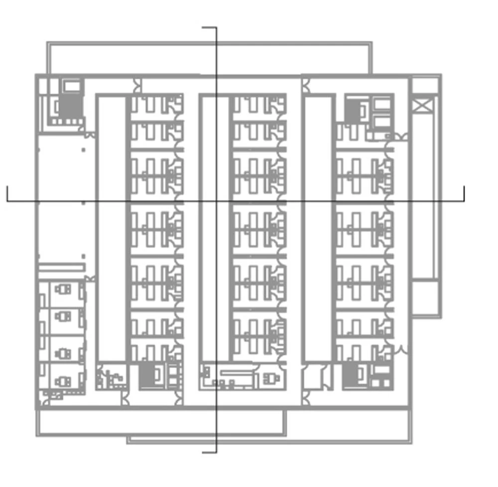 El proyecto plantea el uso de uno de los patios como una gran calle pasante que recoge los accesos y desde la que se relaciona todo el programa del hospital. En este vacío interior se recogen las comunicaciones que llevan hacia los vestíbulos de los diferentes niveles. Los vestíbulos son piezas estratégicas en el edificio, ya que canalizan el acceso a las estancias y funcionan como áreas polivalentes para el descanso y el contacto con médicos. Por ello, estos espacios se configuran como miradores hacia el paisaje rural y urbano que rodea el edificio, abriéndose hacia el exterior como grandes cajas de vidrio. Este esquema de comunicación —una calle interior con vestíbulos anexos en cada planta— es muy claro y reduce los recorridos, estableciendo el predominio de la horizontalidad en el edificio frente a la comunicación vertical.