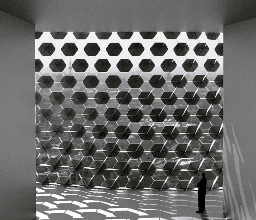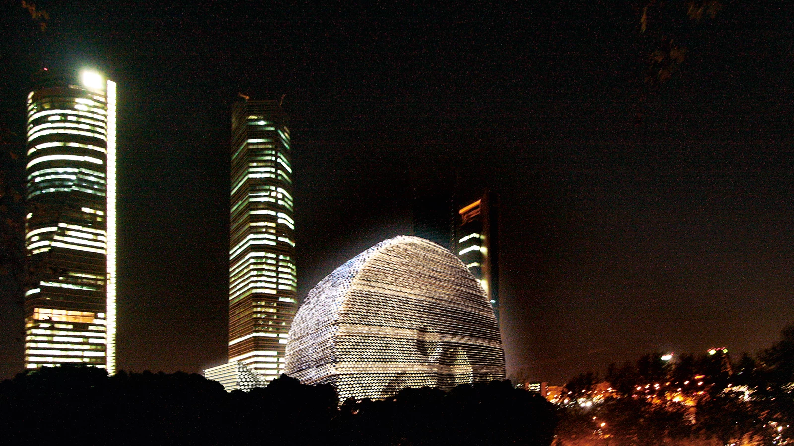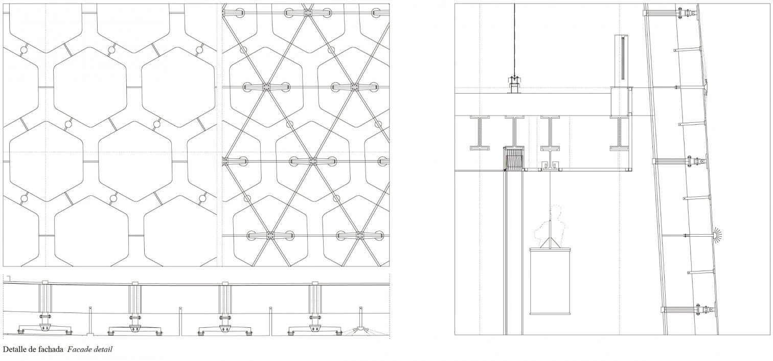 Durante la fase de desarrollo del proyecto, el diseño del centro experimentó algunas modificaciones significativas: las fachadas planas se hicieron ligeramente convexas; las numerosas aberturas cónicas mutaron en grandes ‘cráteres’ concentrados en la zona inferior del volumen; los auditorios abandonaron el disco y se desplazaron al basamento del edificio; y en virtud de su materialidad, a base de piezas hexagonales de aluminio, el sol radiante del proyecto original se transformó en una especular luna plateada sobre Madrid.