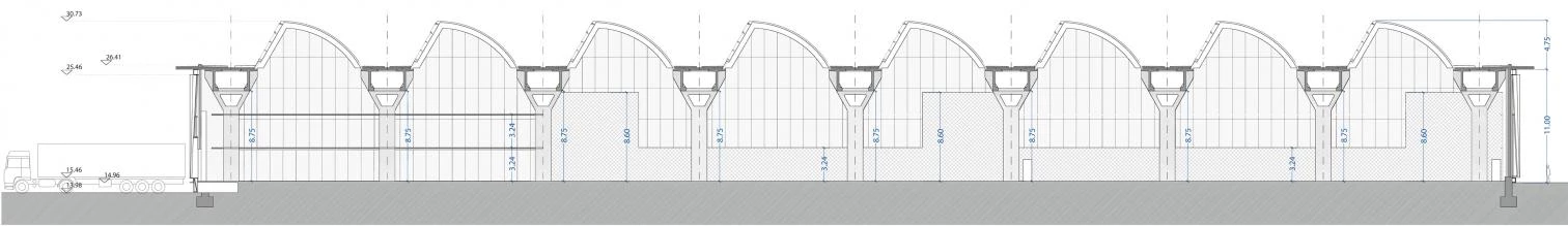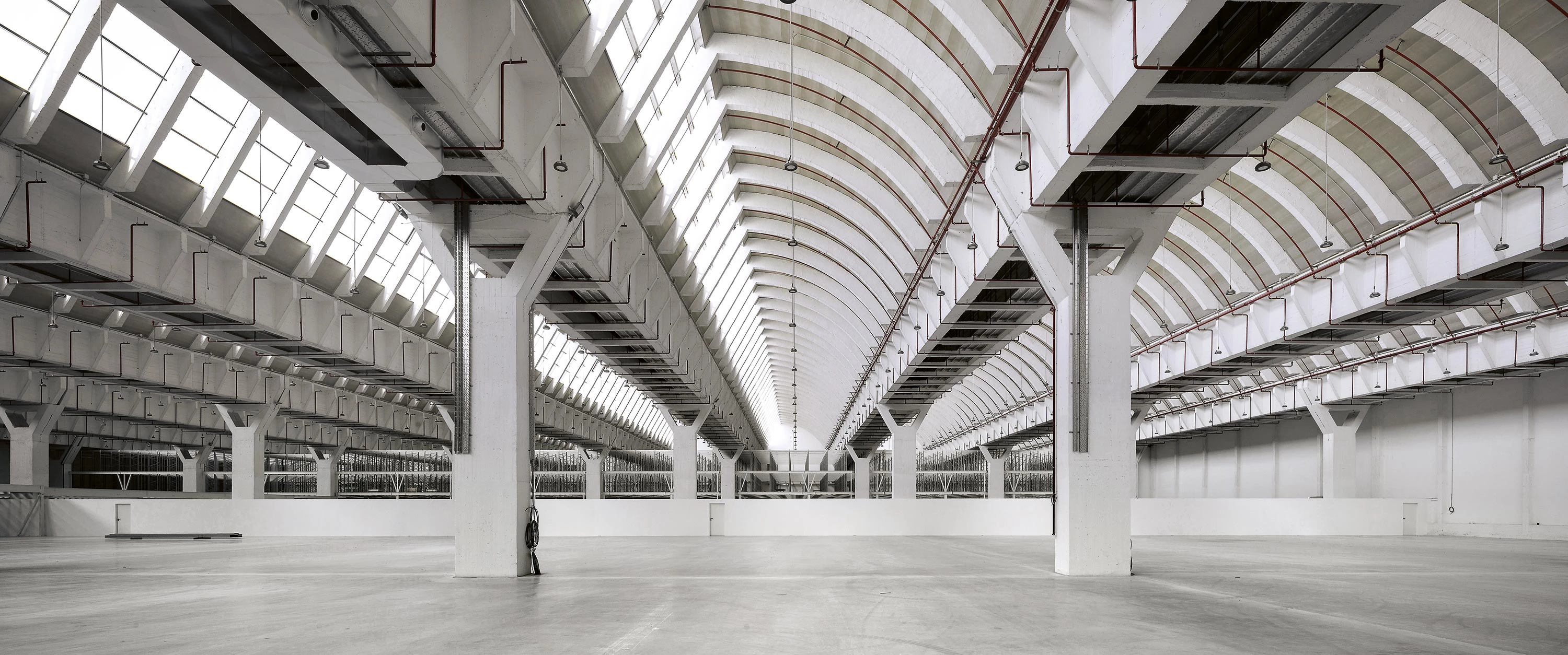 El proyecto mantiene intacta la estructura de hormigón prefabricado de la nave proyectada por Vázquez Molezún; pilares en Y sostienen vigas dobles en las que se asienta la cubierta, con lucernarios orientados a norte.