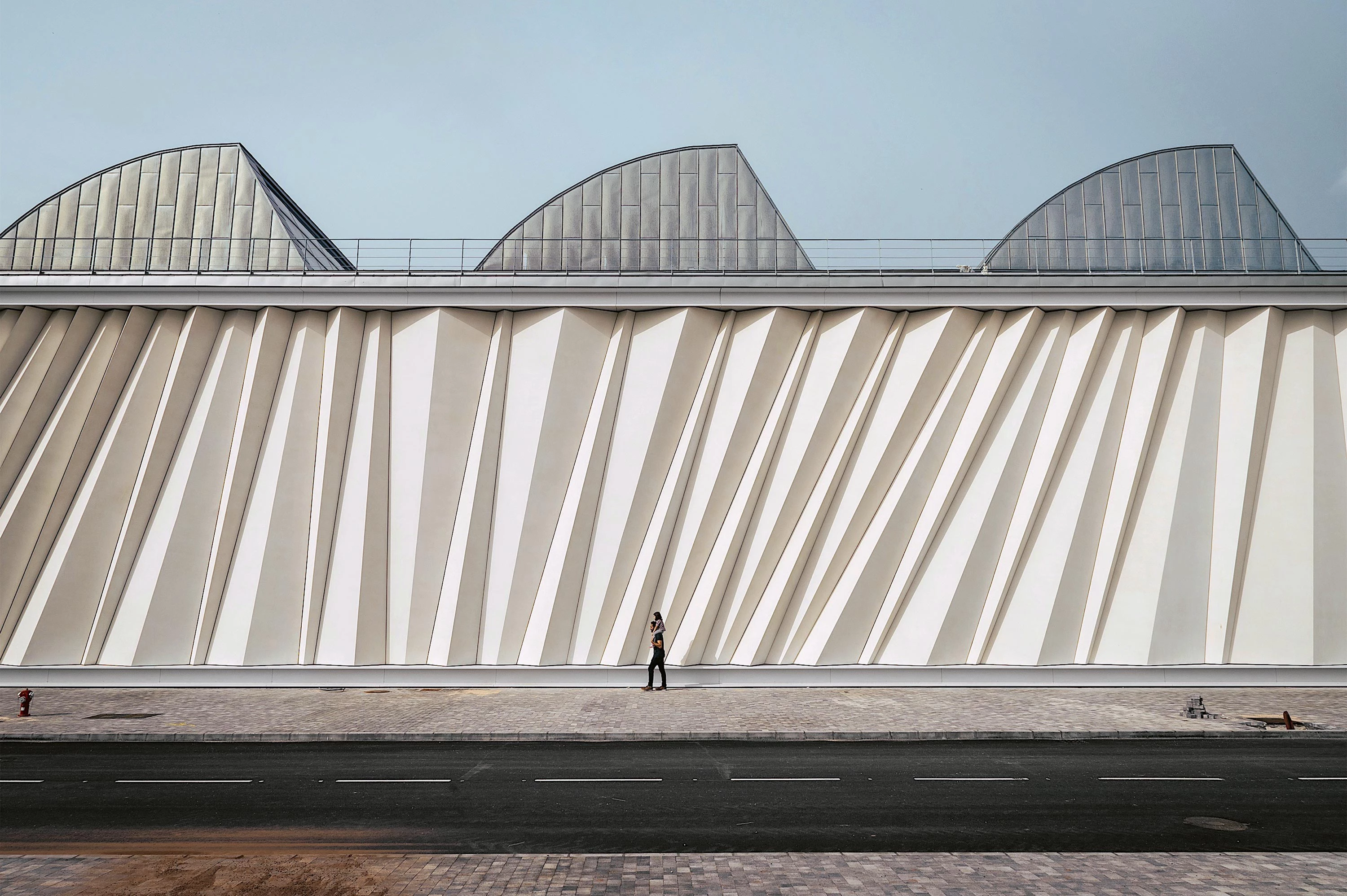 El reto principal del proyecto era integrar los tres objetivos, y así surge la estrategia de diseño, que consiste en crear un sistema de protección solar de inspiración textil como idea motriz de la forma final: un ‘vestido que protege el edificio del sol’. Utilizando los mayores paneles de hormigón reforzado con fibra de vidrio fabricados en España, se crea una nueva fachada, a modo de falda plisada, que reduce la radiación solar en un 39%. Para integrar los pliegues en el edificio se utilizan las proporciones de su sección transversal, de modo que la escala y forma de los paneles nacen de un proceso geométrico de modulación de la estructura existente, empleando la inclinación de los dientes de sierra como dirección principal del sistema.