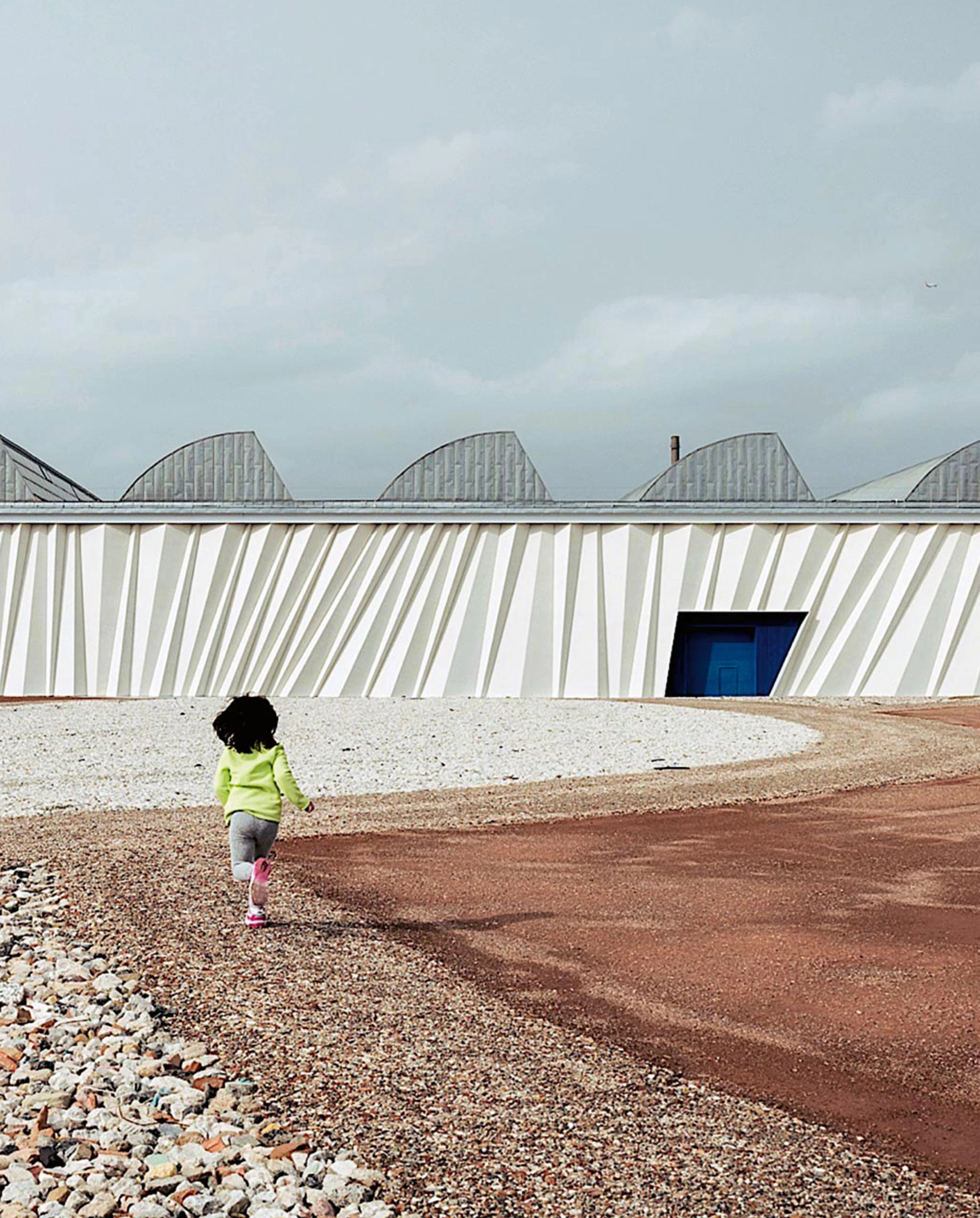 La inspiración textil está presente tanto en la nueva fachada de paneles de GRC que cubre la antigua nave como en la actuación paisajística, que deja preparado el resto de la parcela para acoger futuros edificios de la compañía.