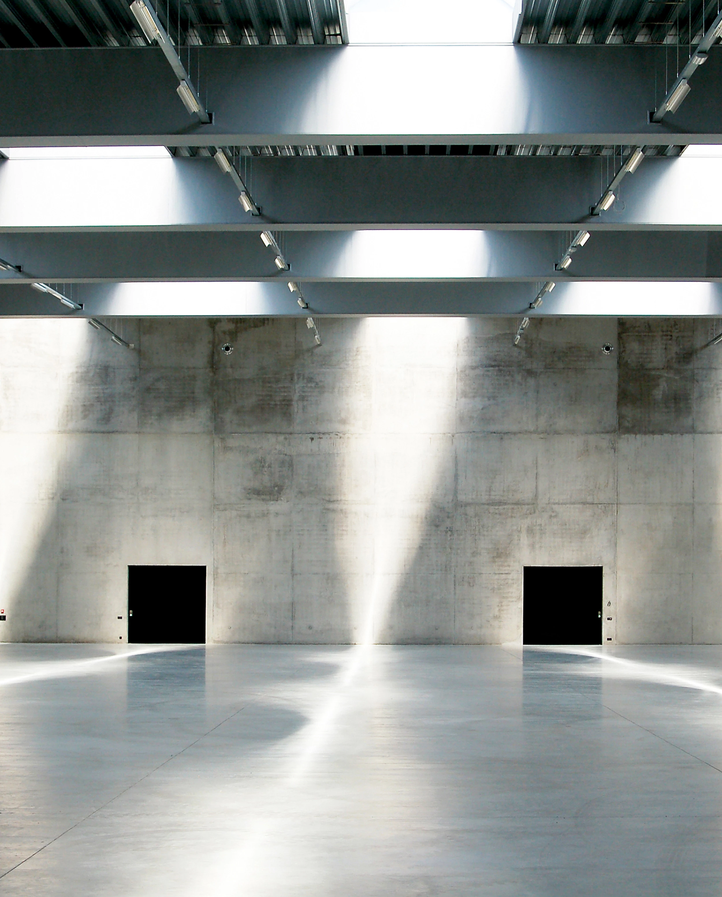 A diferencia de la mayoría de las construcciones industriales —conformadas por materiales ligeros y prefabricados—, el Centro presenta un carácter sólido y duradero, pues además de la imagen derivada de su uso pretende tener una pública y representativa. Concebida como una suerte de muro de piedra, su envolvente está formada por dos fachadas de vidrio y acero, y otras dos, mucho más largas —de más de 100 metros—, construidas con paneles prefabricados de hormigón coloreado en tonos ocres, que le dan un carácter sereno, pero variado, ya que su textura cambia de expresión según la luz del momento, convirtiéndose en una especie de caleidoscopio vibrante. Este volumen pétreo contiene un gran espacio diáfano de cuarenta metros de ancho, que se cubre con una retícula de lucernarios que dejan pasar la luz variable a lo largo del día.