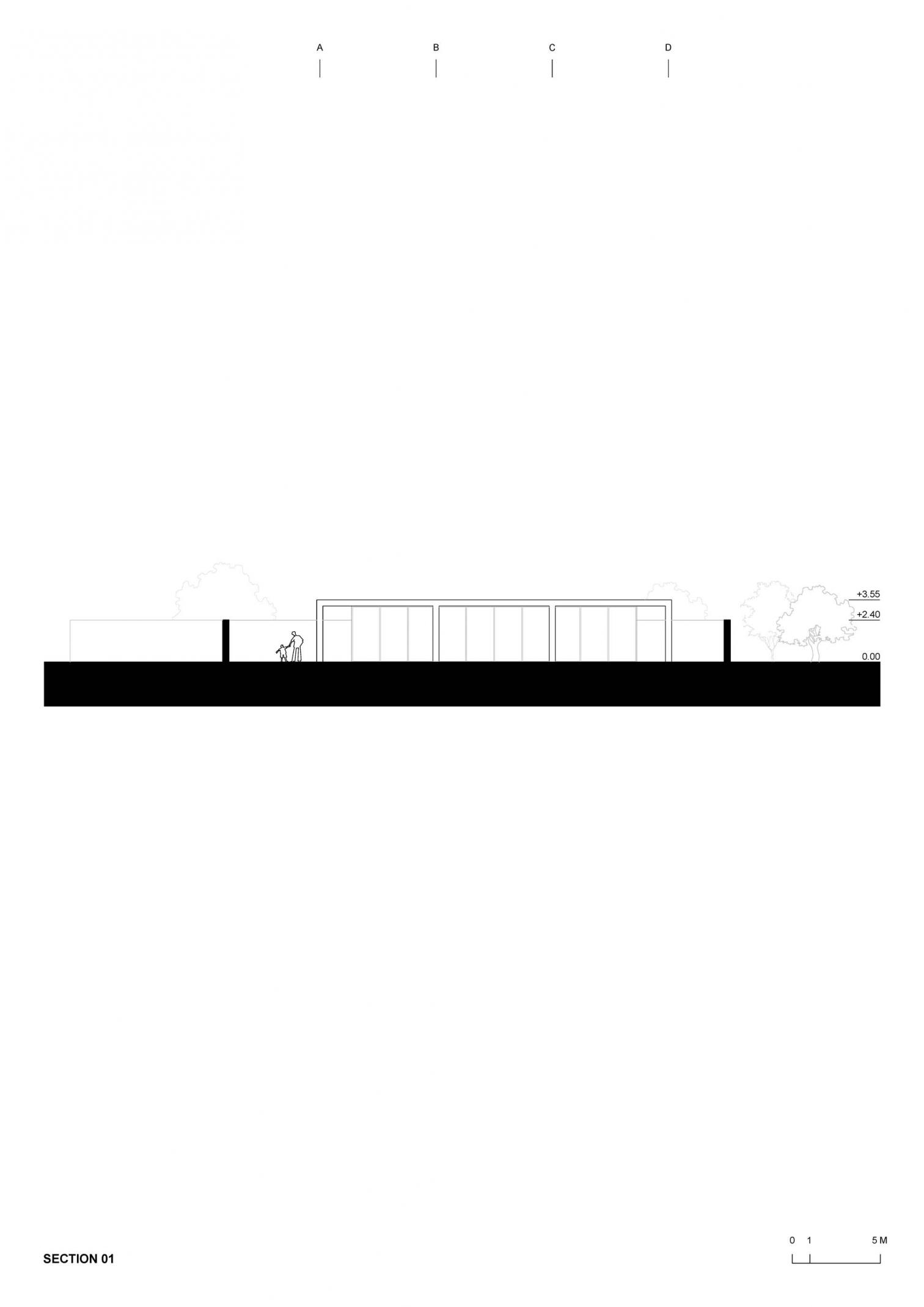 Con una arquitectura sobria, sencilla y de coste reducido, la escuela infantil de una sola altura presenta una planta de geometría cuadrada, organizada mediante pilares equidistantes de hormigón visto. Los muros de color blanco y las superficies vidriadas delimitan la construcción de 250 metros cuadrados.