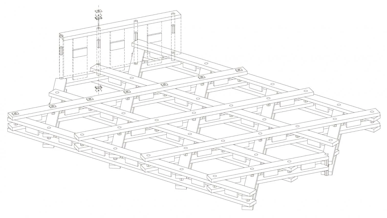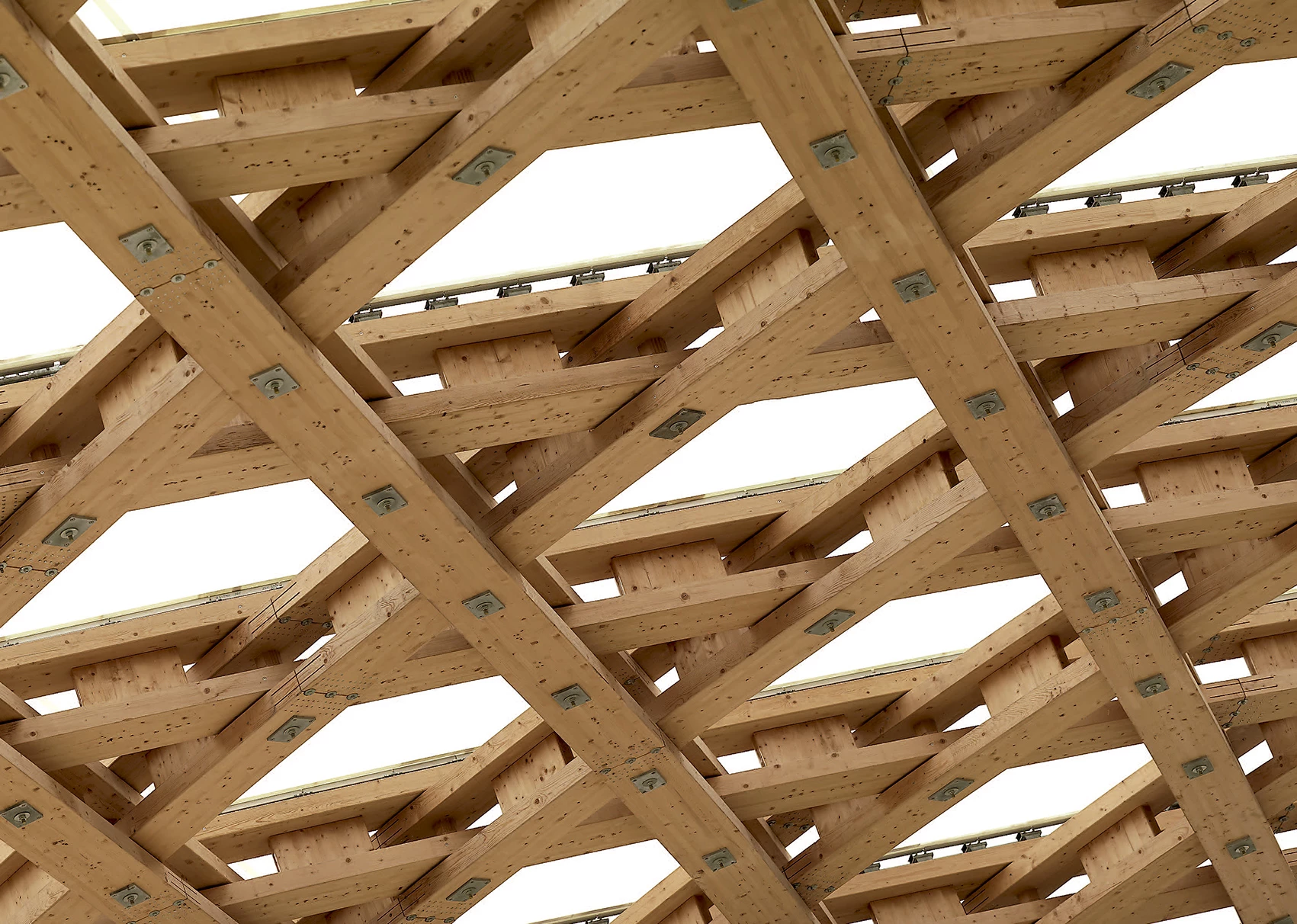 Inspirado en el tejido tradicional chino, el entramado de madera sobre el que se tensa la cubierta sigue un patrón formado por hexágonos y triángulos, de manera que se reduce el número de nervios en cada encuentro. Además, las cintas de madera se superponen entre sí, por lo que se simplifica la geometría de las juntas. La estructura funciona como una cáscara continua que soporta tanto los esfuerzos a tracción como a compresión.