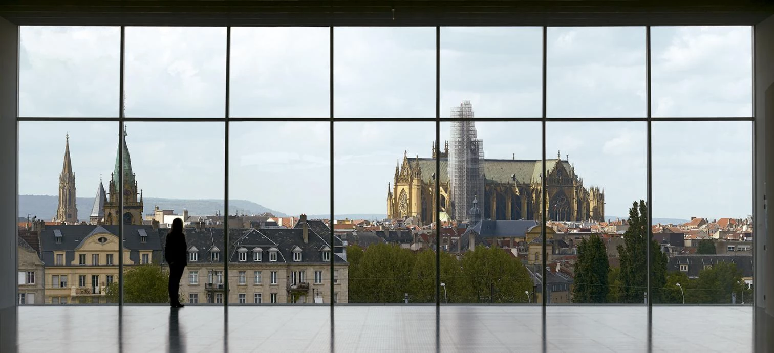 Una gran carpa alabeada da forma a la nueva sede del Centro Pompidou en Metz, a 300 kilómetros de París, en el noreste de Francia. Bajo esta envolvente se apila una serie de volúmenes sencillos en los que se articula el programa. Esta dualidad entre las formas regulares e irregulares permite que el proyecto disfrute de una gran riqueza espacial sin renunciar a la funcionalidad. En torno a una torre de planta hexagonal, que contiene los ascensores, se superponen tres prismas con dimensiones modulares (15 x 90 metros) diseñados para alojar salas de exposición. Cada uno de ellos se dirige hacia un punto determinado del contexto urbano, enmarcando vistas hacia lugares significativos de la ciudad como la catedral o la estación central. Estas tres naves de dimensiones controladas contrastan con la amplitud del vestíbulo que llega hasta los 18 metros de altura.