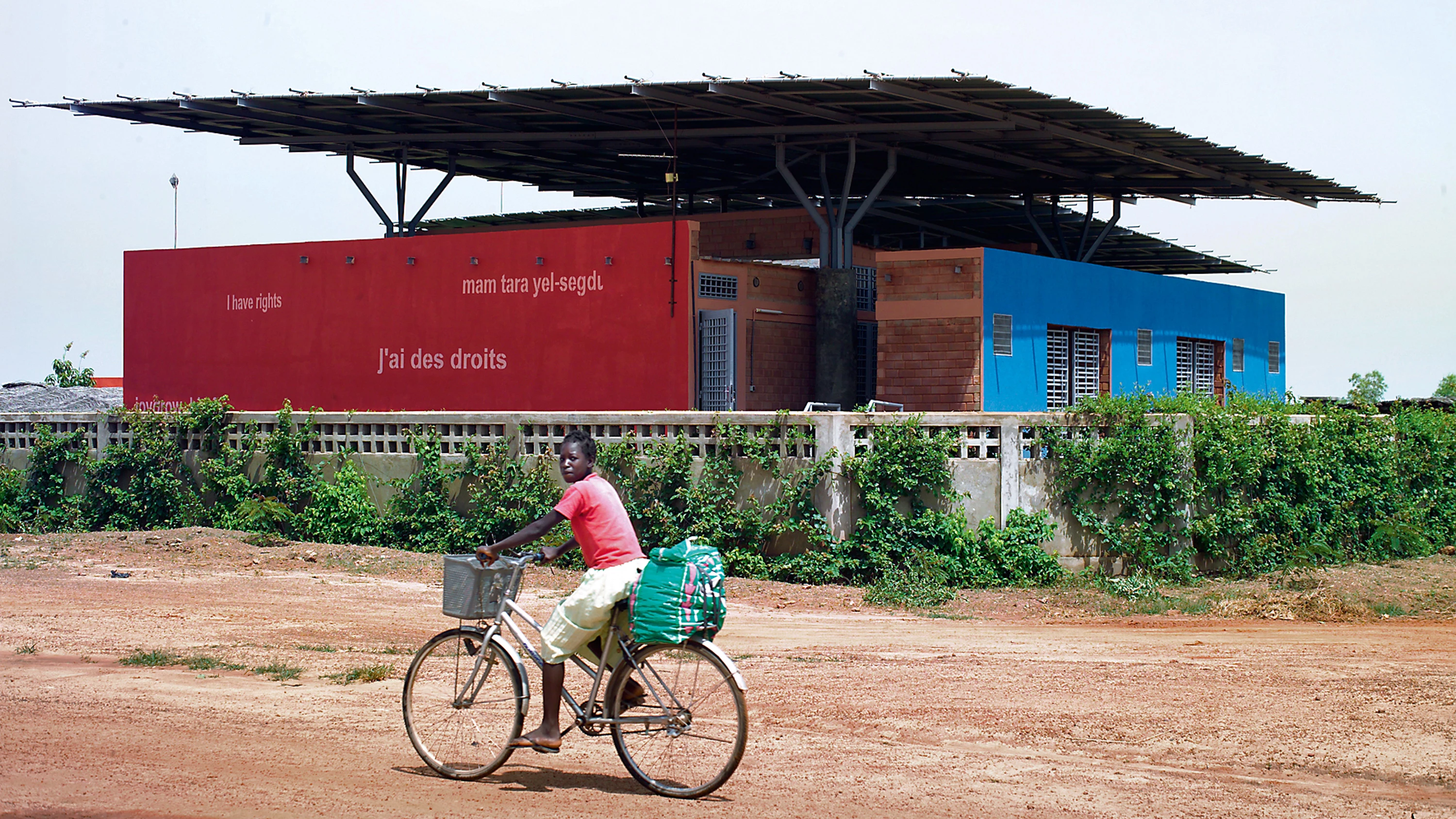 Los muros del complejo se levantaron con ladrillos de tierra apisonada construidos in situ usando una mezcla de barro, cemento y agua. Para acelerar la construcción y facilitar su eventual reutilización, no se usó mortero. La protección contra la lluvia y la radiación solar se garantizó mediante una cubierta ligera de PVC, resistente al agua y reciclable, sostenida por una estructura de ‘árboles’ de acero, y colocada dos metros por encima del techo de los espacios individuales.
