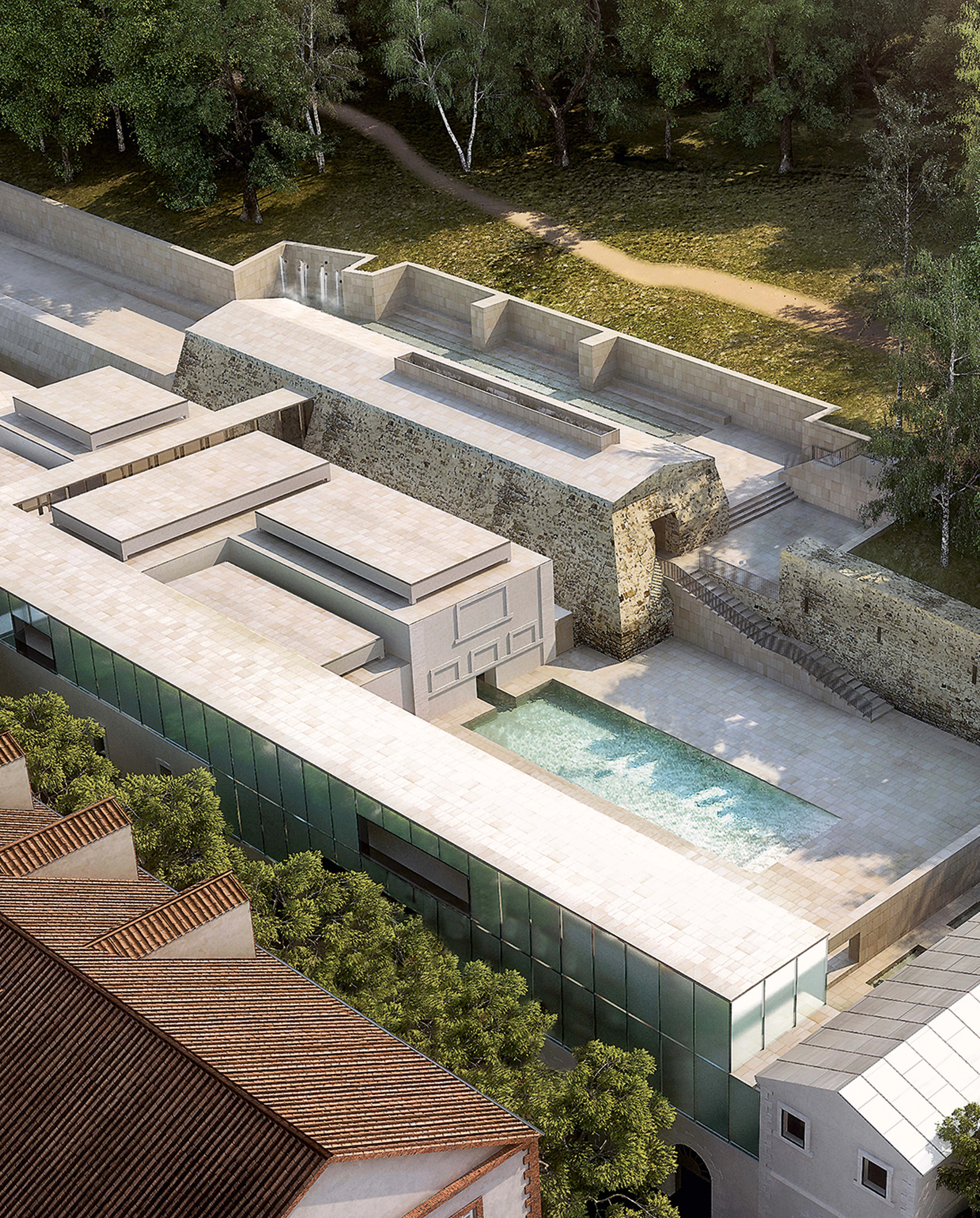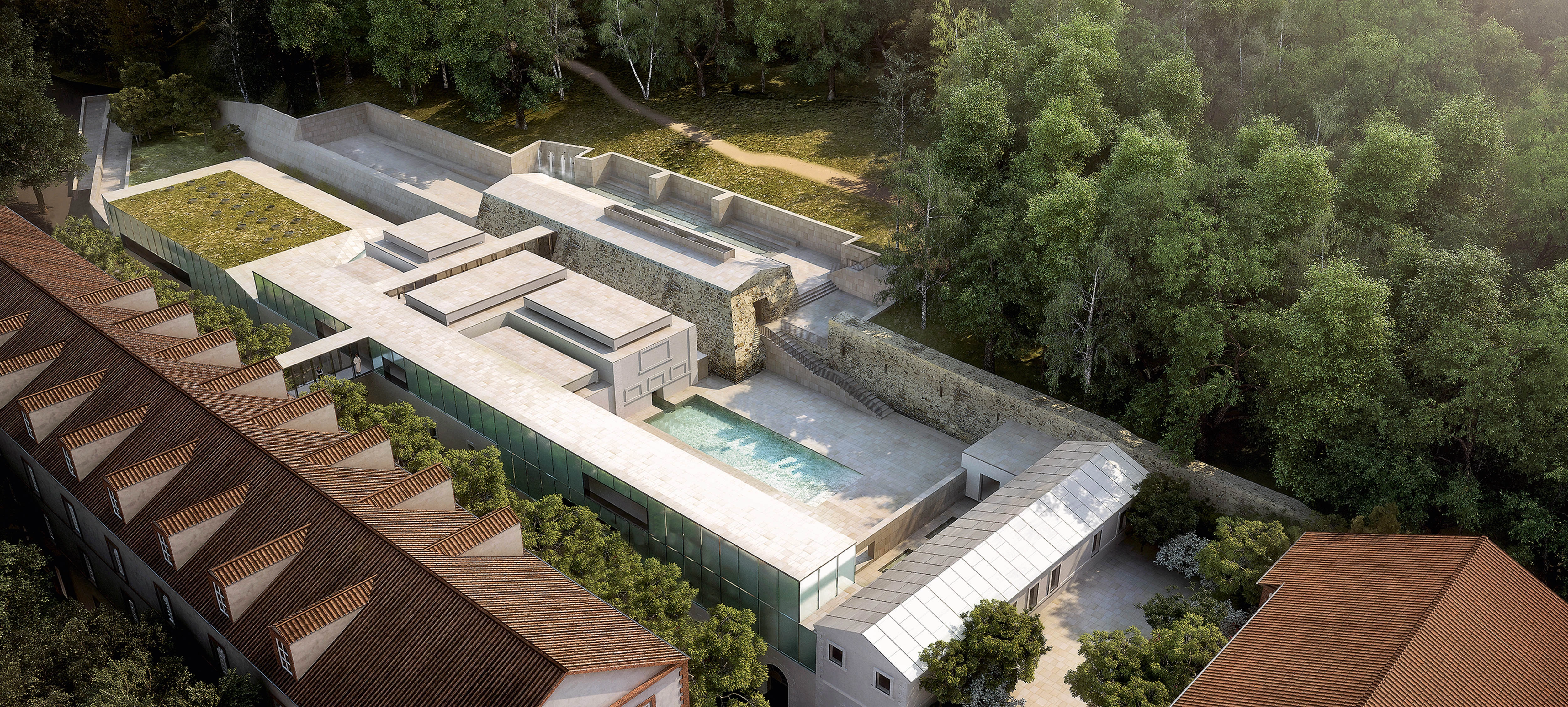 Sobre un antiguo centro termal, la propuesta respeta el valor tectónico y paisajístico del conjunto, contrastando el carácter sólido y pétreo de lo existente con la liviandad de lo nuevo; una pieza vítrea y ligera articula el espacio entre el hotel y las termas.