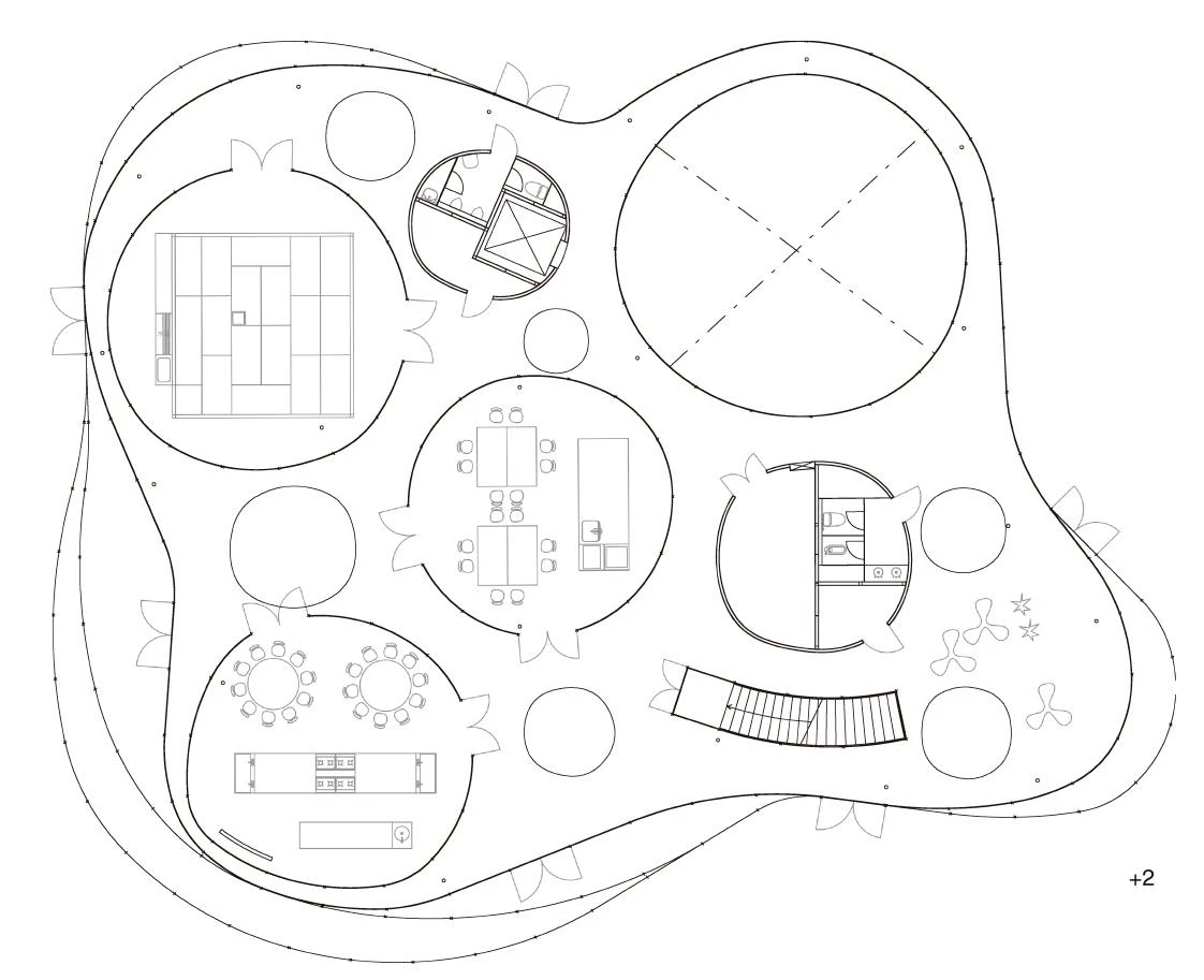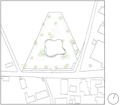 Situado frente a campos de arroz y montañas, este edificio sirve de centro comunitario educacional de mediana escala para la población del entorno. El centro acoge programa diverso como biblioteca, salón comunitario, sala para madres e hijos, aulas seminario, talleres y espacios de descanso. Las diferentes zonas del programa se reparten por tres plantas y se envuelven con perímetros sinuosos de forma ameboide y diferente, de manera que sobresalen unos sobre otros y crean terrazas o voladizos. Cada uno de los niveles tiene un cerramiento de vidrio independiente, definiendo la imagen exterior por los retranqueos y tangencias de las curvas de los planos de fachada.