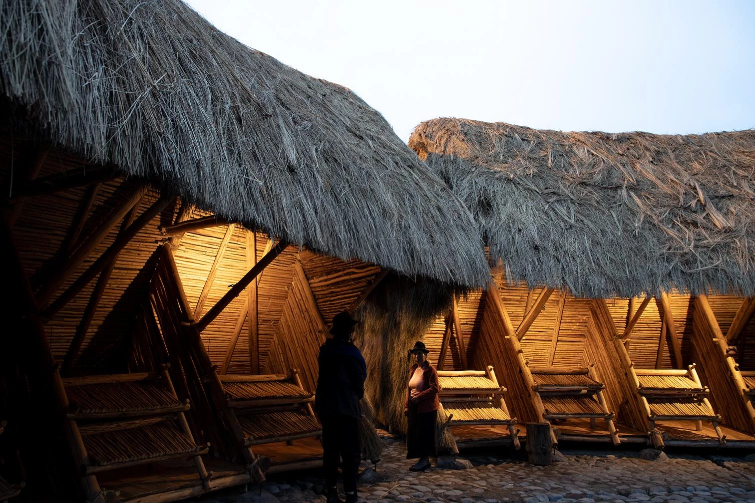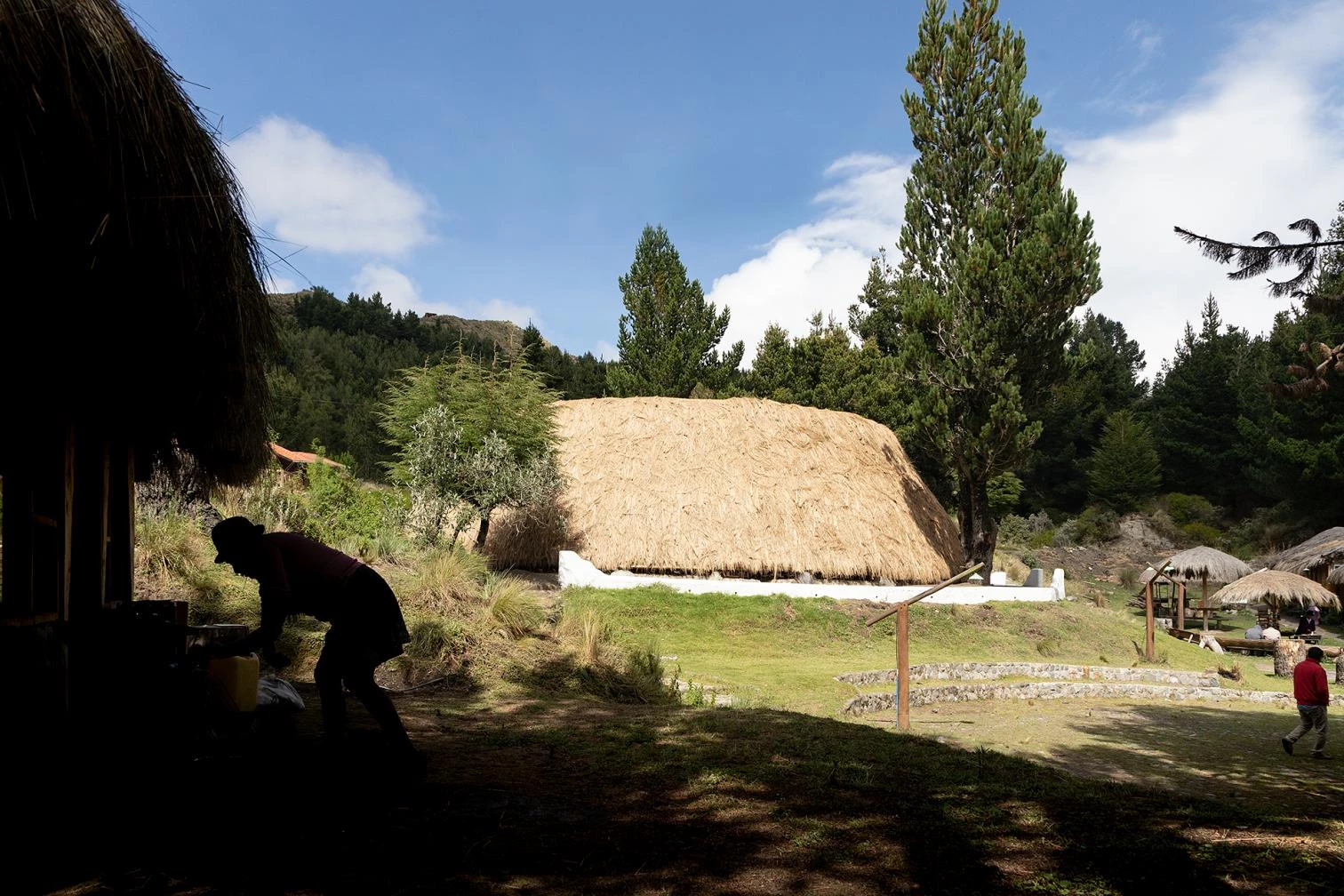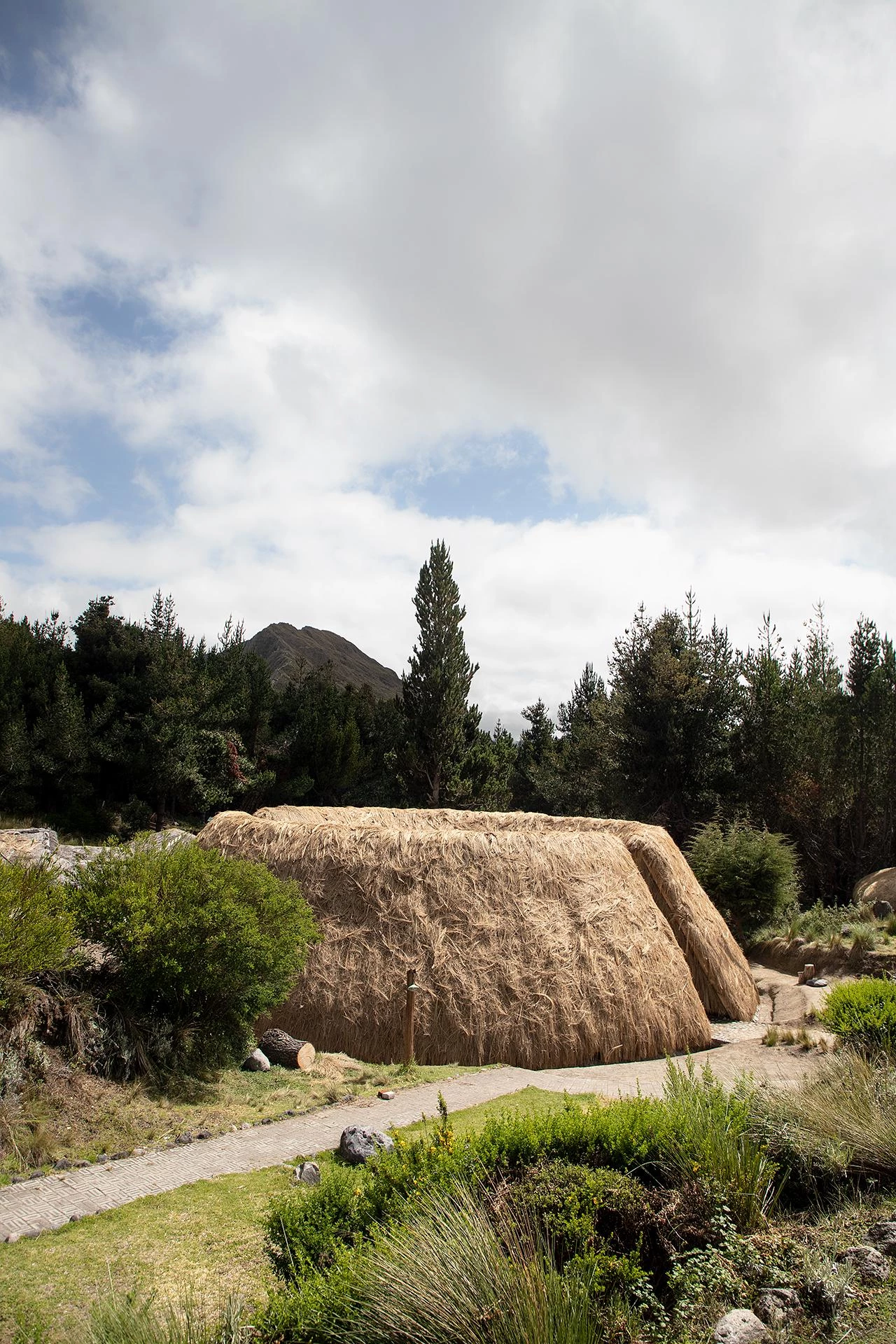 Sobre piedras de río, el pabellón presenta una estructura de madera de eucalipto unida con cabuya (fibra procedente de la planta del penco, una planta con la que se elaboran cuerdas y tejidos), y envuelta por un gran manto de paja. Todo se construyó a mano, con la ayuda de herramientas simples y la fuerza colectiva, en un proceso de transmisión intergeneracional de conocimientos y colaborativo entre la comunidad Shalalá y el estudio de arquitectura La Cabina de la Curiosidad (Marie Combette y Daniel Moreno Flores).