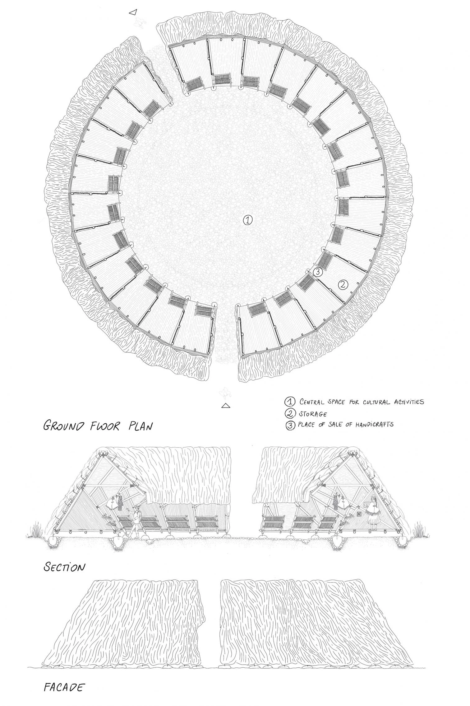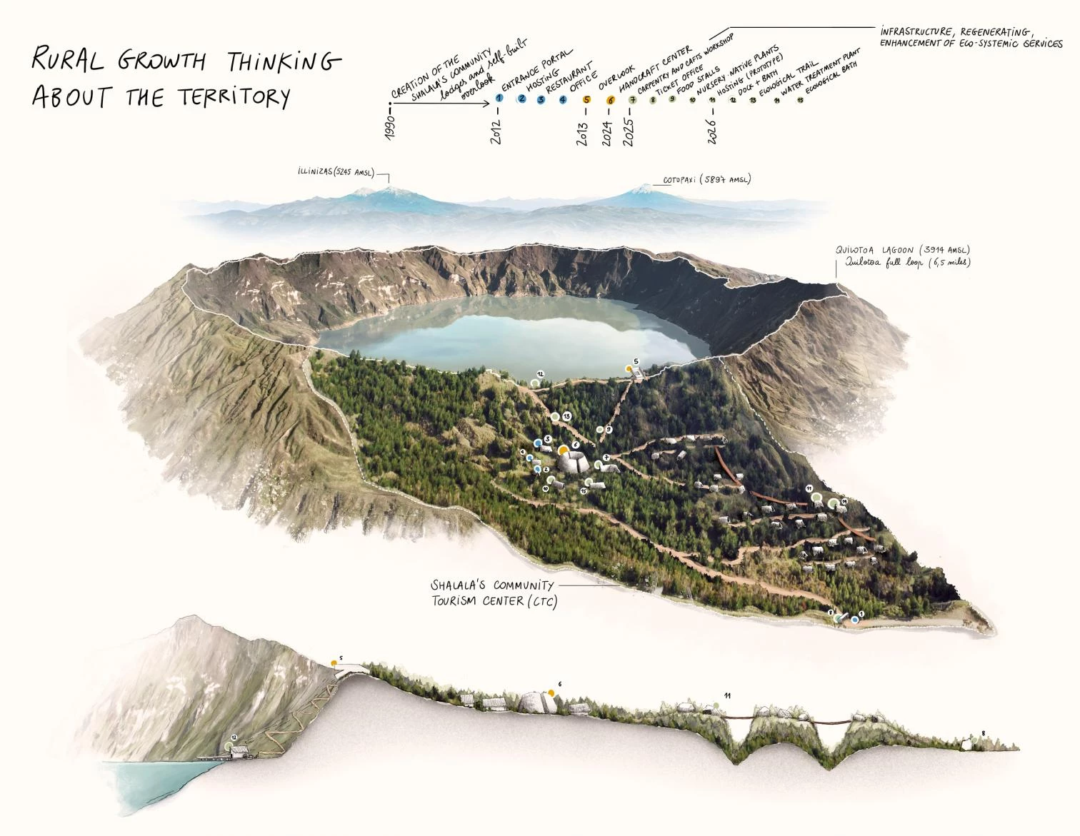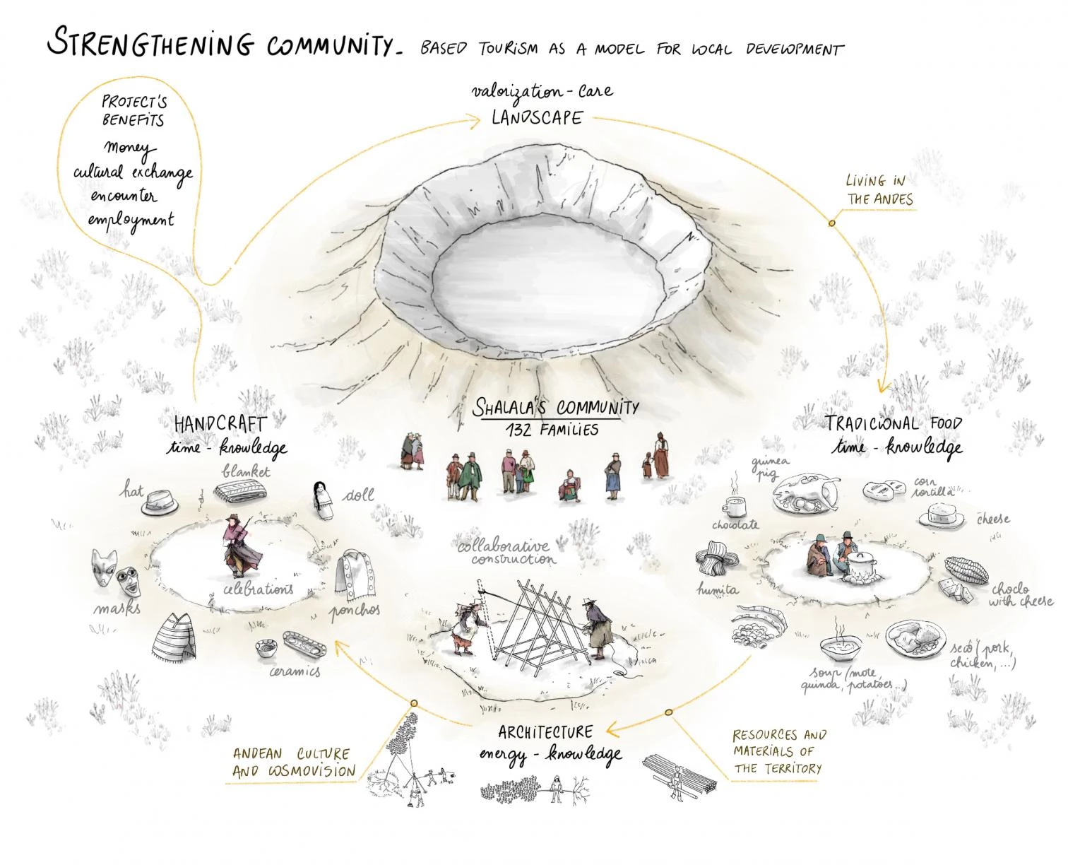 El centro de turismo de la comunidad indígena de Shalalá está ubicado junto al cráter volcánico de la laguna de Quilotoa, en los Andes ecuatorianos. Promoviendo el turismo sostenible, el conjunto ha incorporado recientemente una construcción circular para albergar puestos con sus productos artesanos, organizados alrededor una plaza central empedrada,. Utilizando técnicas de tradición vernácula y materiales locales, el centro de artesanías se denomina Chaki Wasi, su significado en kichwa es casa de paja realizada desde el suelo hasta el techo.
