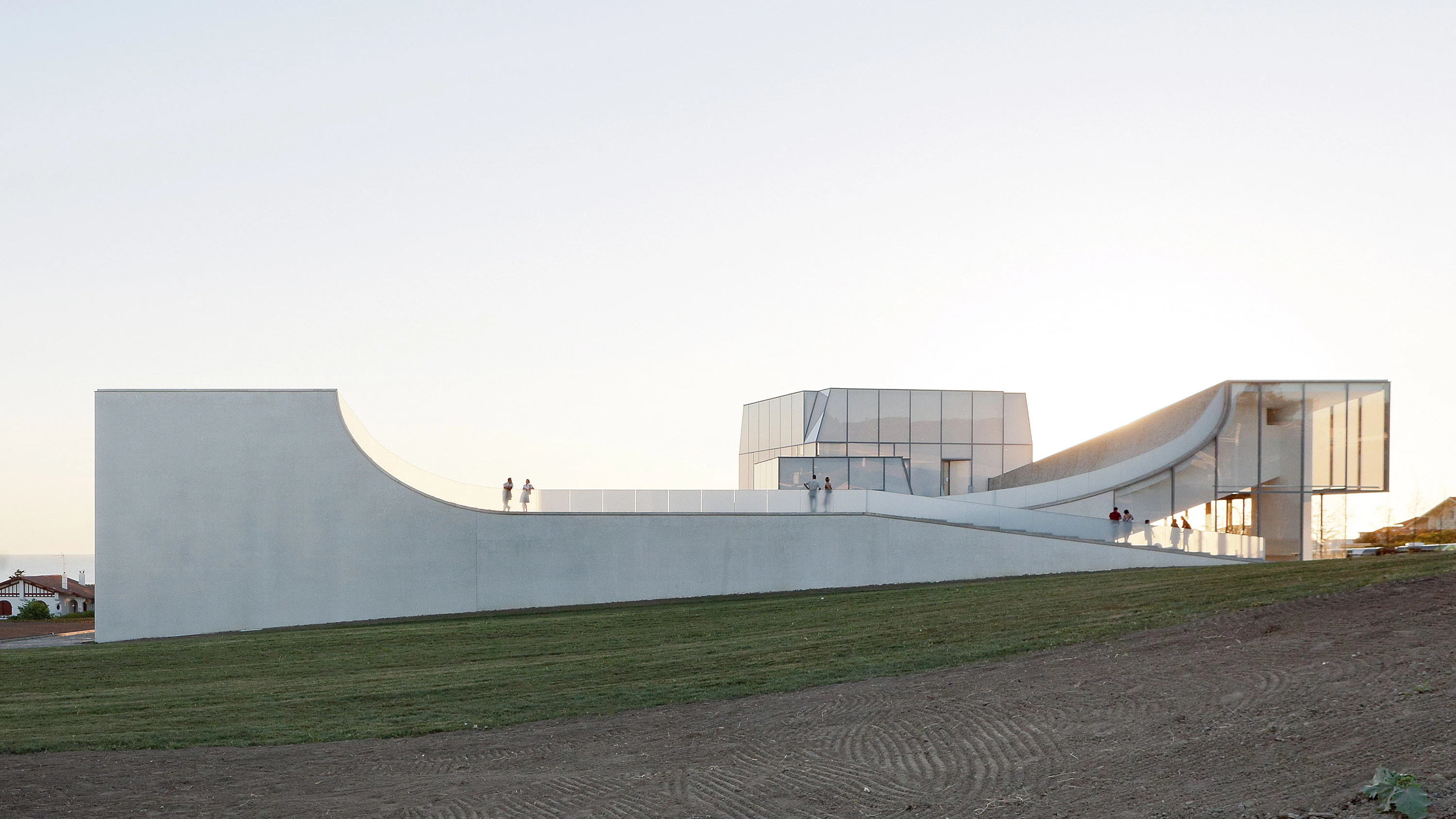 Dedicado al mar y al surf, este museo ubicado junto a la costa es el resultado de combinar dos geometrías opuestas y, a la vez, complementarias, la cóncava y la convexa. Ambas se vinculan a sendas metáforas: mientras que lo cóncavo sugiere la imagen de estar ‘bajo el cielo’ y define los espacios exteriores, lo convexo, delineado en el techo, expresa la idea de situarse ‘bajo el mar’ y caracteriza a las salas expositivas. Concavidad y convexidad son así el haz y el envés de una estructura topográfica construida con hormigón blanco y cuya cubierta se extiende hasta el paisaje tras generar una plaza que sirve para la celebración de eventos al aire libre. Descollando de la cornisa sinuosa del edificio emergen dos volúmenes que contrastan con el zócalo tanto por su geometría como por su materialidad. Se trata de volúmenes facetados y completamente vidriados, que albergan un restaurante y un quiosco para surfistas. Son como ‘rocas de cristal’ que resuenan visualmente con dos grandes rocas posadas sobre la playa y perceptibles desde la cubierta.