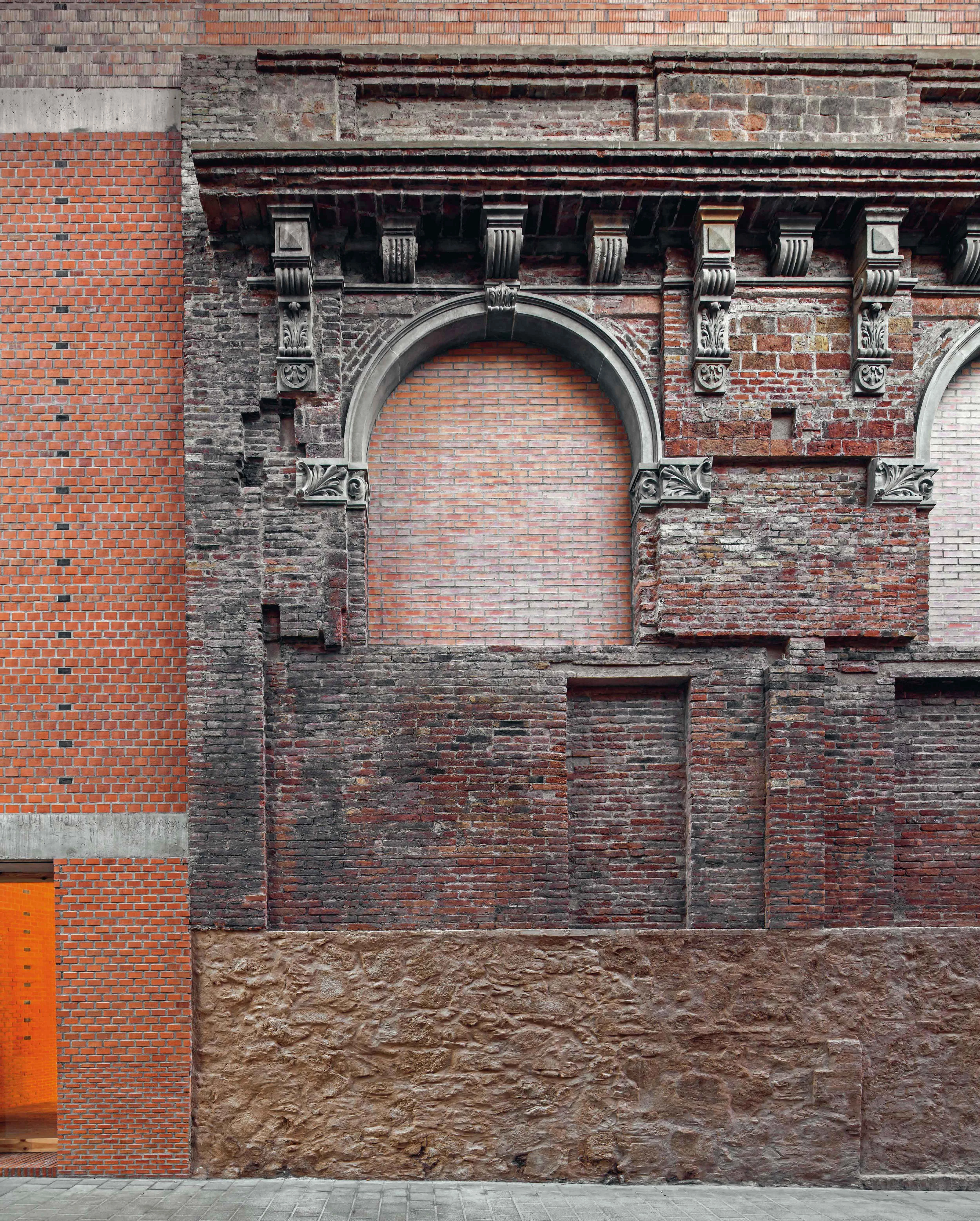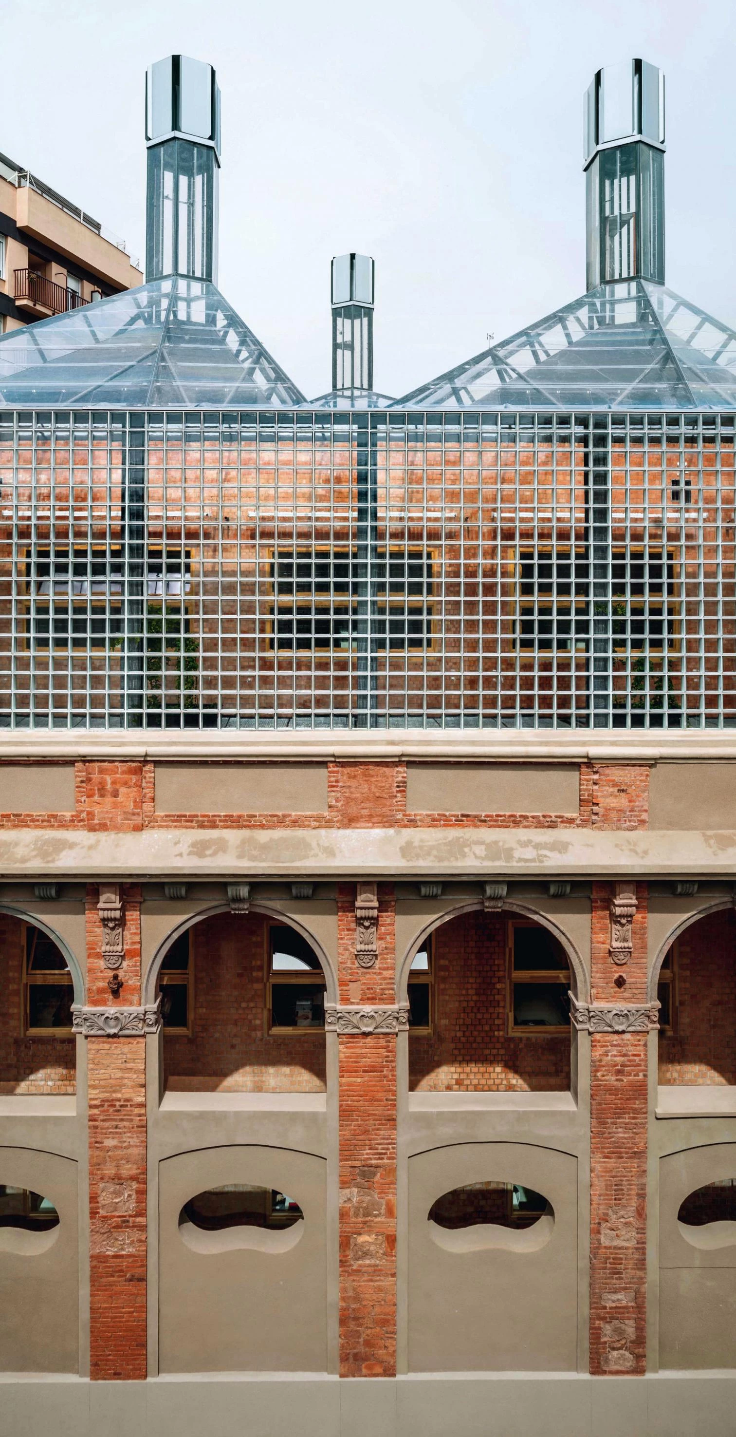El volumen resultante responde a la estricta geometría triangular del solar, por su potencia y por su función urbana. Su materialidad cerámica responde a la voluntad de poner en valor la fachada patrimonial integrándola y no singularizándola, usándola y no sacralizándola; por tanto se pone prácticamente en el mismo plano lo nuevo y lo viejo con materiales y técnicas similares y asumiendo en los dos casos obligaciones de cerramiento, de captación, de ventilación de cámaras y patios. La materialidad se compone a partir de razones estructurales y se complementa para mejorar las condiciones de luz de los patios y dotar la fachada de un material vinculado a la memoria de la cristalería. La utilización de bloque de vidrio macizo como parte del cerramiento murario permite introducir la luz en el patio norte y captarla en el patio sur.