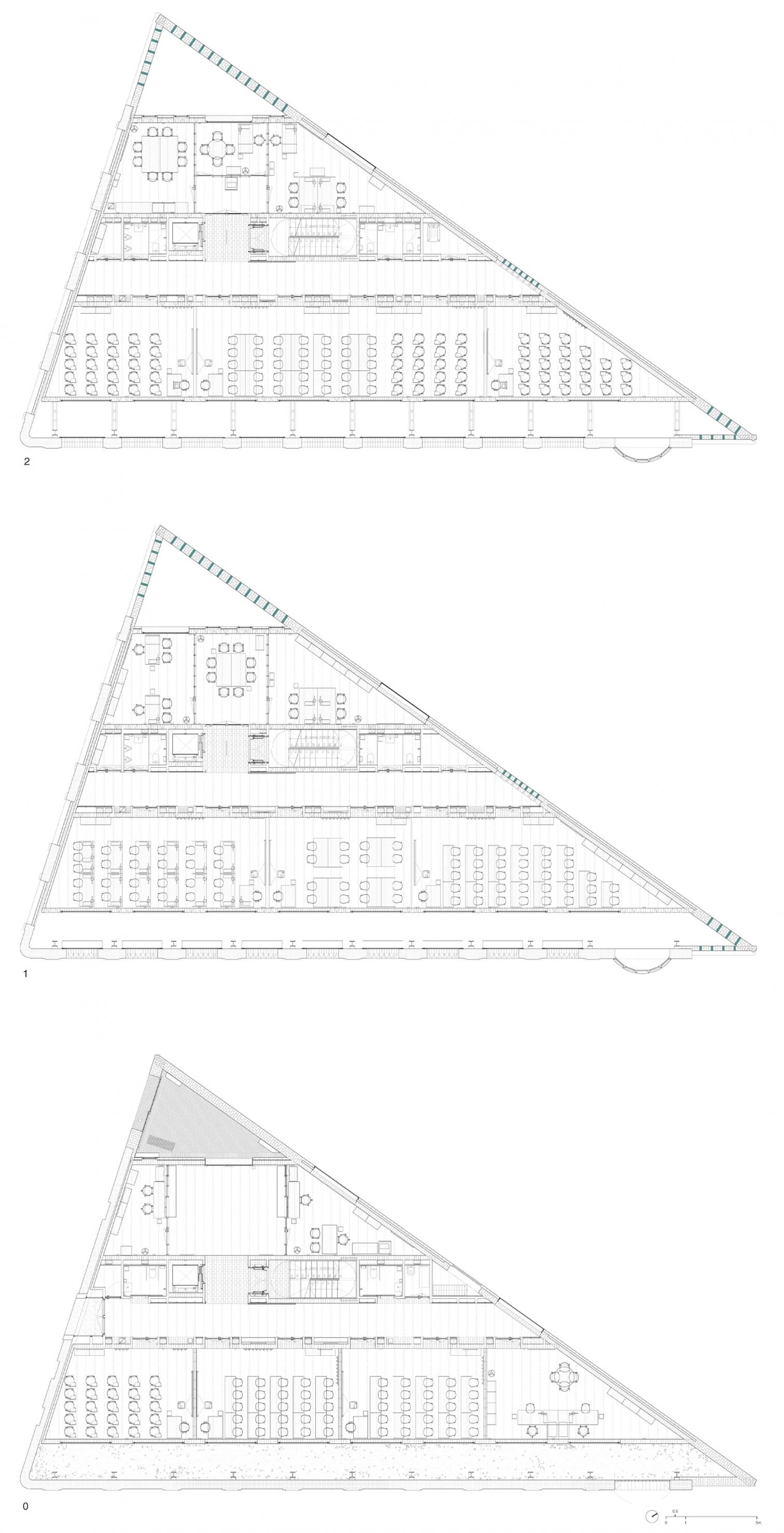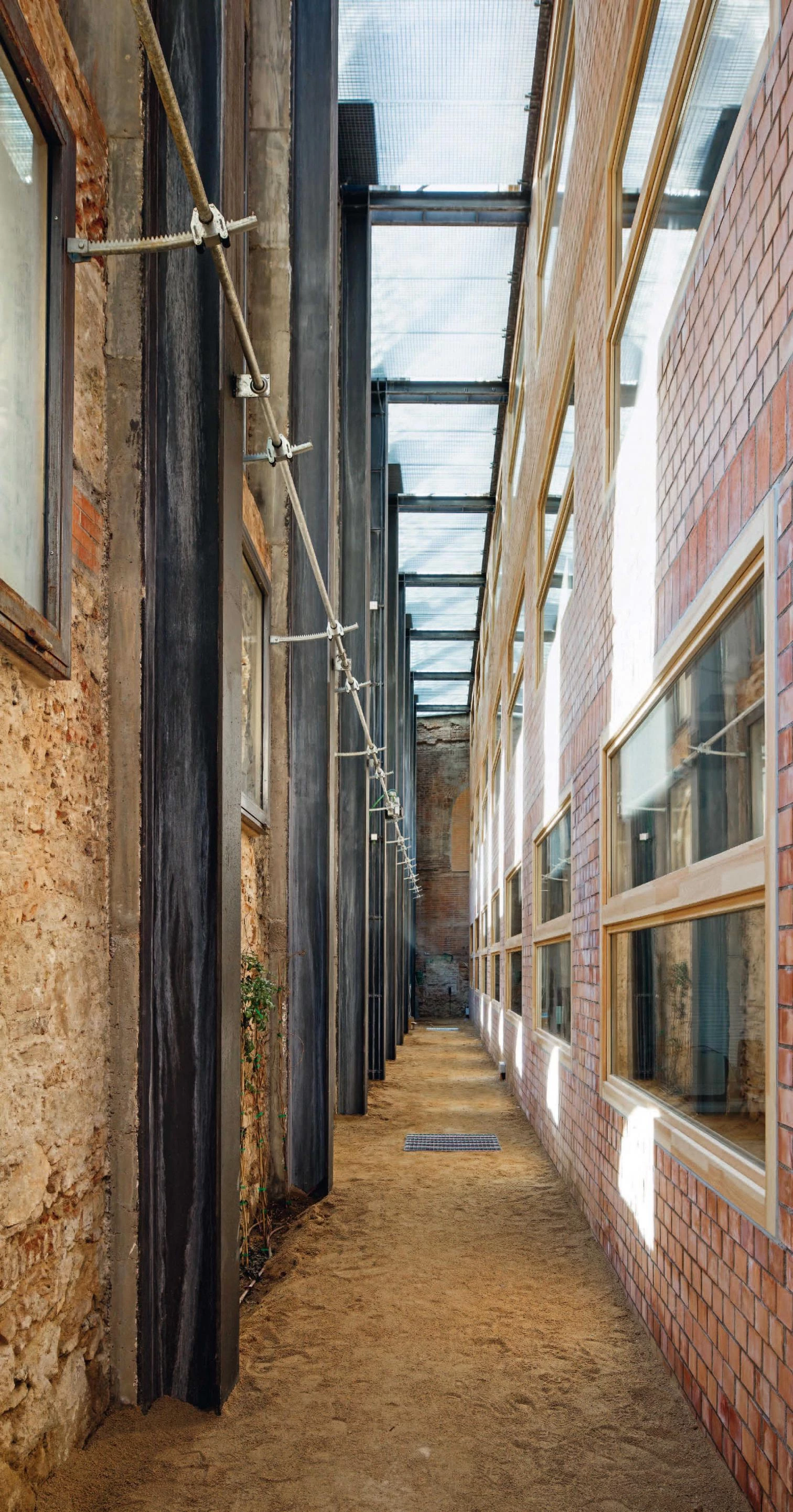 En un solar de estricta geometría triangular, el edificio se separa de la fachada protegida de la antigua cristalería y se abre a frescos patios interiores que están conectados a una batería de chimeneas solares.