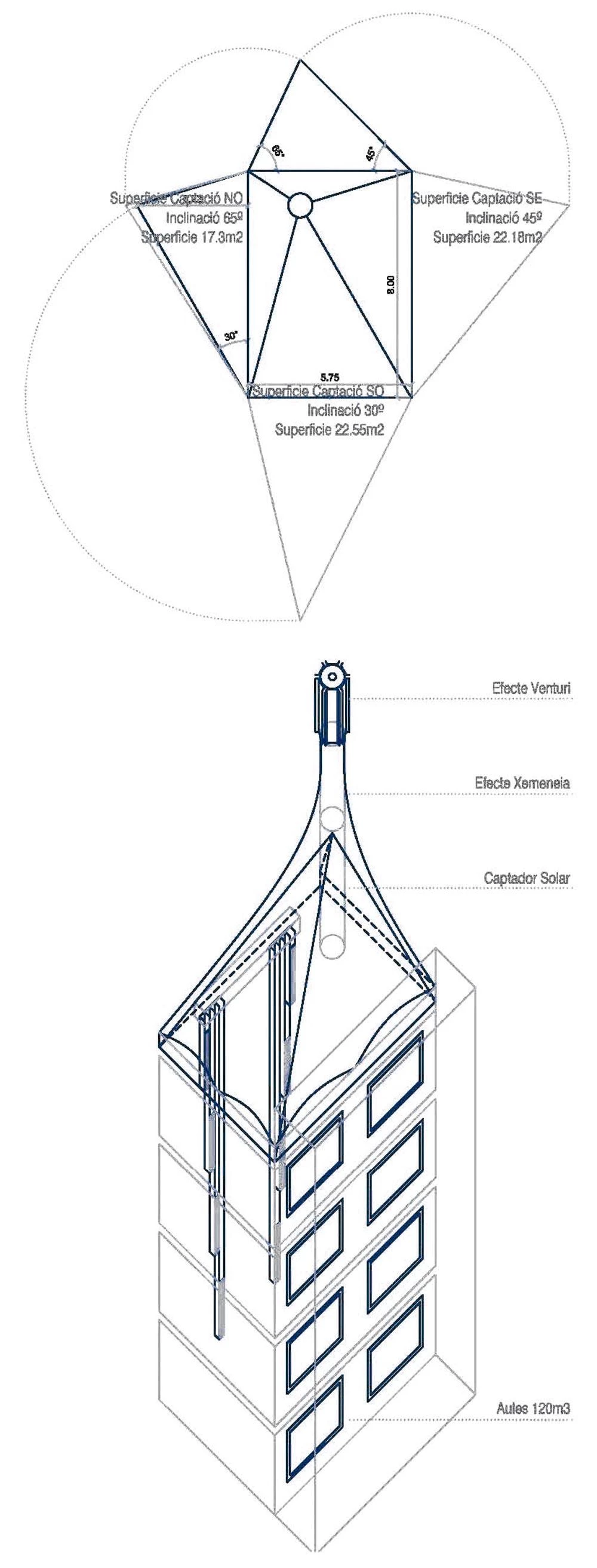 La sección del edificio explica su comportamiento basado en la cualificación y el movimiento del aire en condiciones naturales; en invierno es necesario controlar las pérdidas por renovación y amortizar la alta carga interna acumulada en la inercia de la estructura muraria y captar el aire limpio desde el patio que actúa como recuperador natural. En verano se trata de disipar moviendo el máximo volumen de aire posible y capturarlo desde los patios vegetados y sombríos. Los motores del movimiento de este aire serán estrictamente naturales a partir del uso de chimeneas solares y sombreros con efecto Venturi. La ventilación cruzada entre patios queda descartada por programa y para evitar conflictos acústicos, por tanto se dota cada franja de espacios de uso con una larga interrupción estructural por donde el aire circulará en vertical ‘estirado’ por la potencia del sol en las chimeneas, que a la vez otorgan al edificio una silueta y una materialidad transparente y característica.