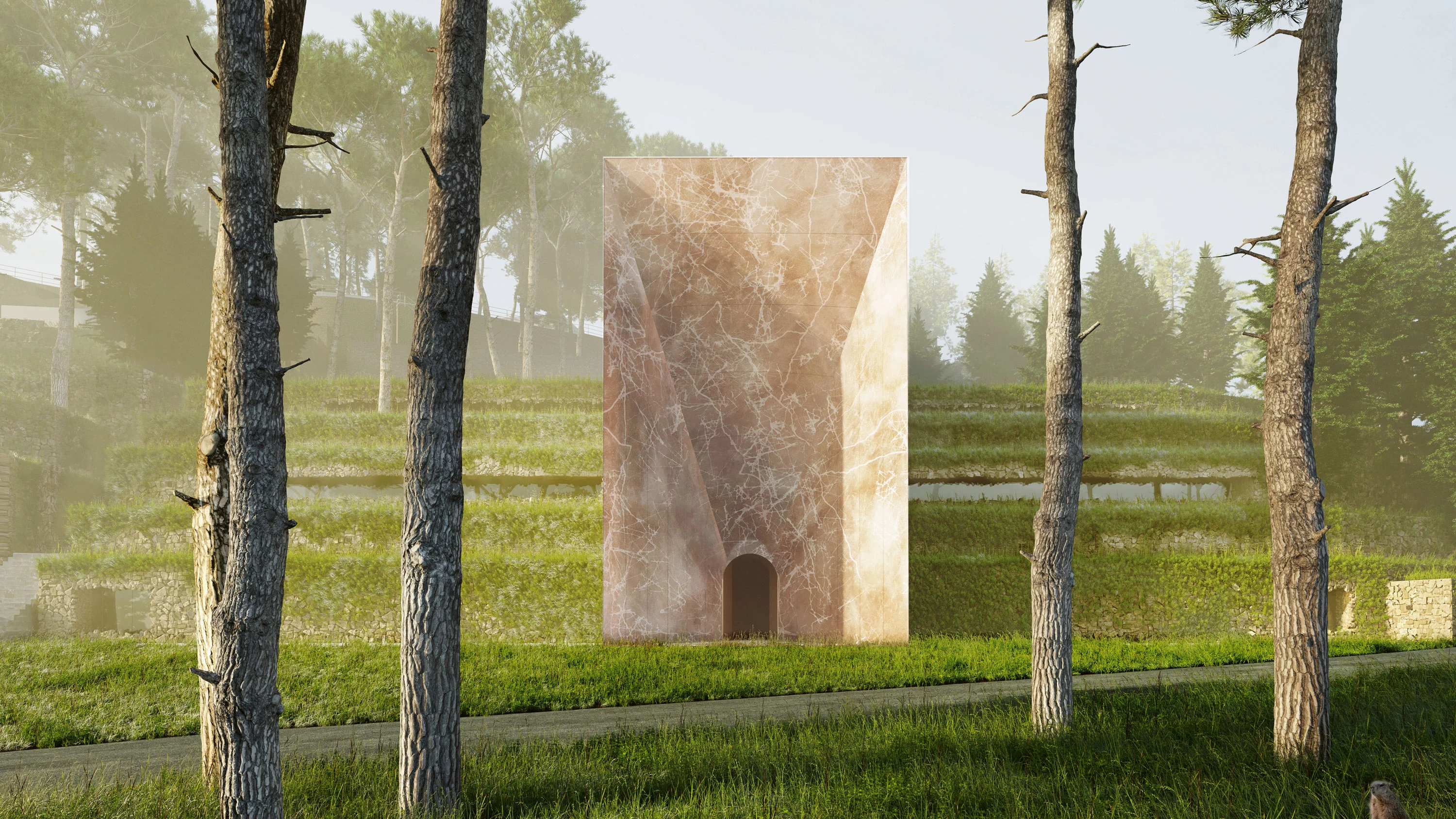 Un volumen monumental de mármol se incrusta en el terreno, aprovechando su escalonada topografía, para engrandecer el acceso a las galerías enterradas del museo. Este mismo cuerpo sirve como plataforma exterior transitable desde la que contemplar el paisaje...[+]