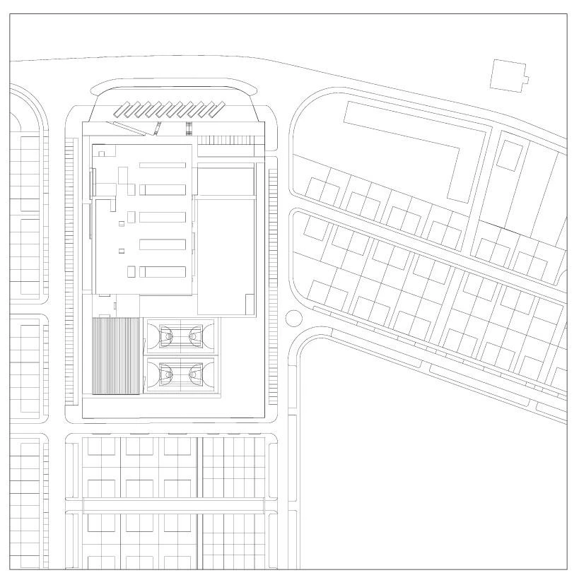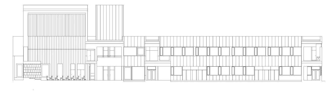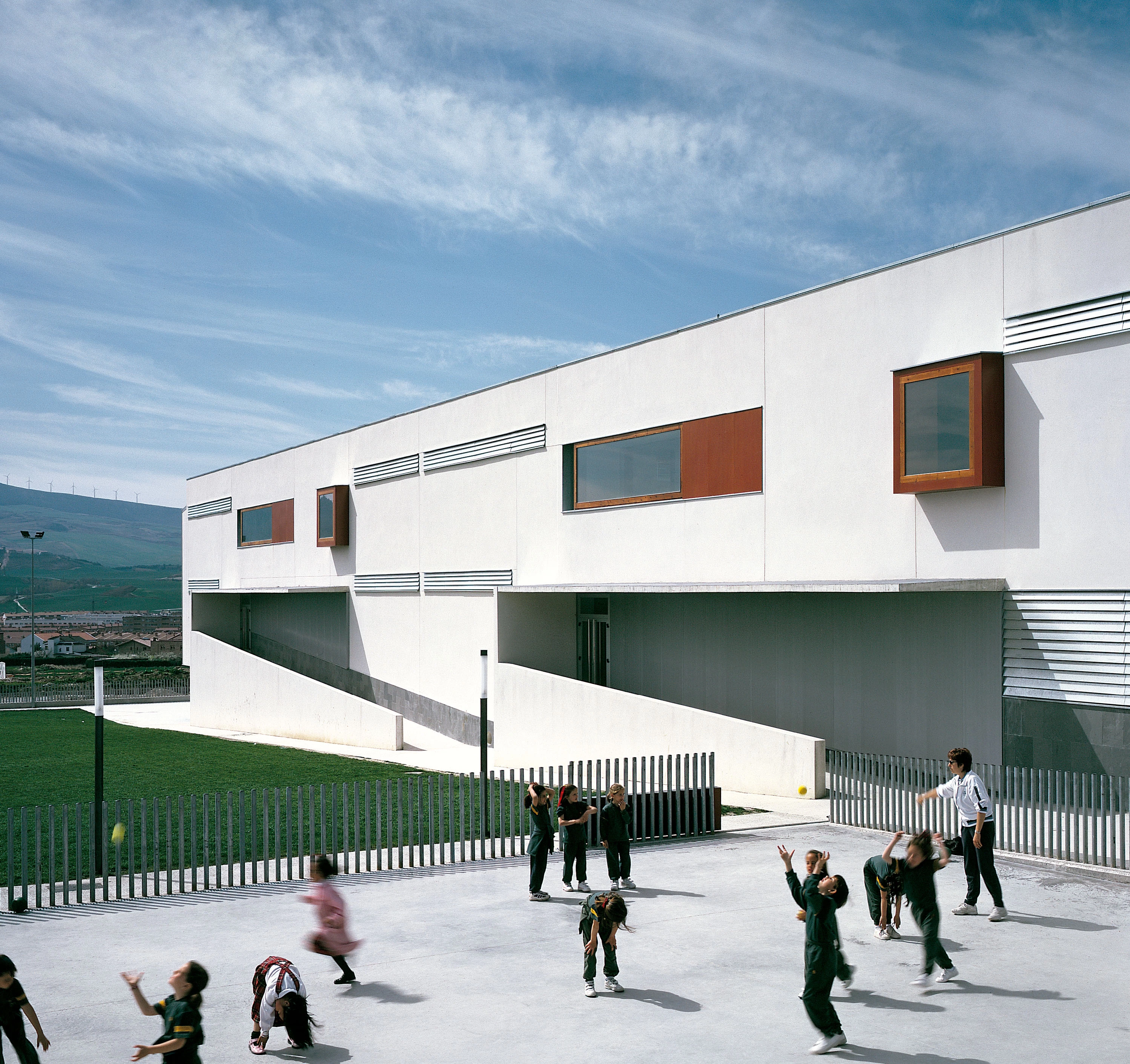 La proporción apaisada del conjunto tiene su correlato en las ventanas rasgadas en los muros laterales de la pieza de aulas, así como en la sutil hendidura que discurre a media altura en la fachada del polideportivo. Como una prolongación de la línea de cornisa del colegio, esta delgada muesca introduce en la cancha una fina línea de luz. Por su parte, amplios ventanales continuos, perfilados en el revestimiento de paneles de chapa metálica, atrapan la luz para los espacios de estudio en la cara oeste. Al este, dos rampas vinculan los patios a las zonas de juego exteriores; junto con ellas, la composición de la fachada, donde alternan huecos de distintas proporciones, lamas blancas y carpinterías de madera roja proporciona un telón de fondo dinámico a las actividades recreativas de los alumnos.