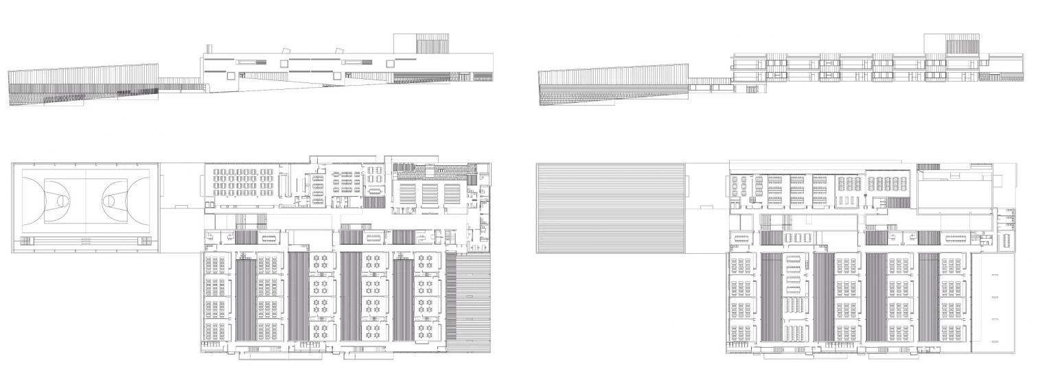 Vinculados visualmente por la línea horizontal de sus huecos, los prismas con las aulas y el polideportivo colonizan la ladera en función de sus necesidades programáticas y para crear un sistema integrado de espacios exteriores.