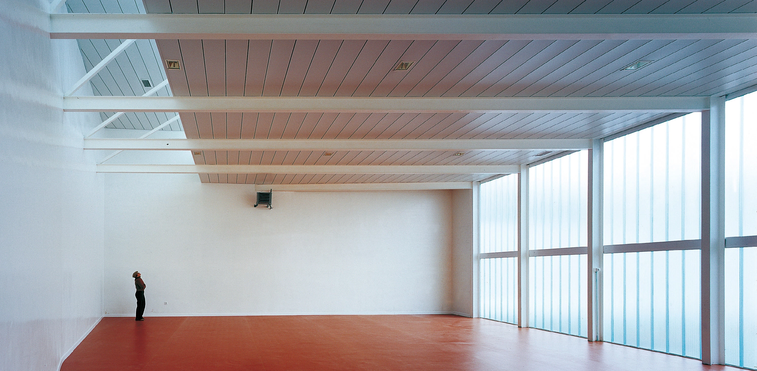 Agrupadas en un ala de una sola planta, las tres aulas de educación infantil cuentan con un amplio pasillo que sirve de zona de juego cuando llueve. En perpendicular a esta pieza, un cuerpo de dos alturas alberga en planta baja la biblioteca, el salón de actos y la administración, y en el piso superior las aulas de primaria, la de informática y otros espacios para pequeños grupos. Una rampa vincula ambos niveles en la fachada norte, separando las clases de la calle. El gimnasio flanquea el patio por el extremo opues-to al ala infantil, con un acceso independiente que permite su uso en días festivos.