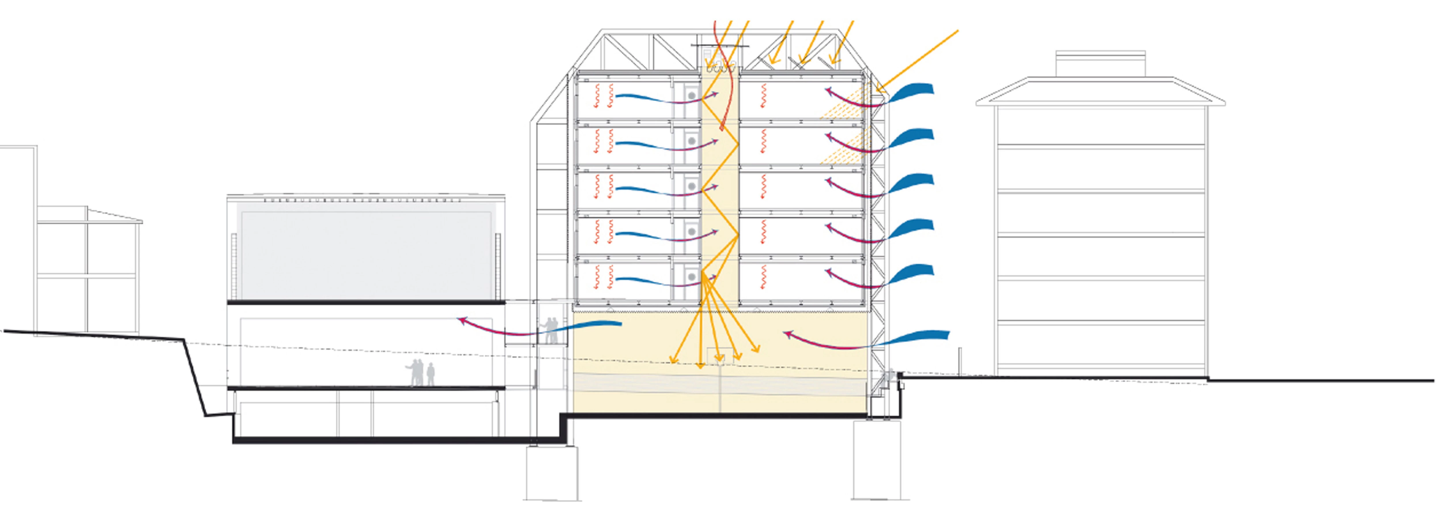 El proyecto está pensado en su totalidad para conseguir el mínimo consumo en climatización y en renovación del aire interior. La vegetación juega un papel importante en la calidad del aire y coopera con las instalaciones necesarias para reducir la contaminación. Se ha optado por sistemas radiantes de climatización como solución que proporciona un mayor confort y transferencia térmica. La ubicación del edificio permite reestructurar el funcionamiento general del colegio y diferenciar claramente un acceso para el alumnado de segundo ciclo, así como dotarlo de servicios extraescolares sin interferir con los horarios y el funcionamiento escolar y de la comunidad religiosa.