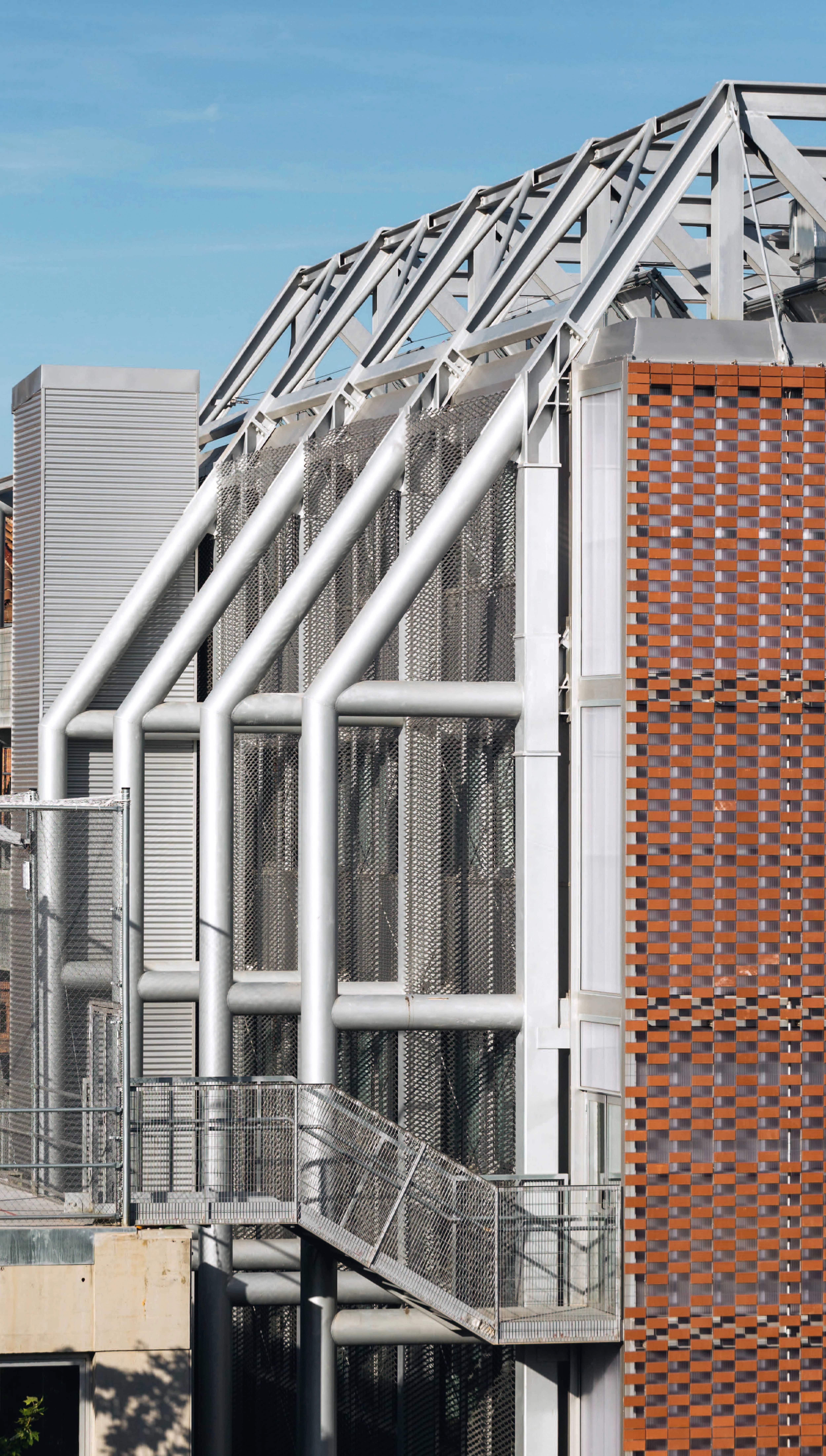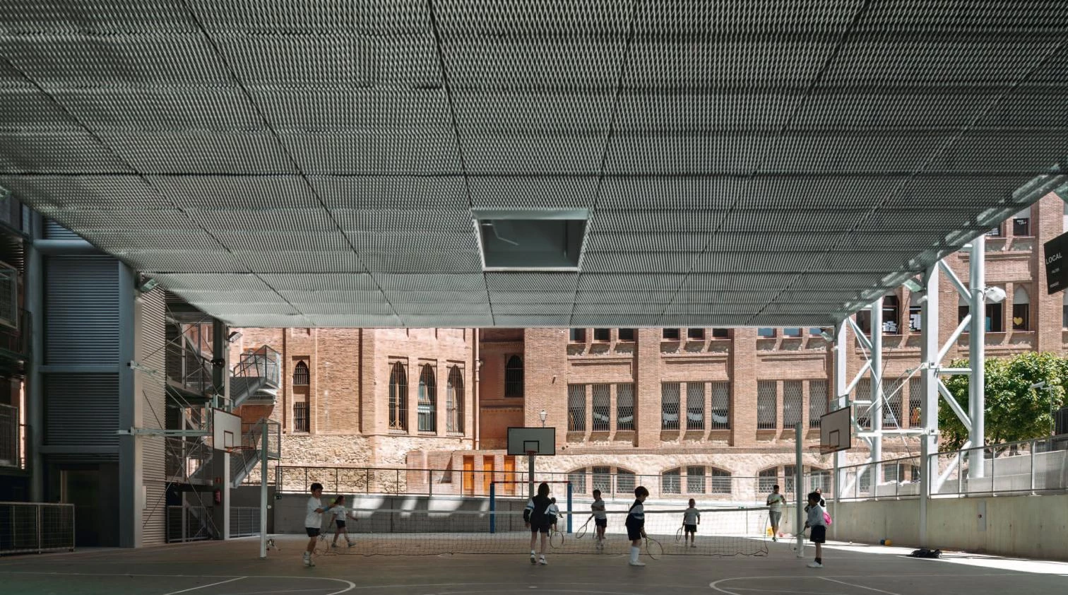 Para responder al reto que suponía construir un edificio de nueva planta en un entorno tan singular, se decide ubicar la ampliación en el lugar más adecuado para no afectar a la visibilidad del construido por Gaudí. Así, el nuevo volumen respeta la altura y distancias de los edificios colindantes y se liga funcionalmente al pabellón deportivo existente. El proyecto buscaba además un edificio que hablara de su tiempo, sin dar la espalda a las texturas propias del histórico, y así se opta por una fachada tejida cerámica que hace de gran celosía hacia la calle, y elementos ligeros y luminosos hacia el interior de la escuela. Esta doble piel que tamiza térmica y lumínicamente el interior otorga libertad y flexibilidad para la distribución de las ventanas y los elementos opacos necesarios funcionalmente.