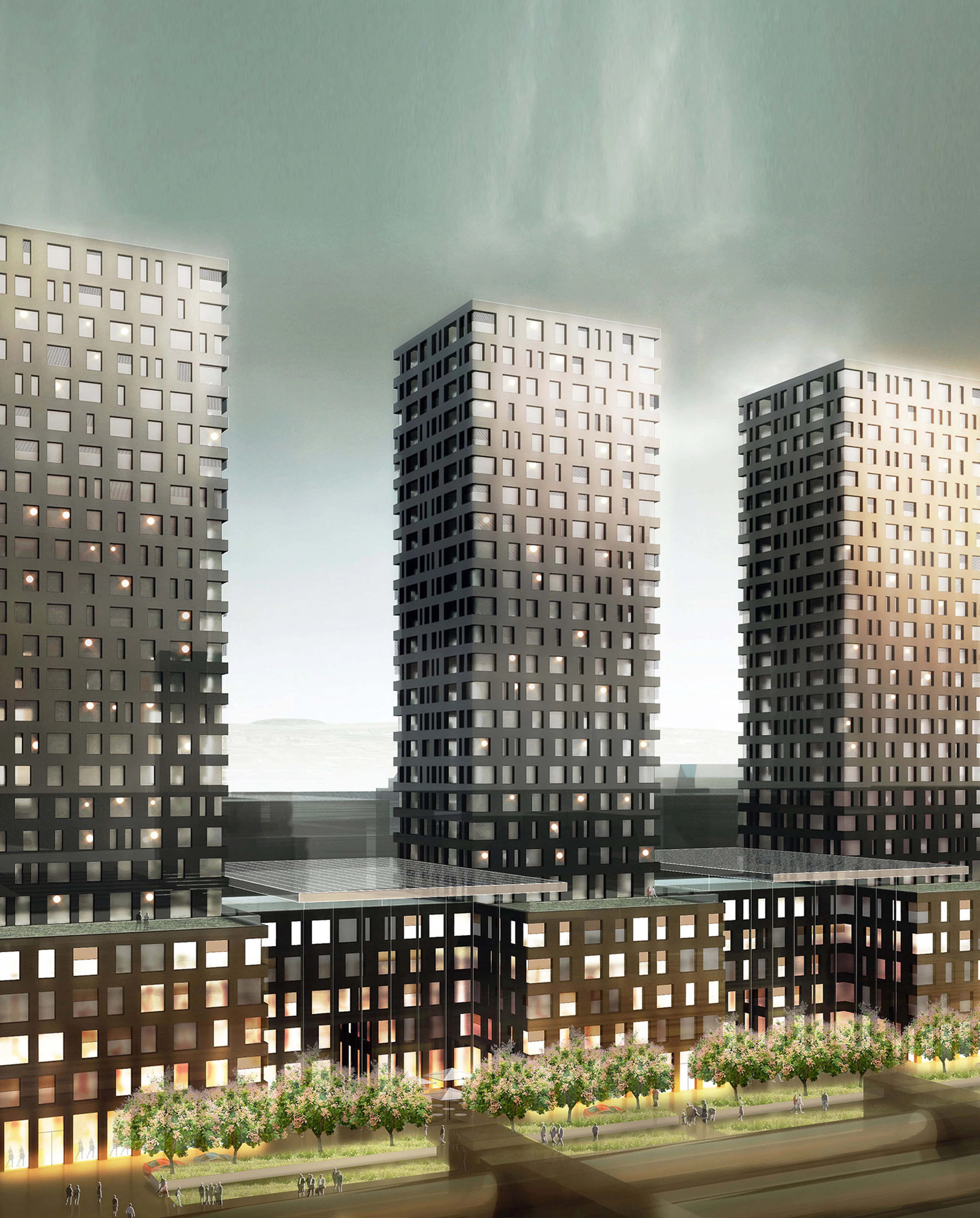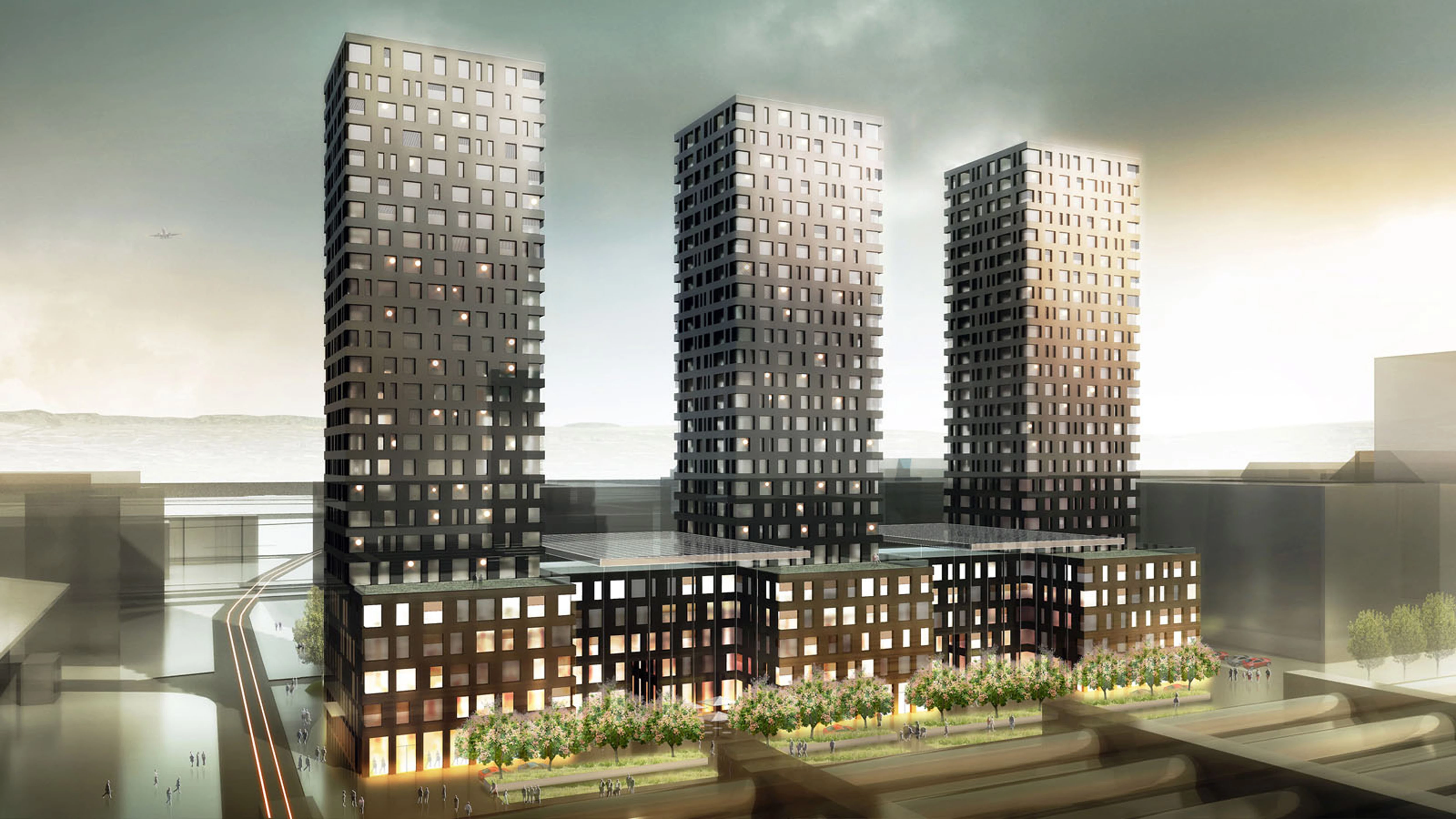 Situado entre la estación de Zürich-Altstetten y el futuro estadio, las vías del ferrocarril y la autopista, el edificio, de 37.205 m² construidos, consta de un zócalo de cinco plantas con oficinas y tres torres de idéntica geometría con 300 apartamentos... [+]