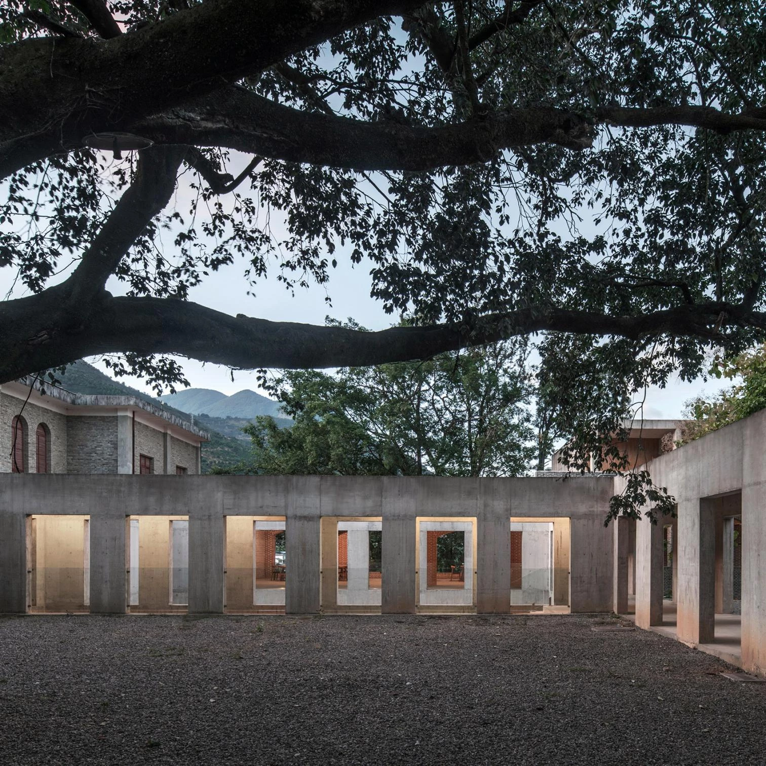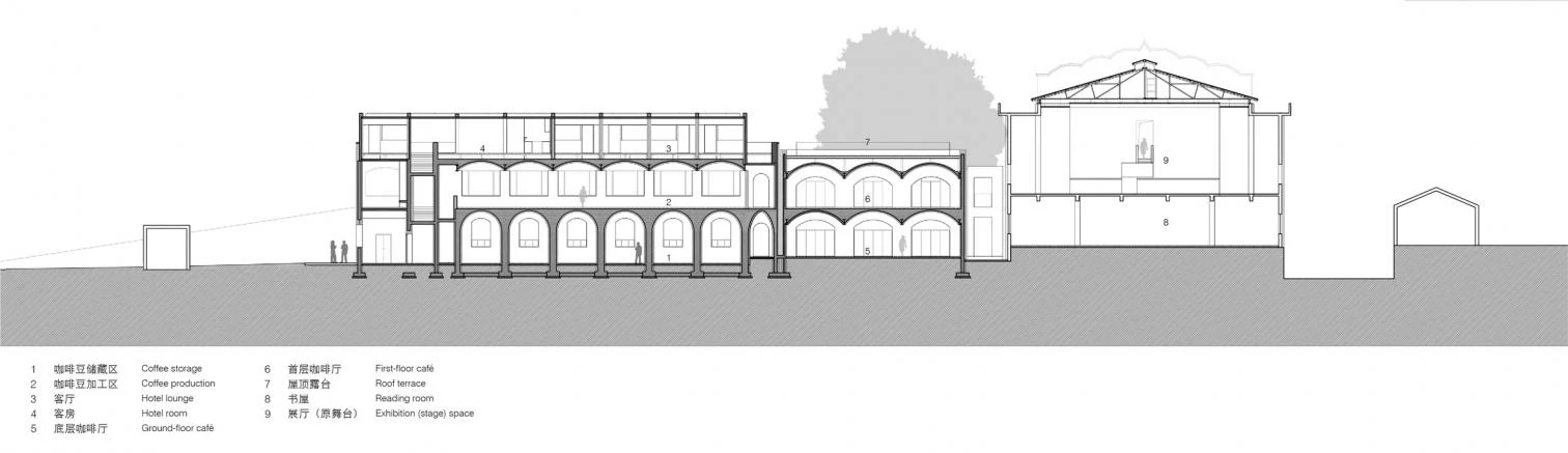 Dirigida por Hua Li, la firma de Pekín Trace Architecture Office (TAO) ha sido la encargada de transformar, renovar y ampliar un conjunto de edificios que albergan una planta de procesamiento de café y un hotel, situados en la provincia china de Yunnan, conocida por su cultivo de cafetos. Las construcciones de ladrillo de tradición local incluyen bóvedas como las de la planta baja utilizada para almacenar el café, que responde a los requisitos de temperatura y humedad constantes por sus dimensiones y el grosor de los muros. Para unir los edificios existentes, el estudio TAO agregó dos patios rodeados por galerías cubiertas de hormigón. En una futura fase de rehabilitación, un antiguo cine abandonado en la década de 1980 será convertido en un museo del café.