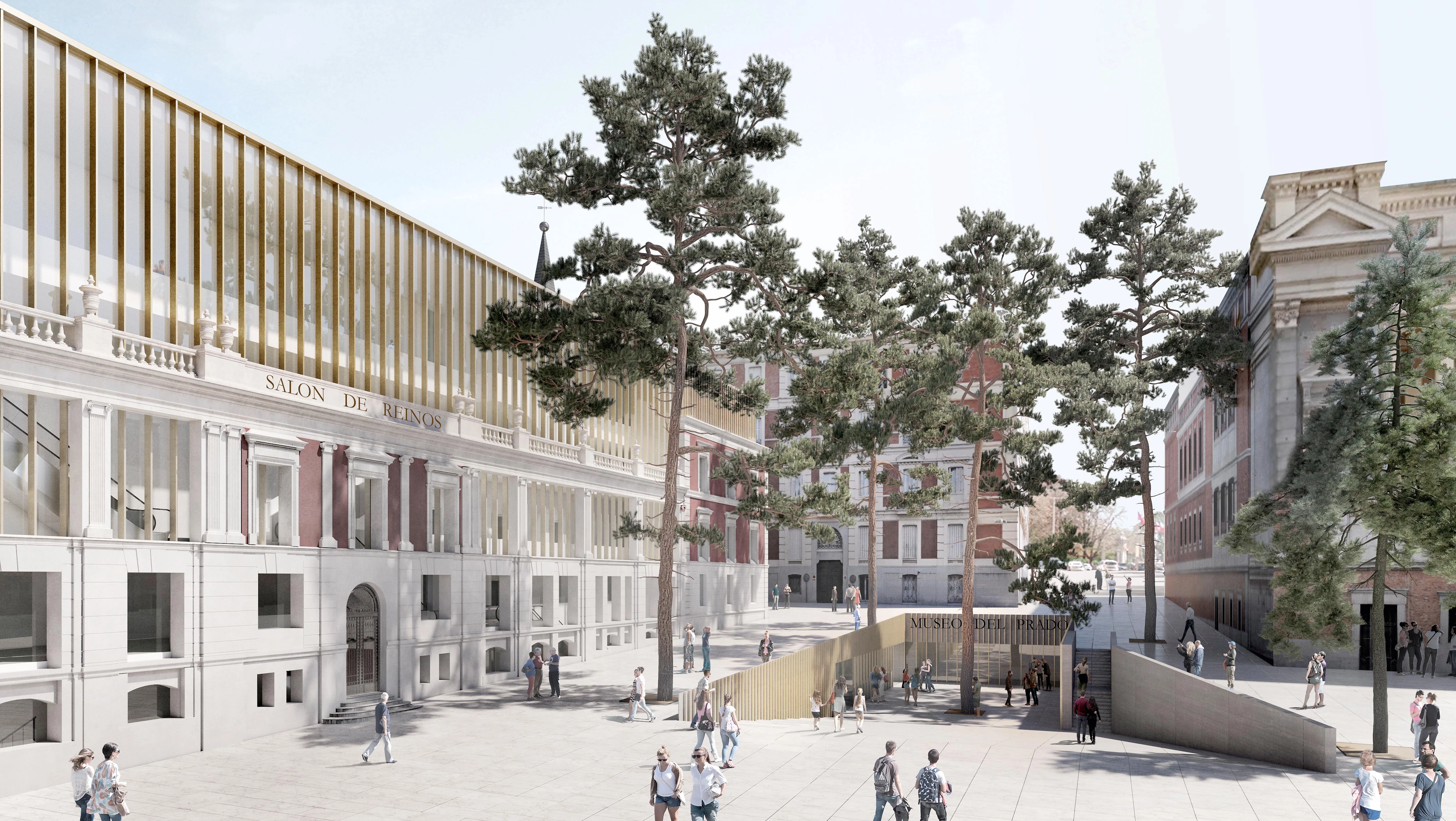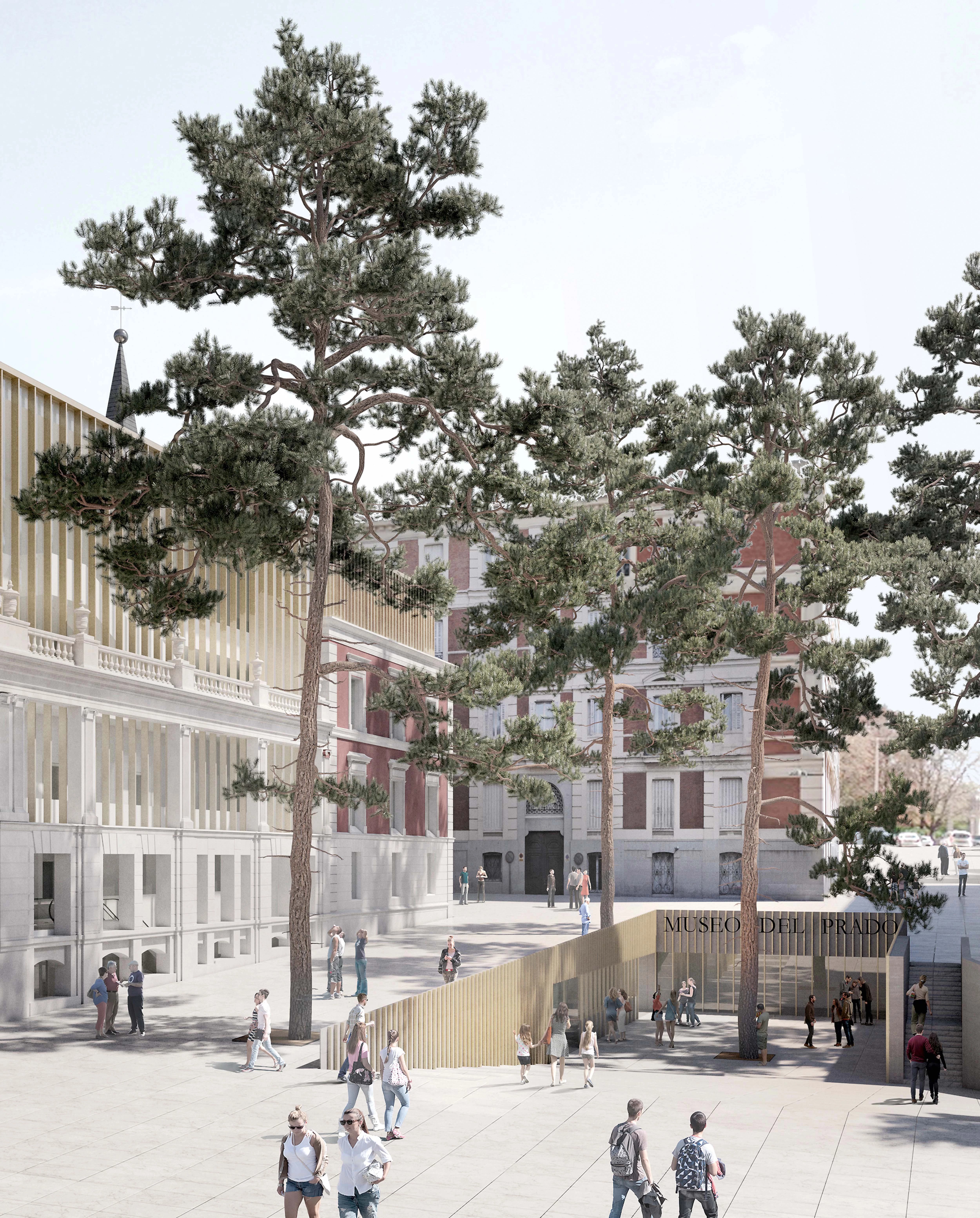 Se propone dividir el campus del Prado en dos ámbitos: el correspondiente al Edificio Villanueva y al claustro de los Jerónimos, por un lado; y el del Casón del Buen Retiro y el antiguo Salón de Reinos, por el otro. Para conectar los dos edificios que conforman este último ambito, se crea un acceso en rampa desde la actual calle Felipe iv, aprovechando la pendiente favorable; un acceso independiente que permite mantener prácticamente intacta la volumetría del edificio preexistente —salvo la cubierta— y que hace innecesario, por otro lado, modificar los antiguos accesos al edificio.