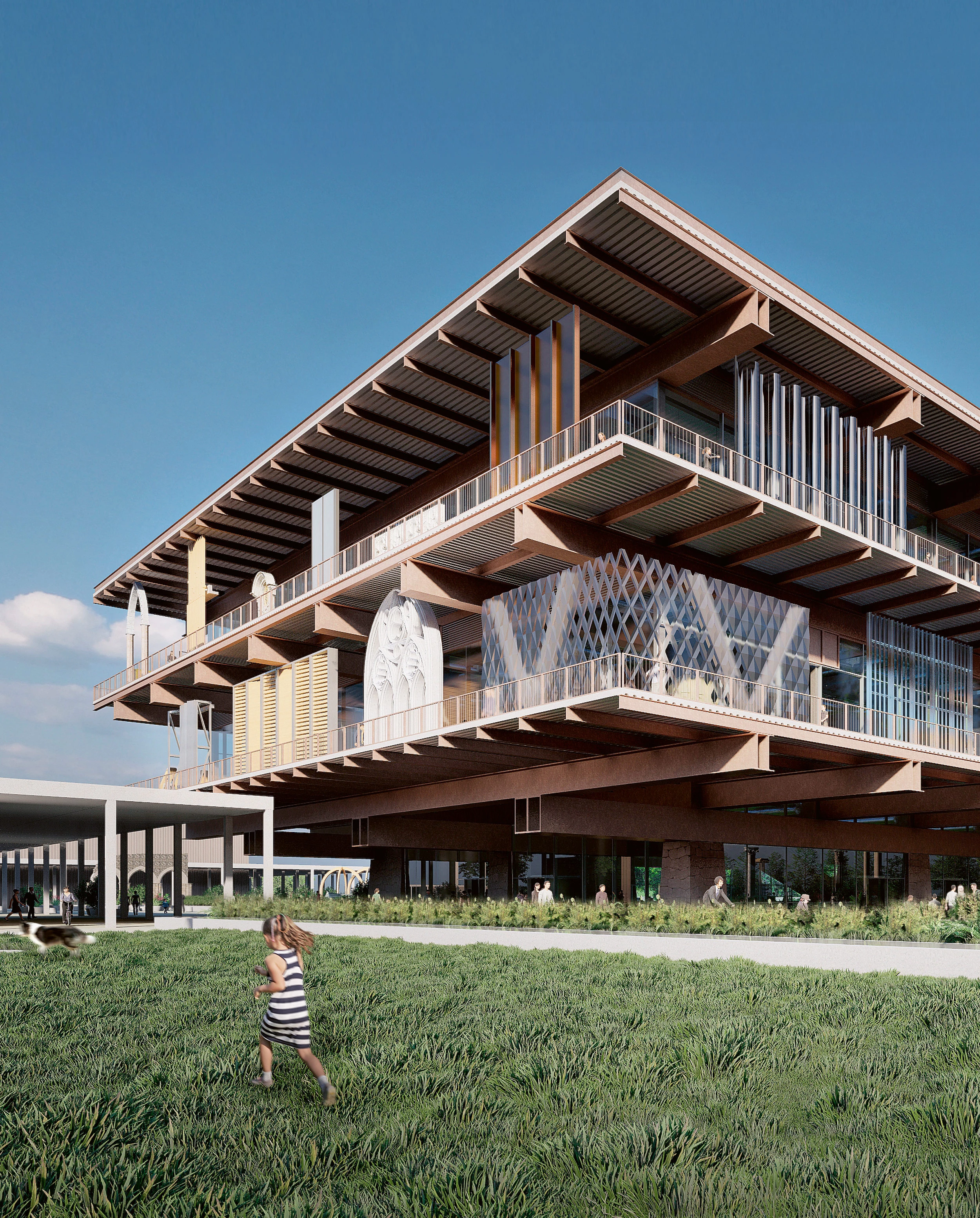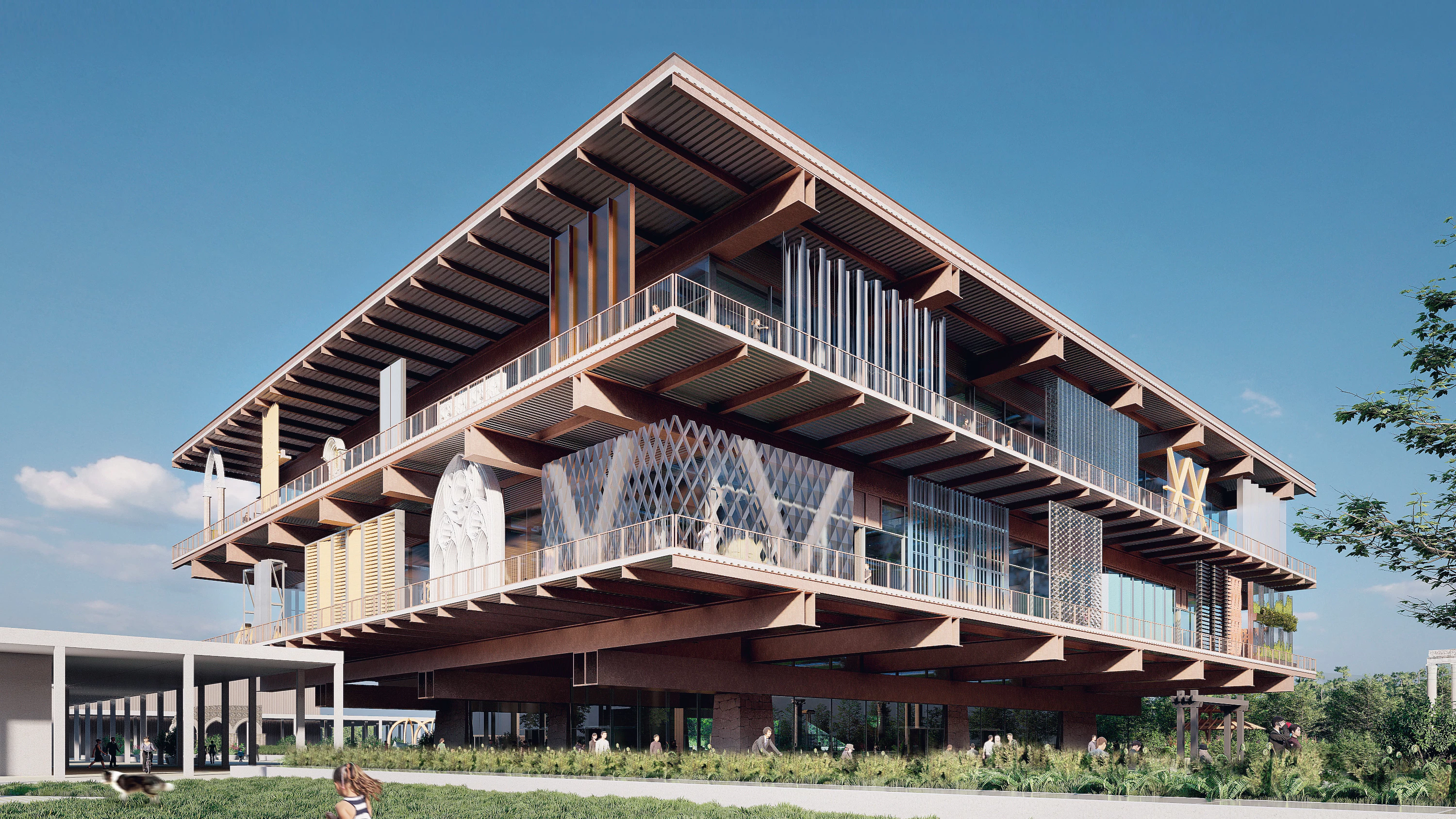 La propuesta incorpora elementos del estilo arquitectónico tradicional de Corea del Sur con cubiertas en voladizo escalonadas. El diseño garantiza la disponibilidad de los recursos materiales del edificio al final de su ciclo de vida.