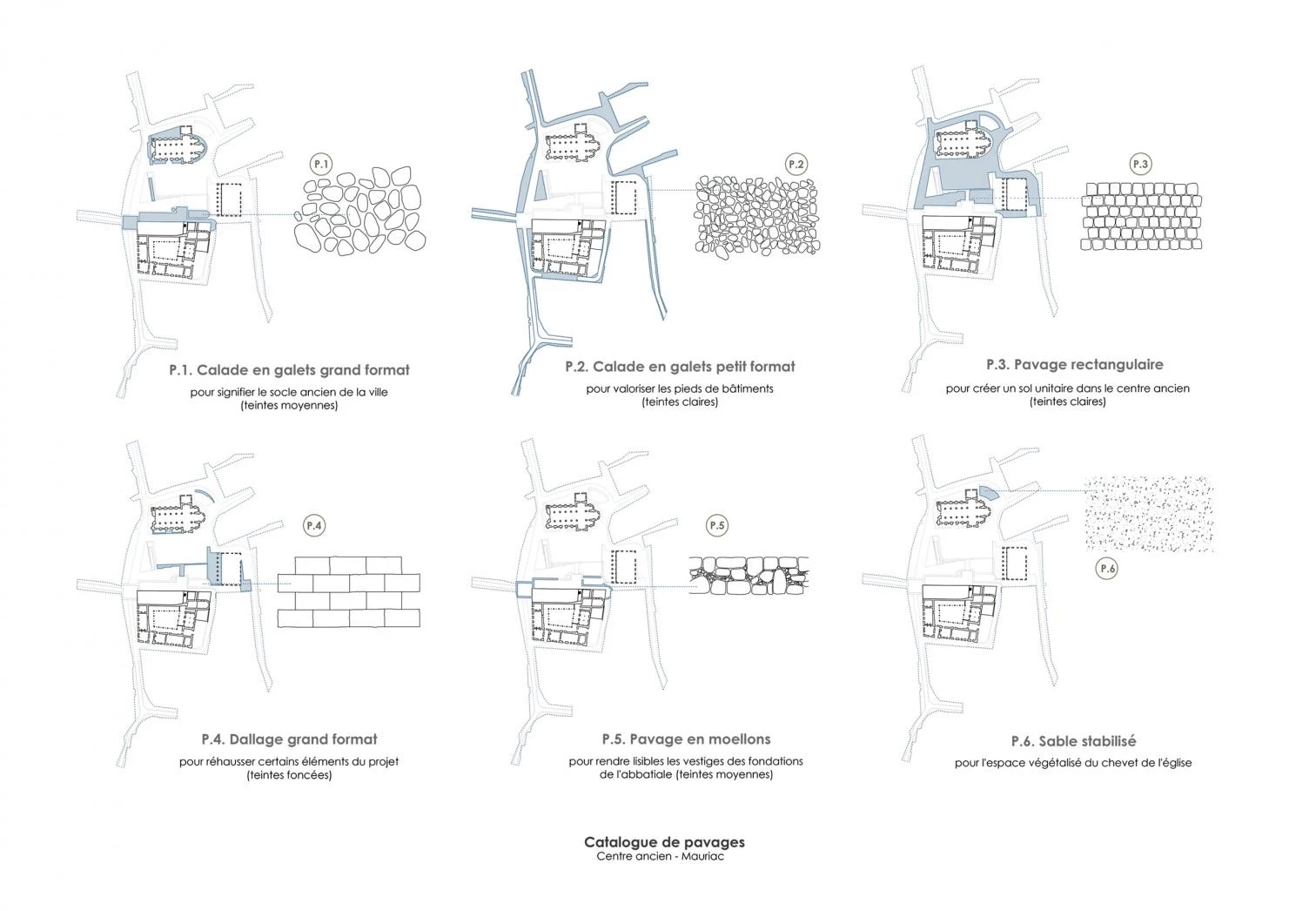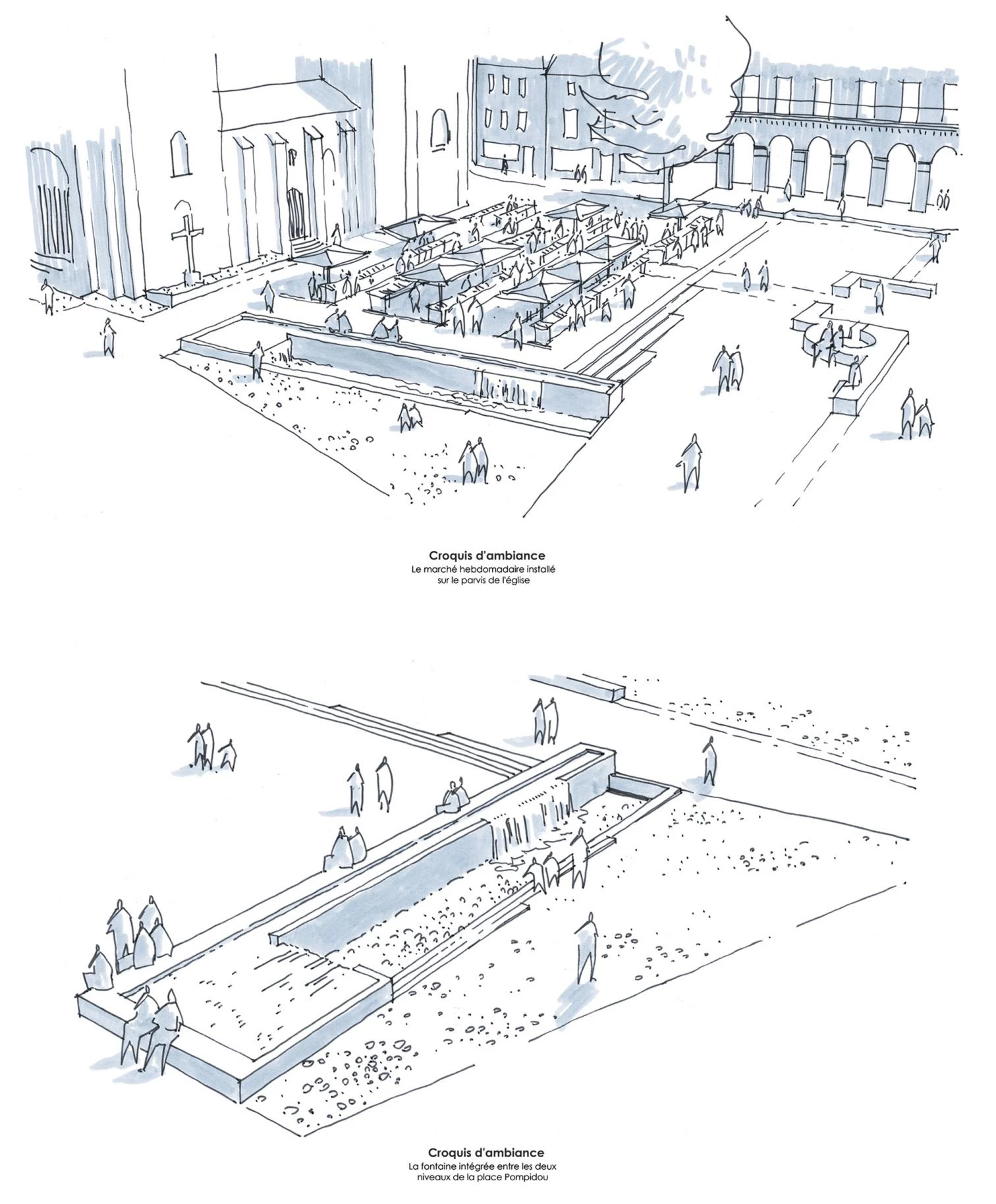 El proyecto trata de poner en valor los elementos que constituyen la historia del lugar: muestra la traza de las ruinas de la iglesia del antiguo monasterio medieval de San Pedro, situadas bajo la plaza Georges Pompidou, la cual se articula en dos niveles y donde se introduce una fuente que rememora la existencia de una anterior. Los nuevos pavimentos contribuyen a articular el solapamiento de las diferentes etapas de construcción del conjunto, combinando los inspirados en los calade de origen medieval con las grandes losas de tradición neoclásica.