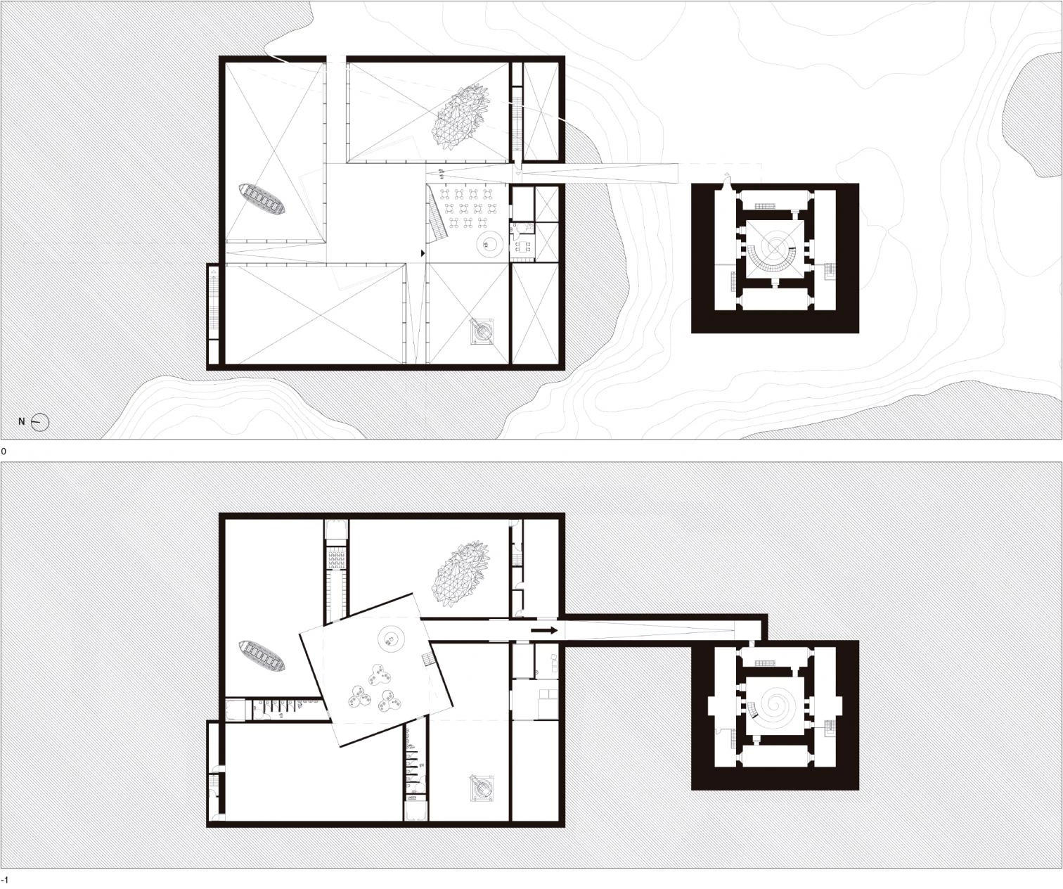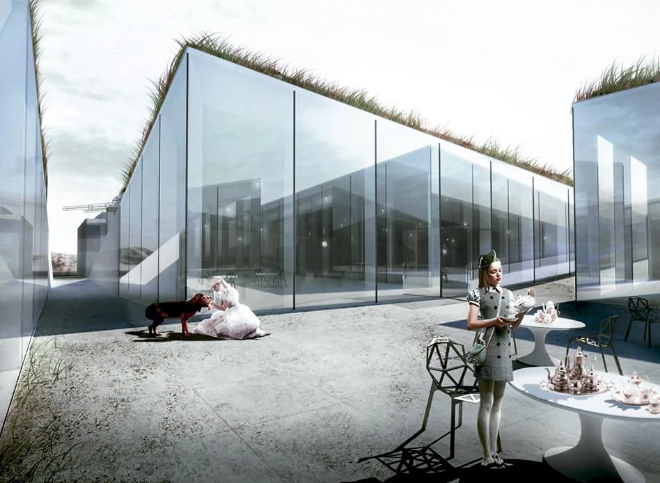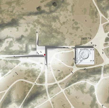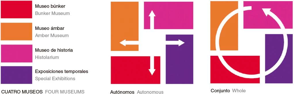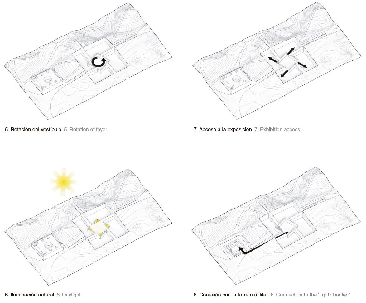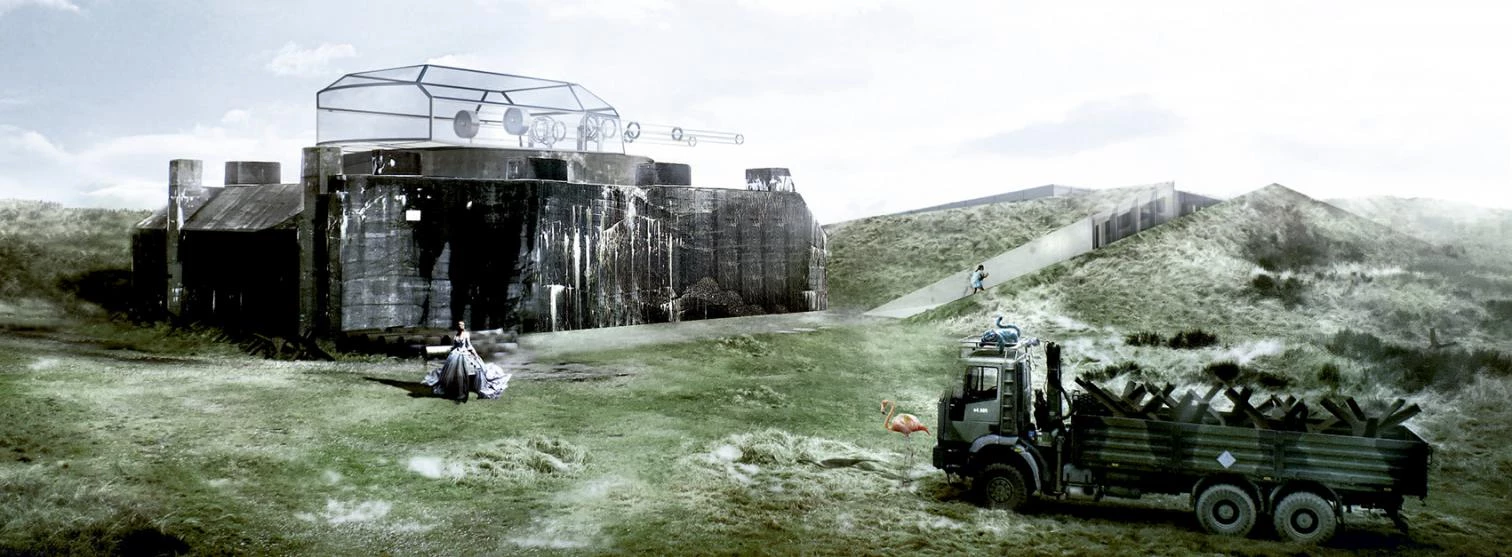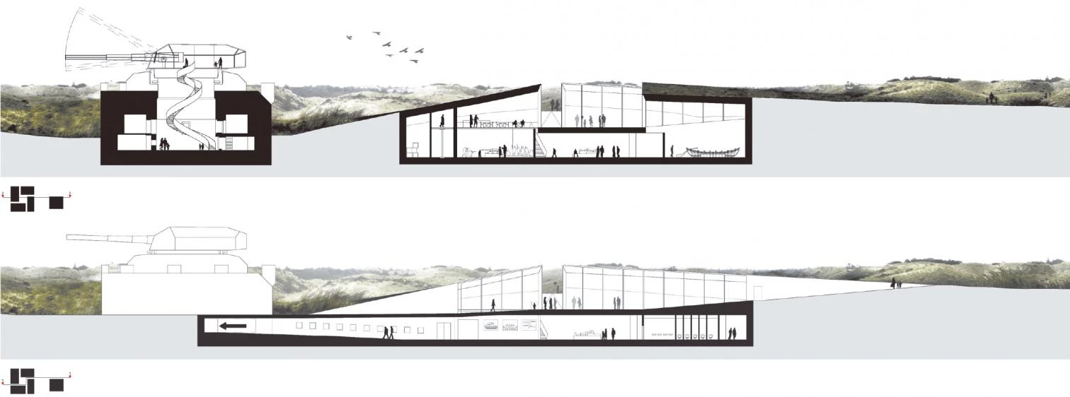 Cuatro incisiones en el terreno, que conectan con la red de senderos existentes en la reserva, generan el acceso al museo a través de un patio central entre los volúmenes. Los cuatro espacios se conciben como cajas semienterradas construidas con muros de contención de hormigón en tres de sus lados y en el cuarto con paredes de vidrio ligeramente inclinadas para permitir la entrada de luz a los espacios interiores. En la parte más elevada del búnker existente —conectado con el museo a través de un túnel subterráneo—, una recreación en vidrio de la antigua torreta militar funciona como un mirador sobre el Mar del Norte.