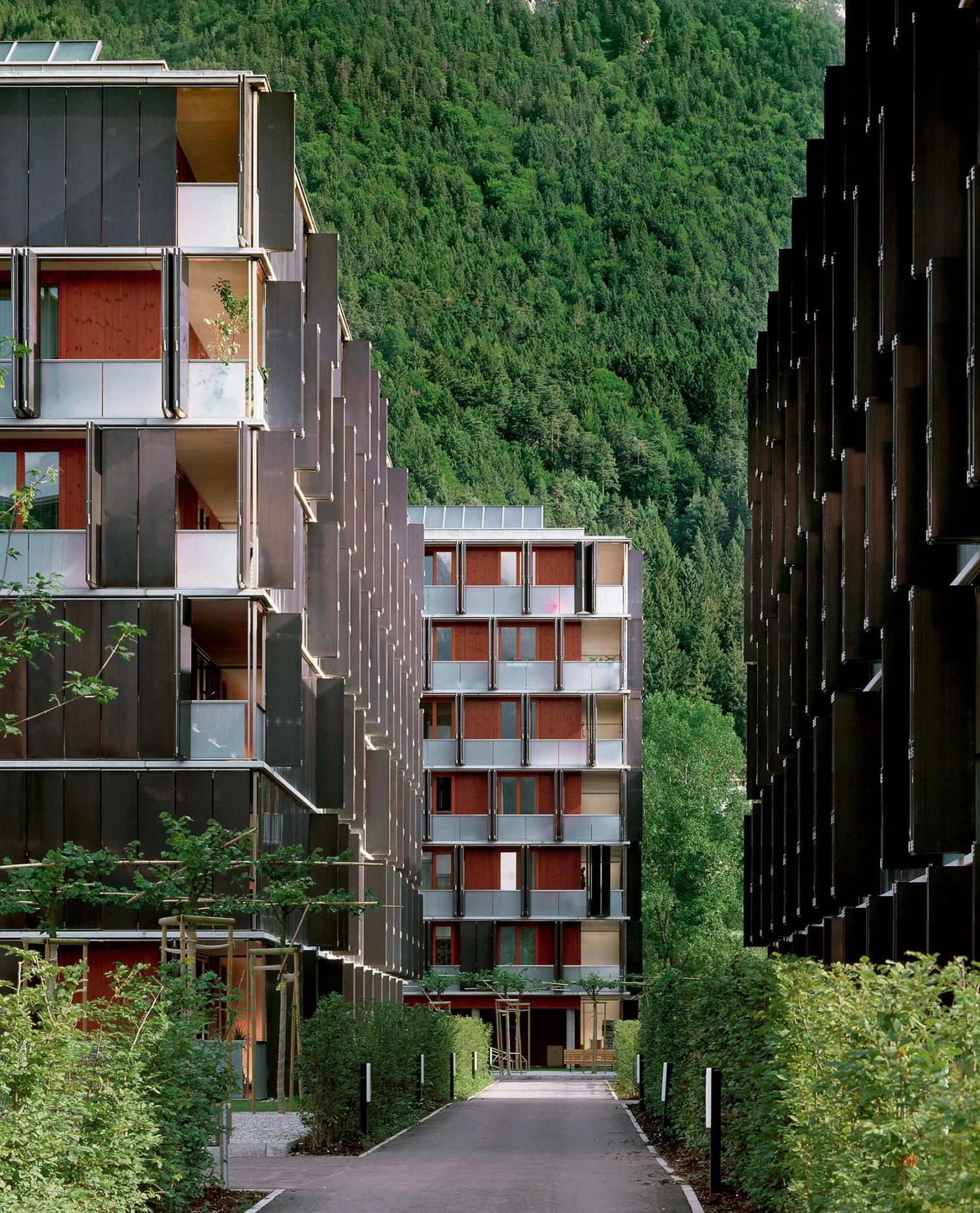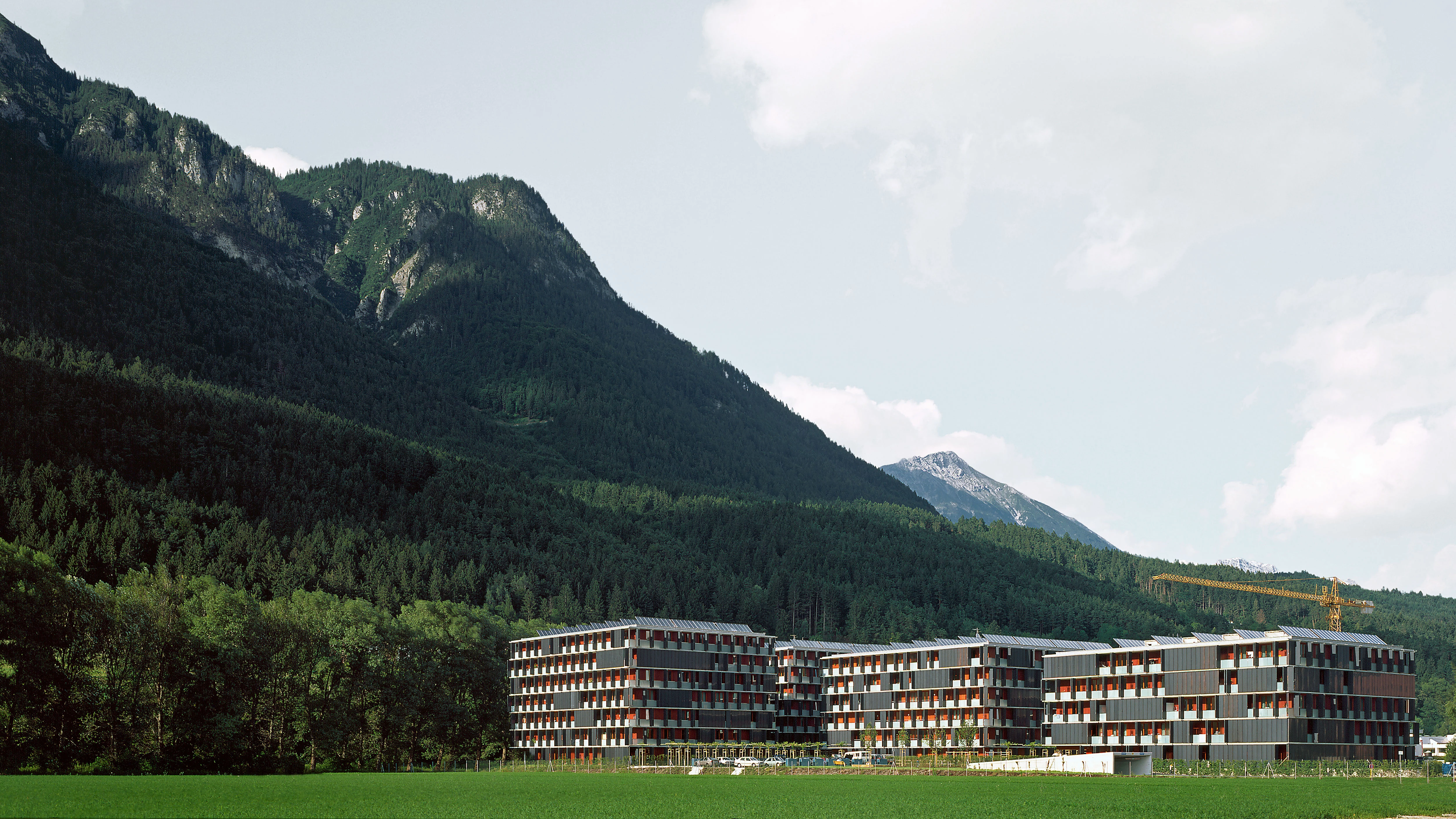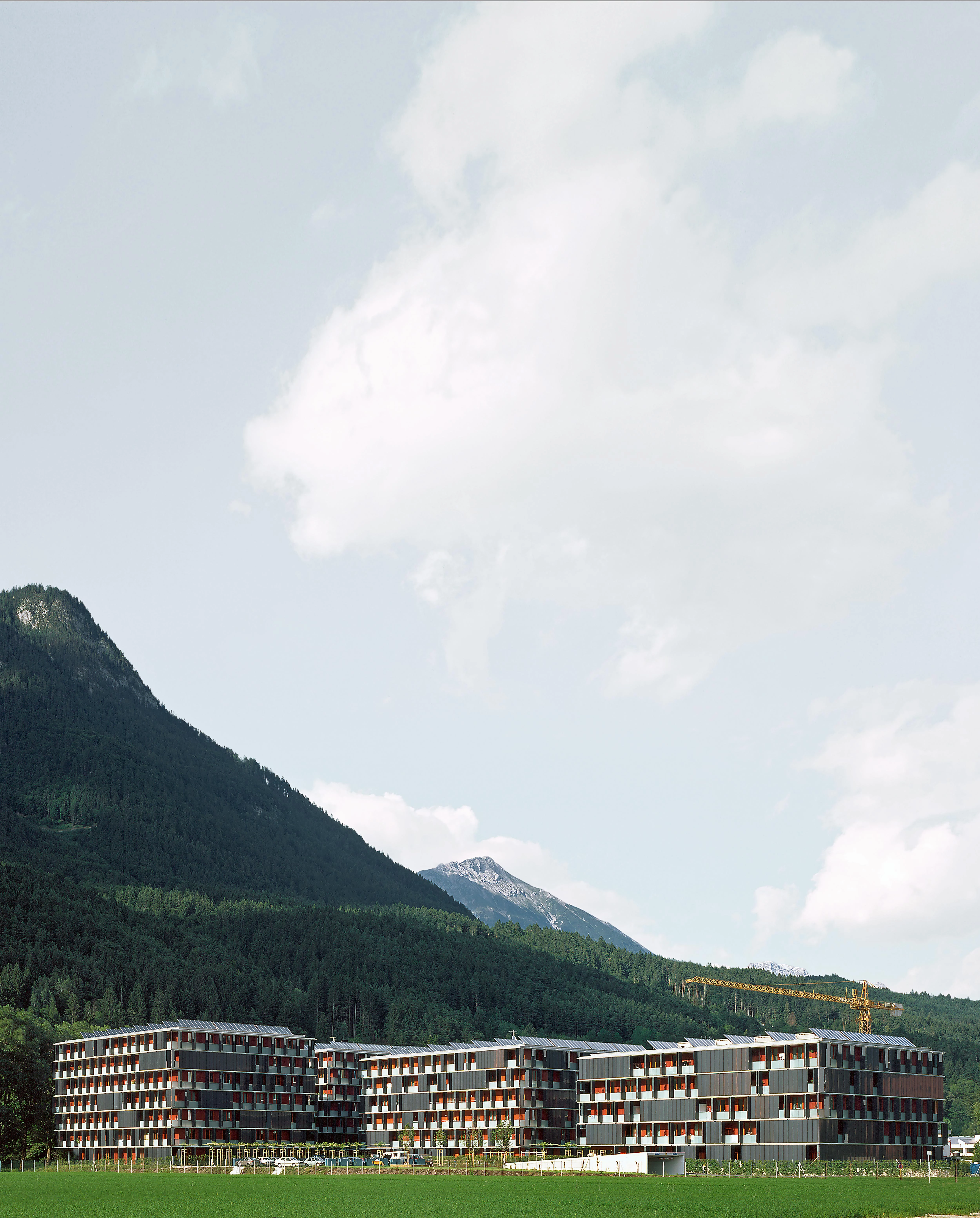 Desde la manzana cerrada al edificio en altura, todo un catálogo de formas urbanas acompaña el solar de la periferia de Innsbruck donde estaba prevista la construcción de un gran número de pisos de protección oficial. Lindando al sur con los edificios de los años sesenta que componen el campus universitario, la urbanización del conjunto tuvo como prioridad fomentar la relación de las viviendas con el entorno natural que rodea la ciudad, condicionando la elección de un tipo edilicio que permitiera la permeabilidad de la actuación a pesar de la gran densidad requerida.