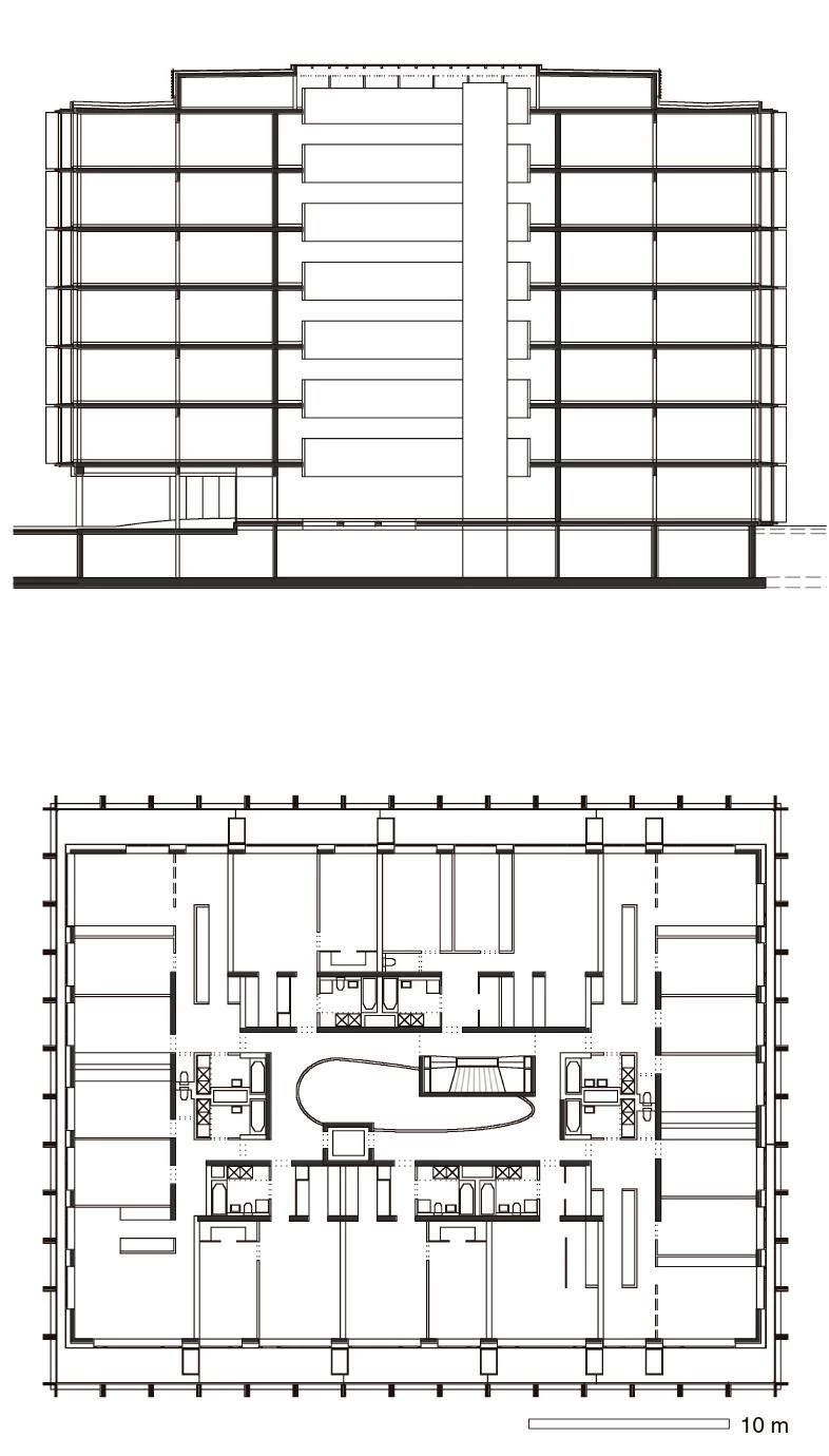 Un total de 298 viviendas se reparten en los seis bloques de entre cinco y siete alturas que constituyen la primera fase de un conjunto de once. Buscando la economía constructiva y el ahorro energético, se eligió una volumetría compacta que presentara menor extensión de fachada por unidad de superficie útil. Siguiendo un principio compositivo en capas concéntricas, las entradas a las viviendas se presentan pareadas a lo largo del corredor que circunda un gran vacío central de trazado elíptico, protegido de la intemperie por el lucernario de la cubierta. Alrededor de este distribuidor, en cada planta se dispone una banda de servicios que concentra el ascensor, las escaleras, así como los trasteros, los baños y las cocinas de cada apartamento, reservando la corona exterior para dormitorios y otras estancias vivideras. La última capa del edificio está formada por el espacio privado al aire libre de los balcones, que se puede ocultar por completo, cerrando las contraventanas verticales de cobre fijadas al perímetro. Con las contraventanas cerradas, los bloques se presentan como voluminosos cubos de cobre, una geometría rotunda que desaparece cuando al plegarse, esta coraza descubre la envolvente térmica del edificio, revestida de madera.