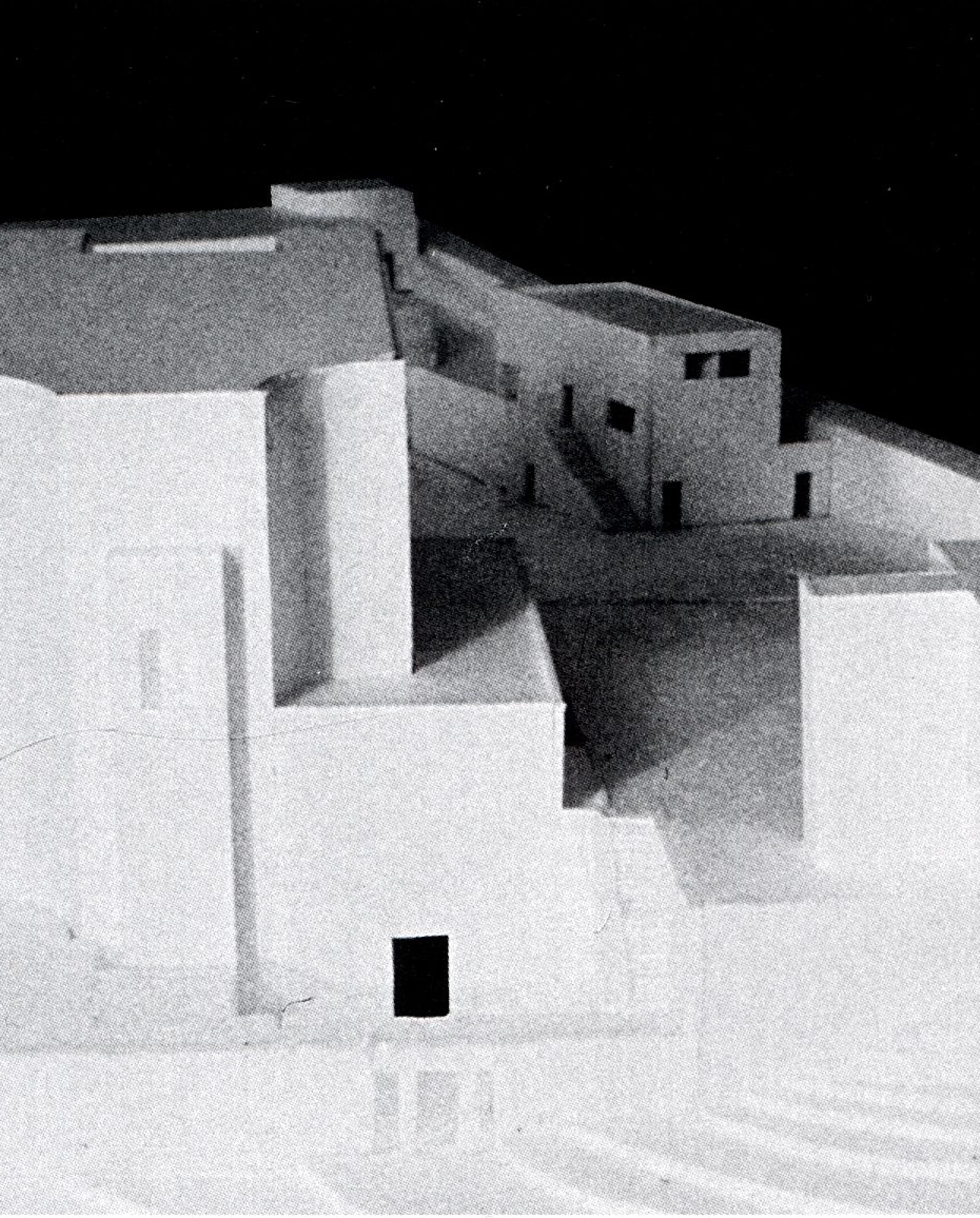 El conjunto proyectado se alza sobre una plataforma ligeramente elevada con respecto al nivel de la calle. En ella se crea una plaza irregular delimitada por algunas construcciones existentes y los nuevos edificios incluidos en la propuesta. El programa funcional se divide en tres partes, cada una configurada como un volumen independiente.
