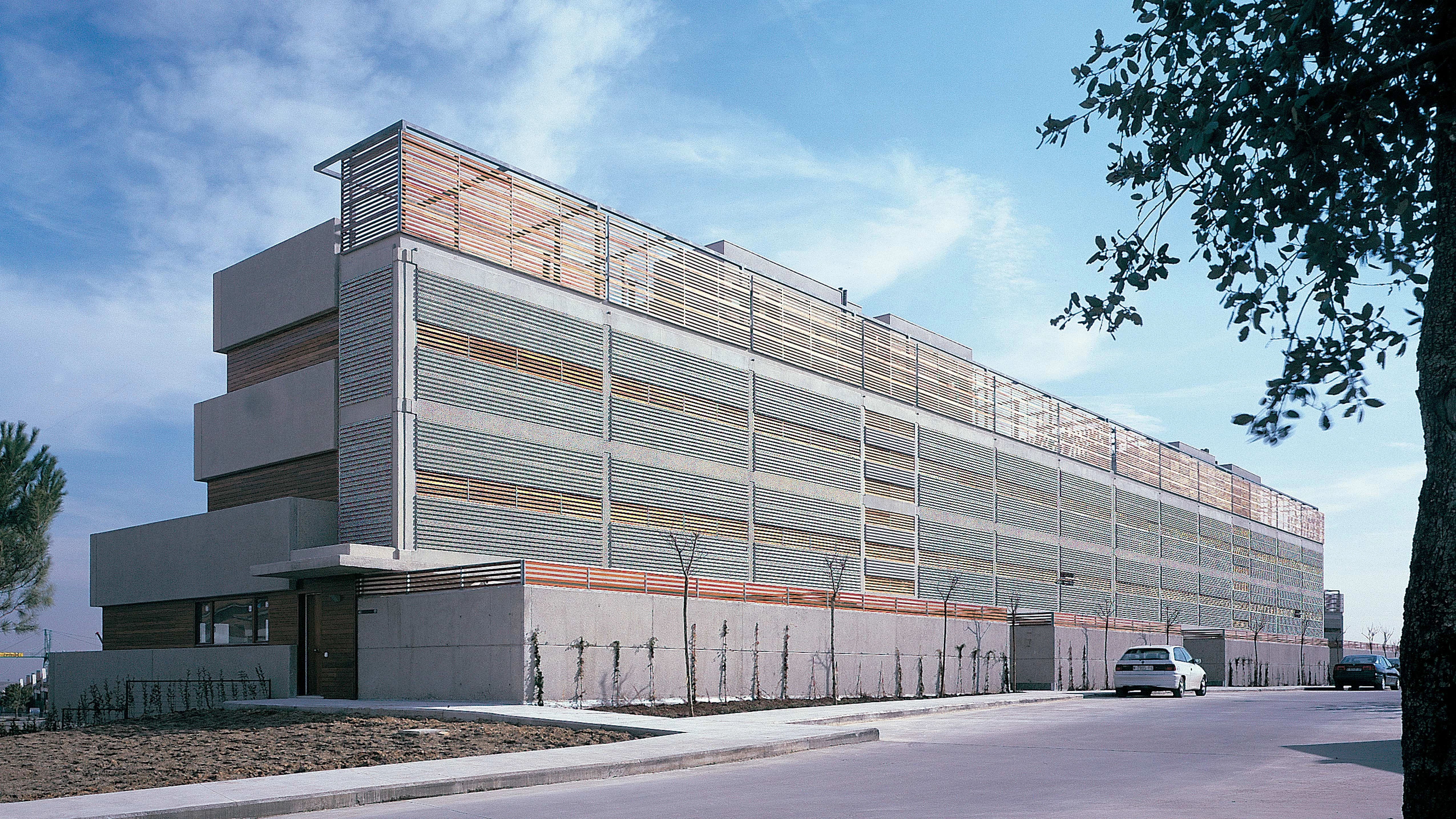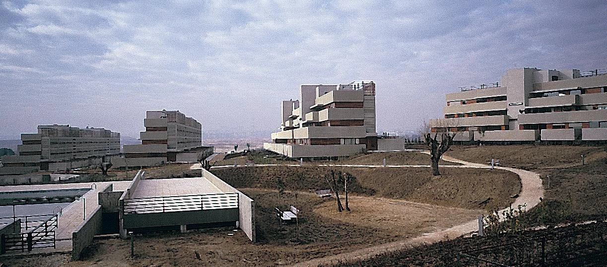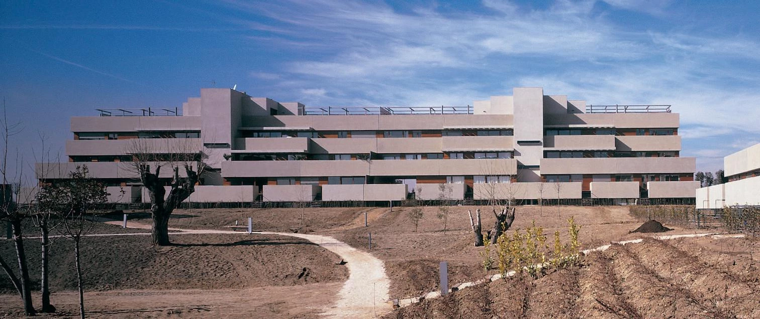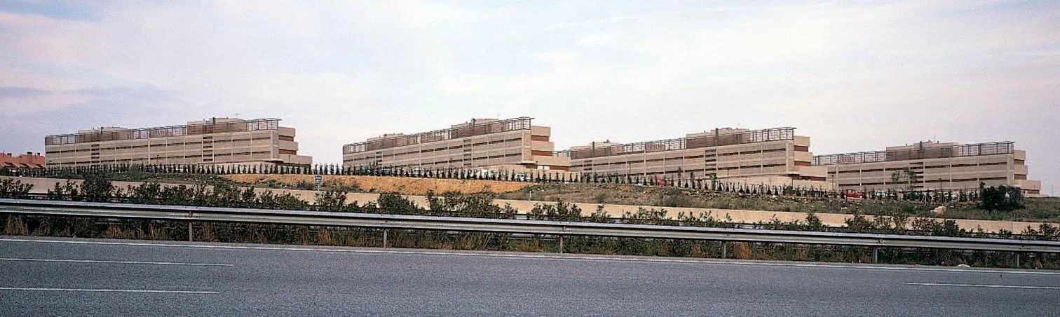 Como los anillos de crecimiento de un árbol, las vías de circunvalación de Madrid registran los cambios acontecidos en la arquitectura residencial de la capital en su expansión de las últimas décadas. Si la M-30 fue el escenario elegido por las primeras administraciones municipales de la democracia para desarrollar su política de vivienda, la M-40 trata de hilar las iniciativas más recientes. En el más joven de estos cinturones —ya a diez kilómetros del centro norte— cinco bloques de tres alturas miran la silueta de la ciudad como algo ajeno. Transversalmente a la carretera, estos volúmenes definen su posición de la forma en que lo hacen las grandes estructuras publicitarias características de toda vía rápida, con una cara tersa que se enfrenta al ruido y al tráfico y otra fragmentada, abierta a la luz del sur y al paisaje.