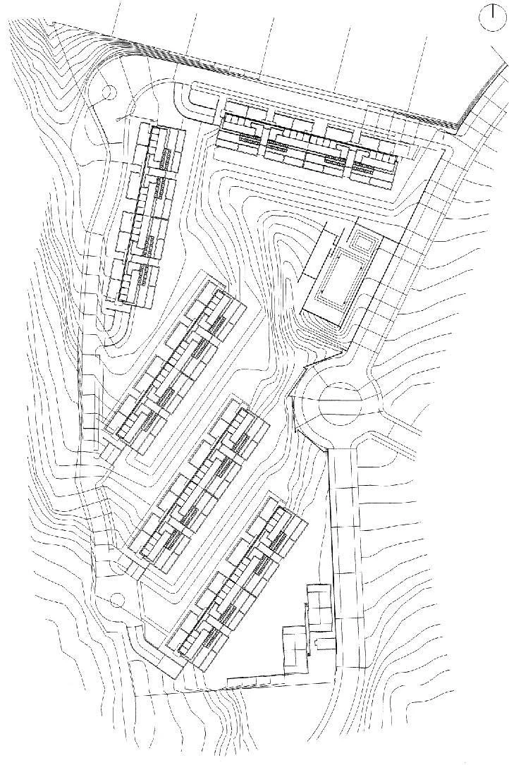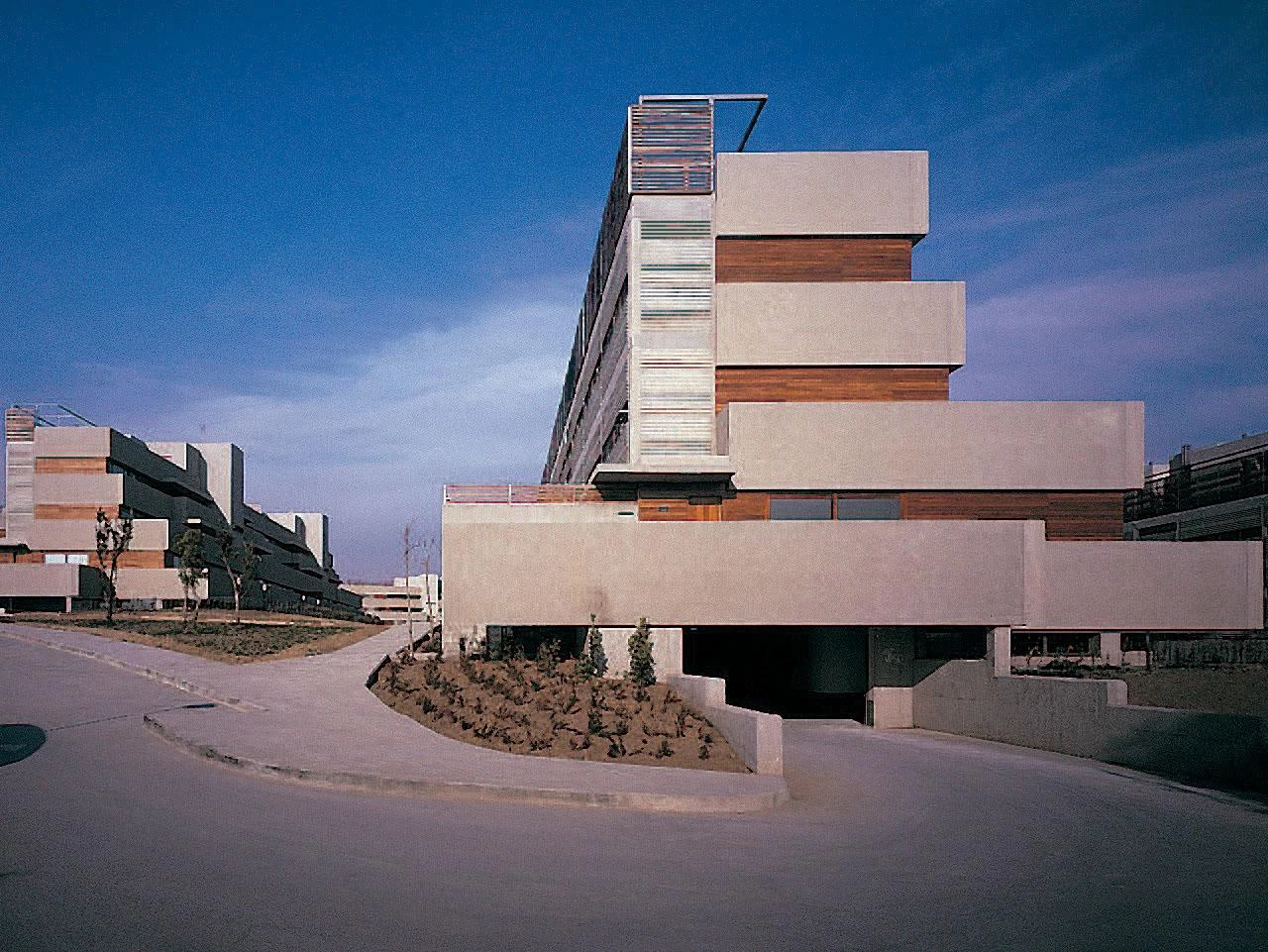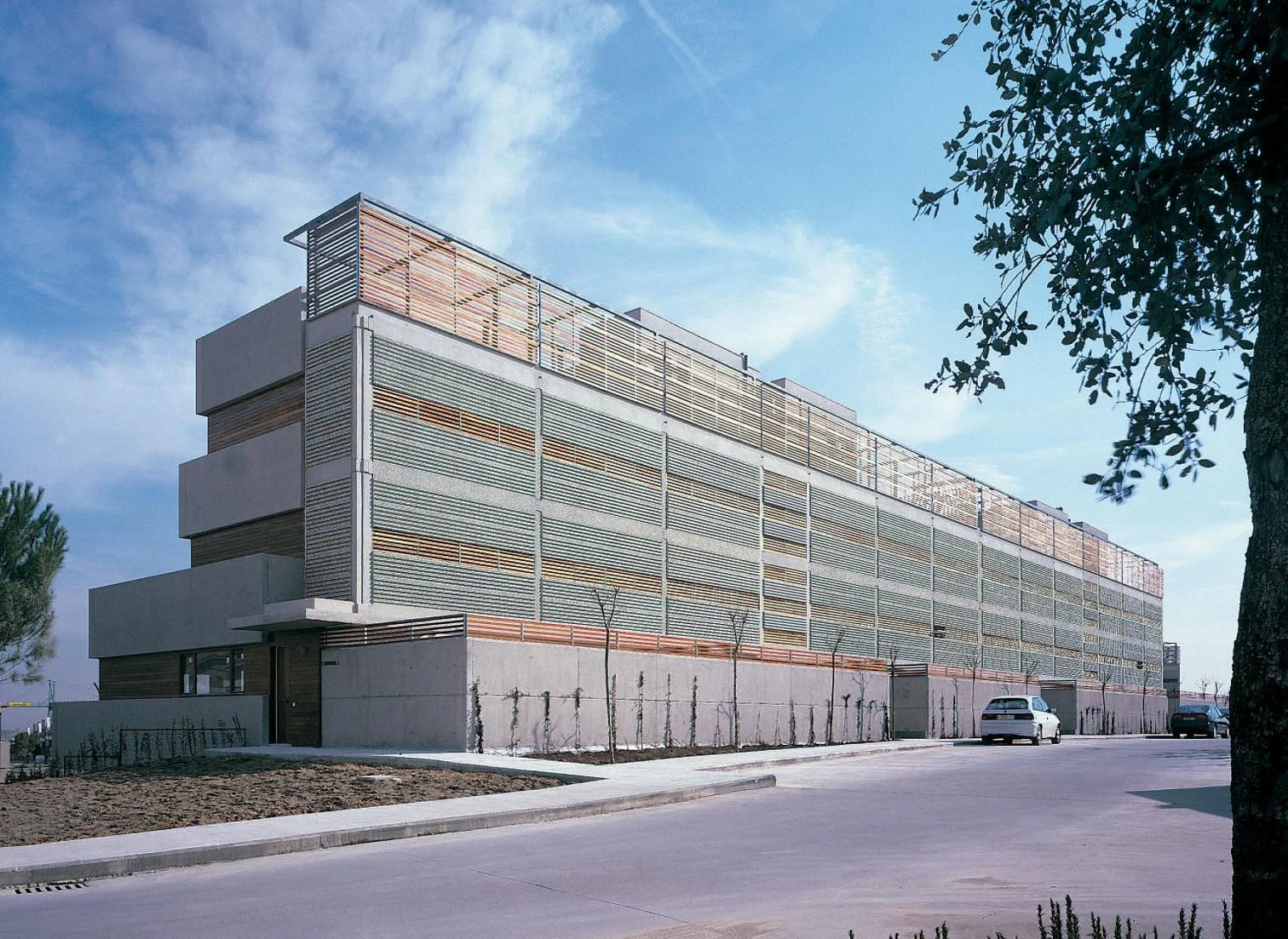 Como los anillos de crecimiento de un árbol, las vías de circunvalación de Madrid registran los cambios acontecidos en la arquitectura residencial de la capital en su expansión de las últimas décadas. Si la M-30 fue el escenario elegido por las primeras administraciones municipales de la democracia para desarrollar su política de vivienda, la M-40 trata de hilar las iniciativas más recientes. En el más joven de estos cinturones —ya a diez kilómetros del centro norte— cinco bloques de tres alturas miran la silueta de la ciudad como algo ajeno. Transversalmente a la carretera, estos volúmenes definen su posición de la forma en que lo hacen las grandes estructuras publicitarias características de toda vía rápida, con una cara tersa que se enfrenta al ruido y al tráfico y otra fragmentada, abierta a la luz del sur y al paisaje.