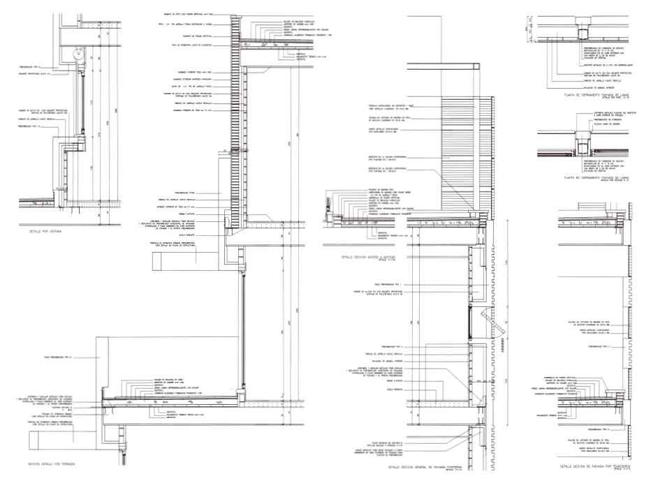 Desde los materiales y la construcción se insiste en esta doble definición de un anverso y un re-verso; el frente liso y duro de servicios se cierra con paneles prefabricados de hormigón blanco en cuya modulación se inscriben a intervalos regulares unas escuetas carpinterías de madera. El relieve superficial que marca estos paneles reproduce el ancho de las tablas de teca que recubren las partes «blandas» del edificio, como la celosía del ático o las bandas horizontales —perforadas por grandes ventanales acristalados— que dominan el frente de terrazas. Un módulo estricto de 5,60 metros permite edificar con economía a partir de un número reducido de piezas, pero reaccionando ante las condiciones contradictorias del entorno; la cara y la cruz de un solar ajardinado situado junto a la autovía.