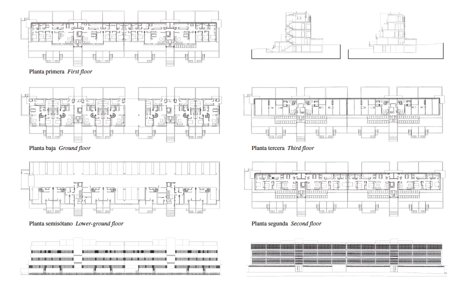Un total de 76 viviendas ocupan los cinco bloques que, con una vocación decididamente horizontal, ofrecen distribuciones y tamaños distintos en cada nivel. Los apartamentos a ras del suelo cuentan con acceso directo desde el garaje, así como con una zona de servicio en el semisótano que se abre a un patio inglés. Los pisos de tres dormitorios —en un solo nivel— ocupan la primera planta, mientras unos dúplex rematan el edificio formando un ático. Como denominador común todas las viviendas tienen al norte una suerte de espina dorsal —formada por las cocinas, los tendederos y los aseos— que protege el espacio vividero de los vientos fríos del norte y del ruido de la autopista, y un frente sur desmembrado en terrazas ajardinadas que—mediante petos de hormigón— adquieren el carácter de estancias al aire libre. El arbolado de la parcela y el contorno sinuoso de las colinas lejanas se incorporan así al espacio doméstico, integrándose con la arquitectura en un mismo gesto.