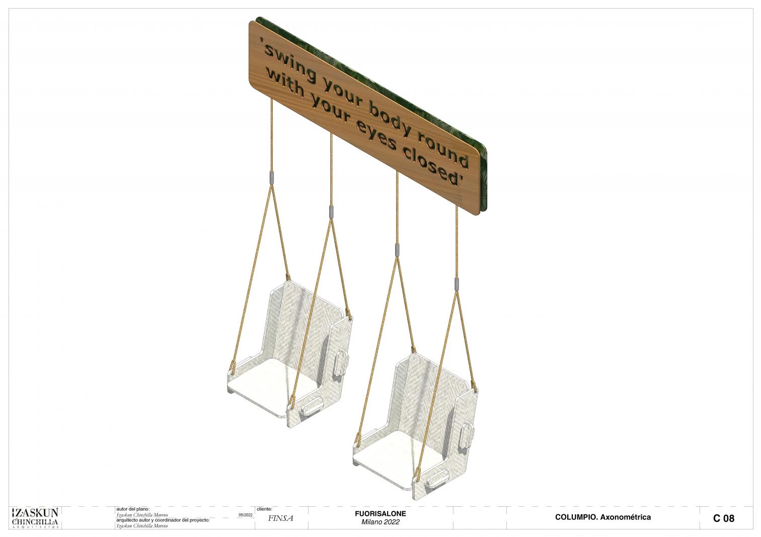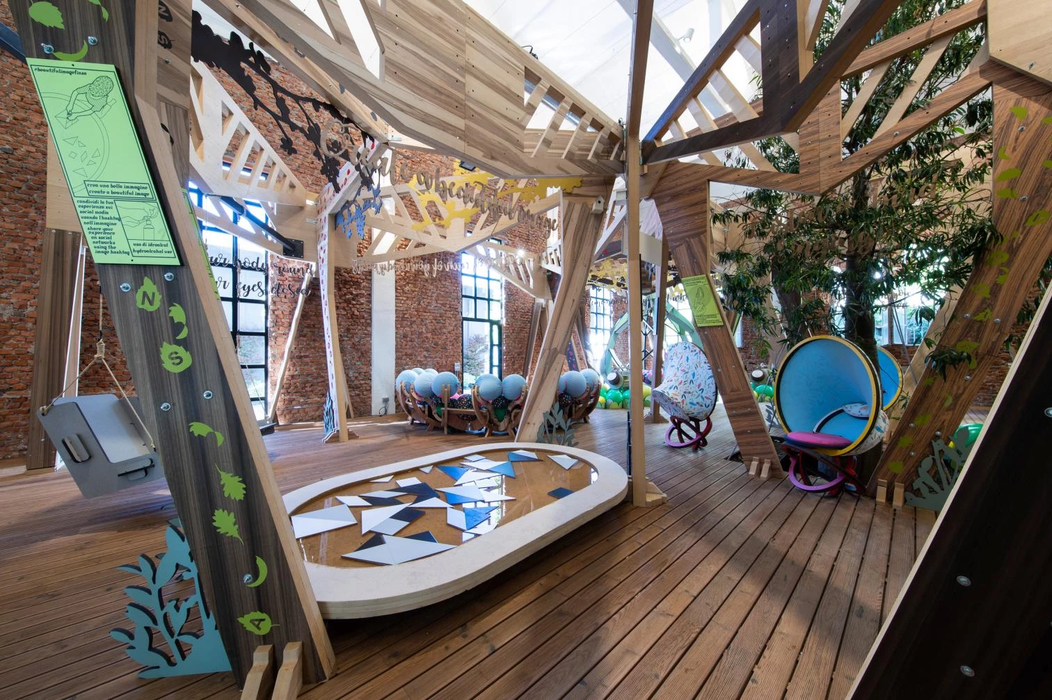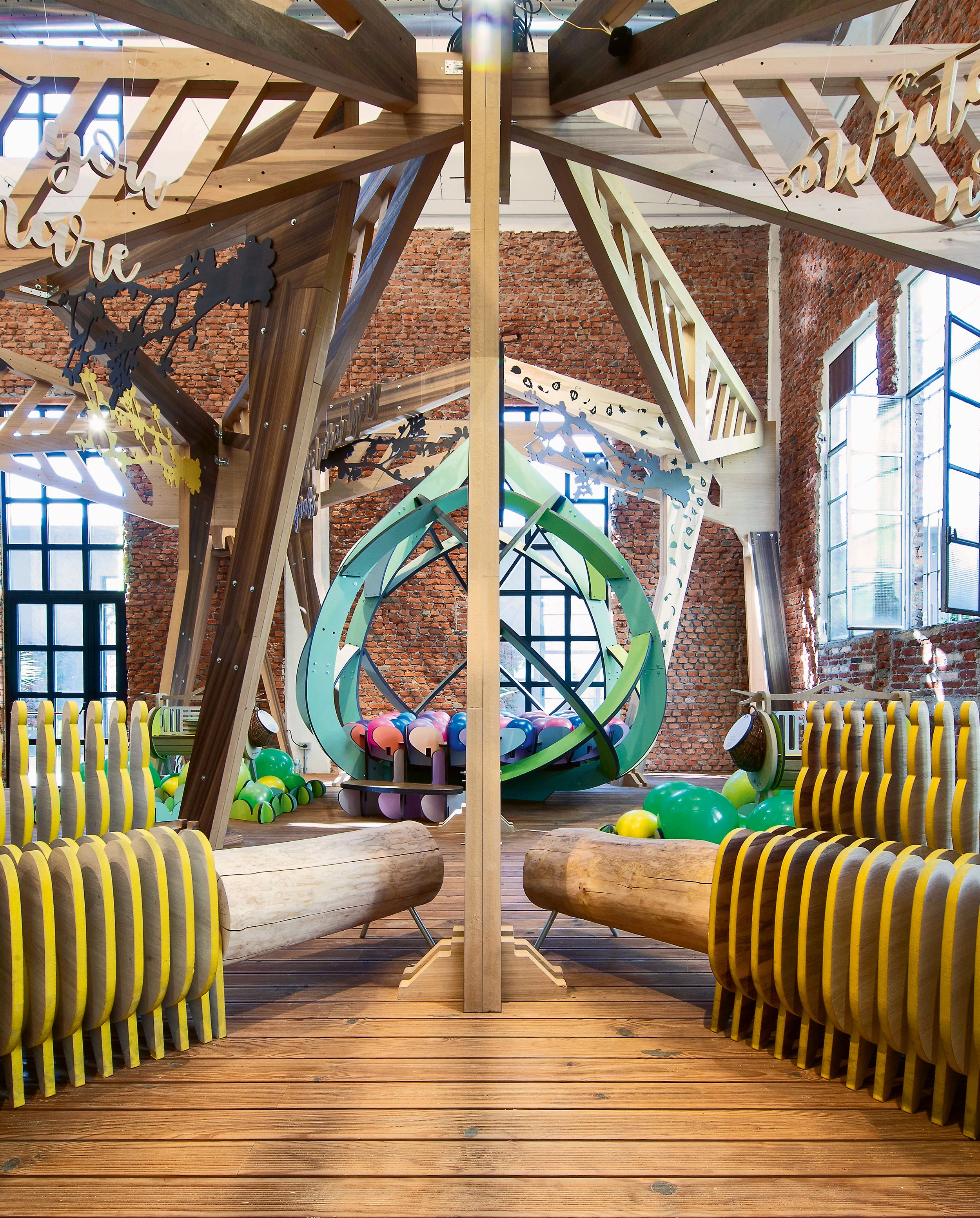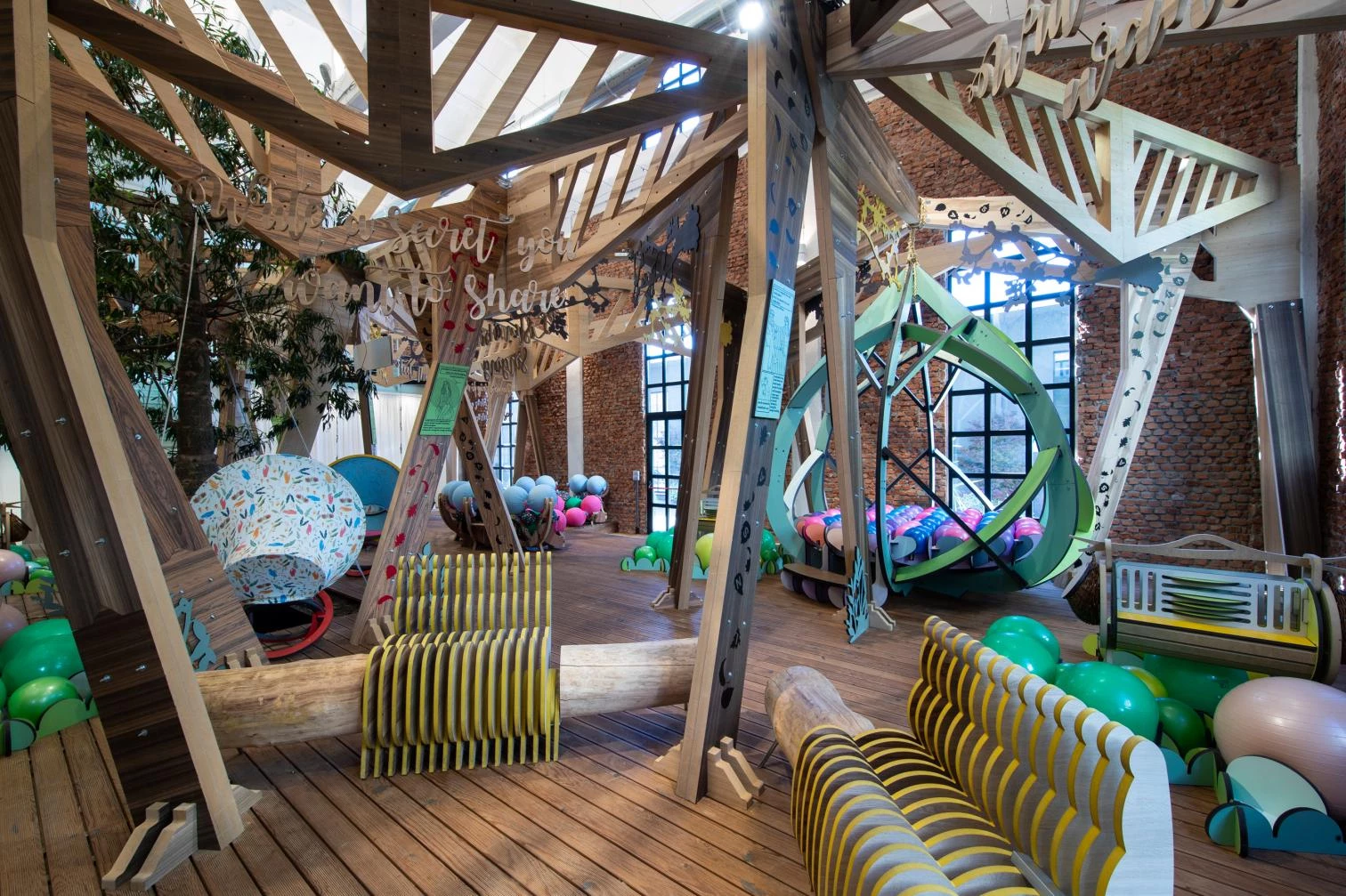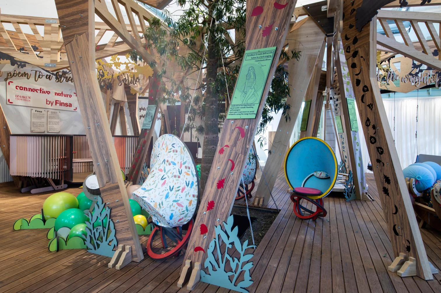 Bajo una pérgola de cerchas triangulares, ocho ambientes diferentes hilvanan un recorrido pensado para estimular los sentidos y recrear emociones reconfortantes, desde el disfrute de estar tumbado en la hierba hasta la toma de conciencia del propio peso. Todo por medio de un imaginativo alarde de soluciones en madera que forman un bosque encantado habitado por muebles ergonómicos y columpios placenteros.