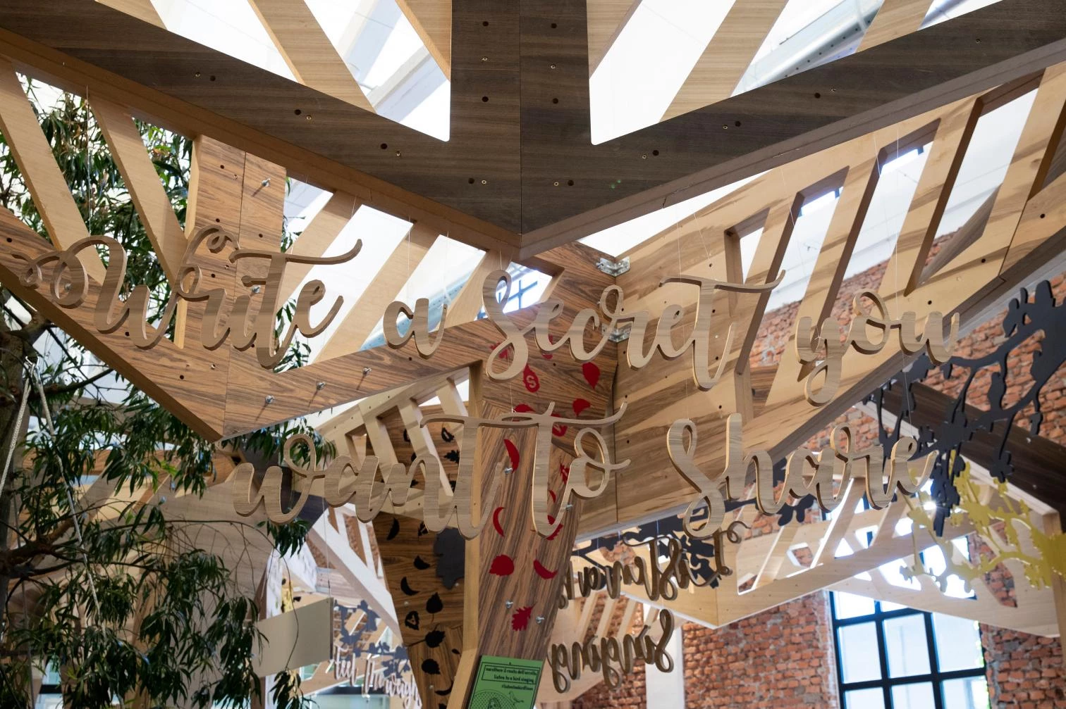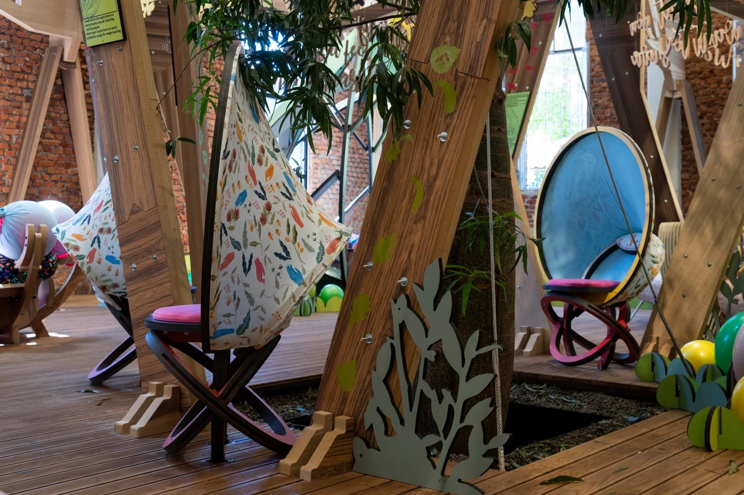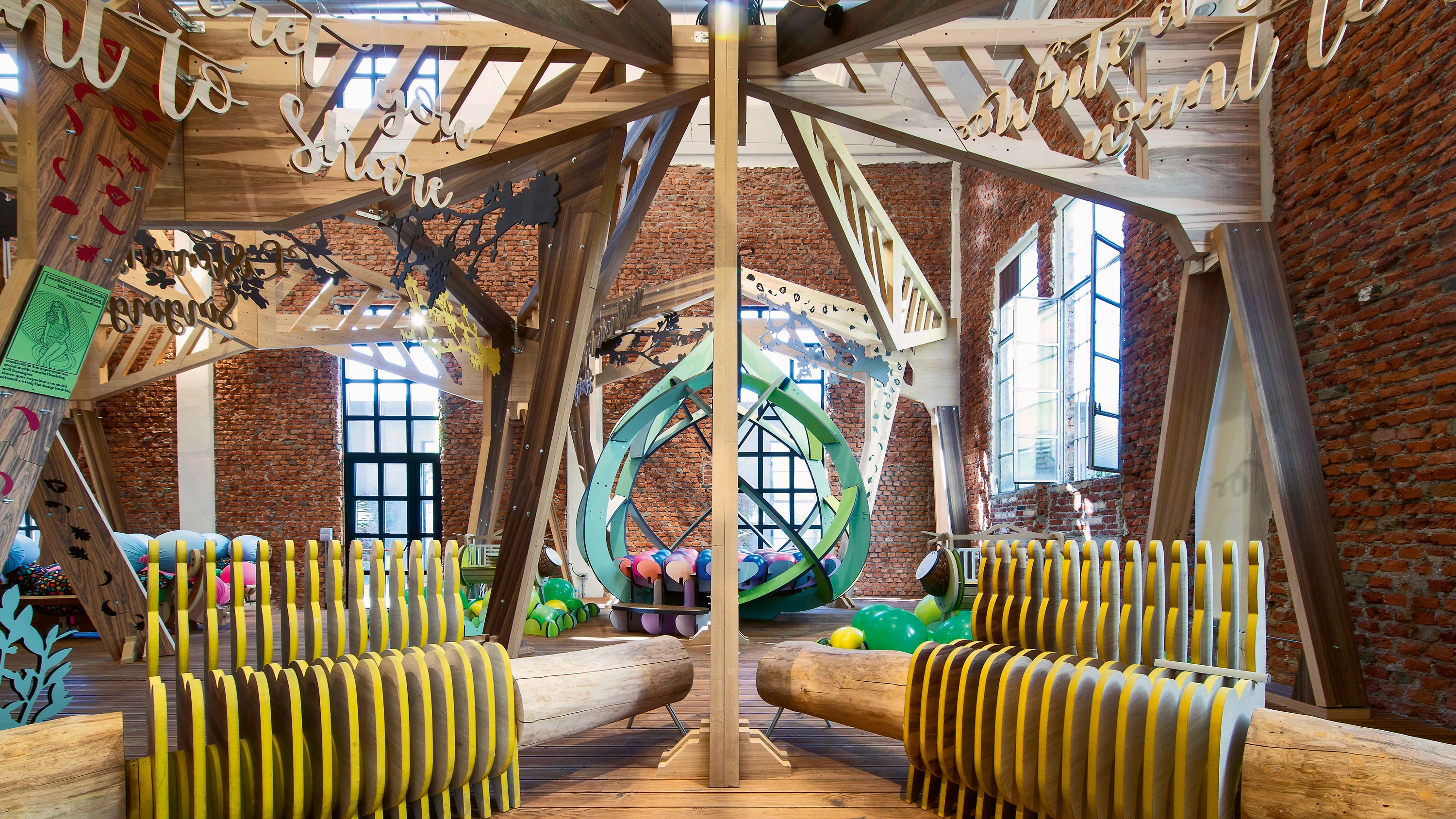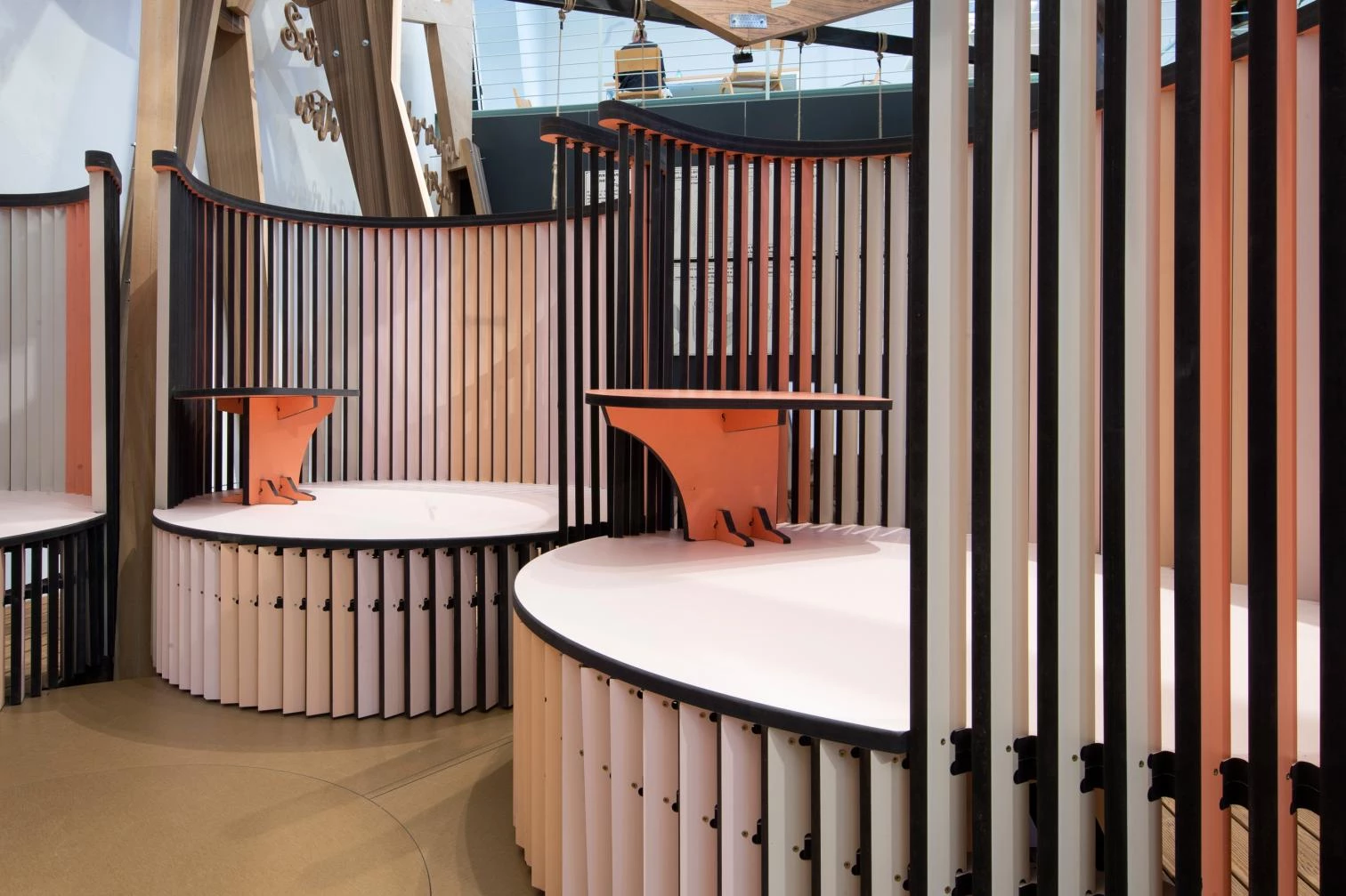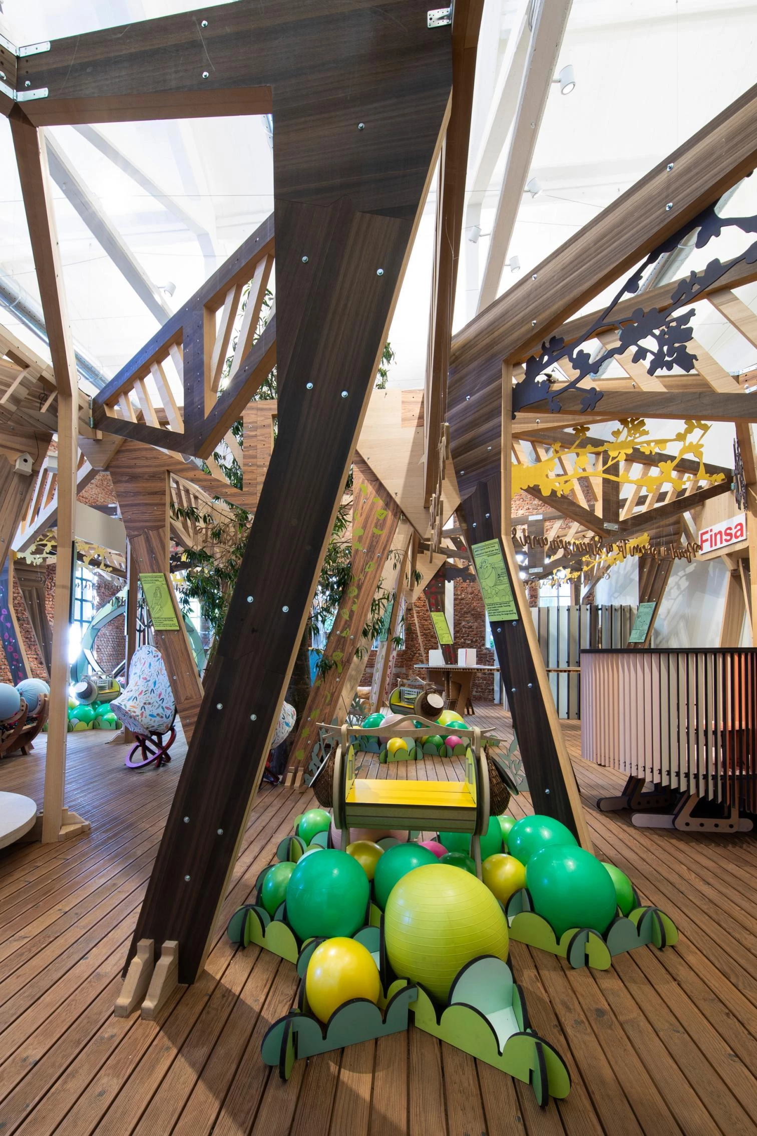 Bajo una pérgola de cerchas triangulares, ocho ambientes diferentes hilvanan un recorrido pensado para estimular los sentidos y recrear emociones reconfortantes, desde el disfrute de estar tumbado en la hierba hasta la toma de conciencia del propio peso. Todo por medio de un imaginativo alarde de soluciones en madera que forman un bosque encantado habitado por muebles ergonómicos y columpios placenteros.