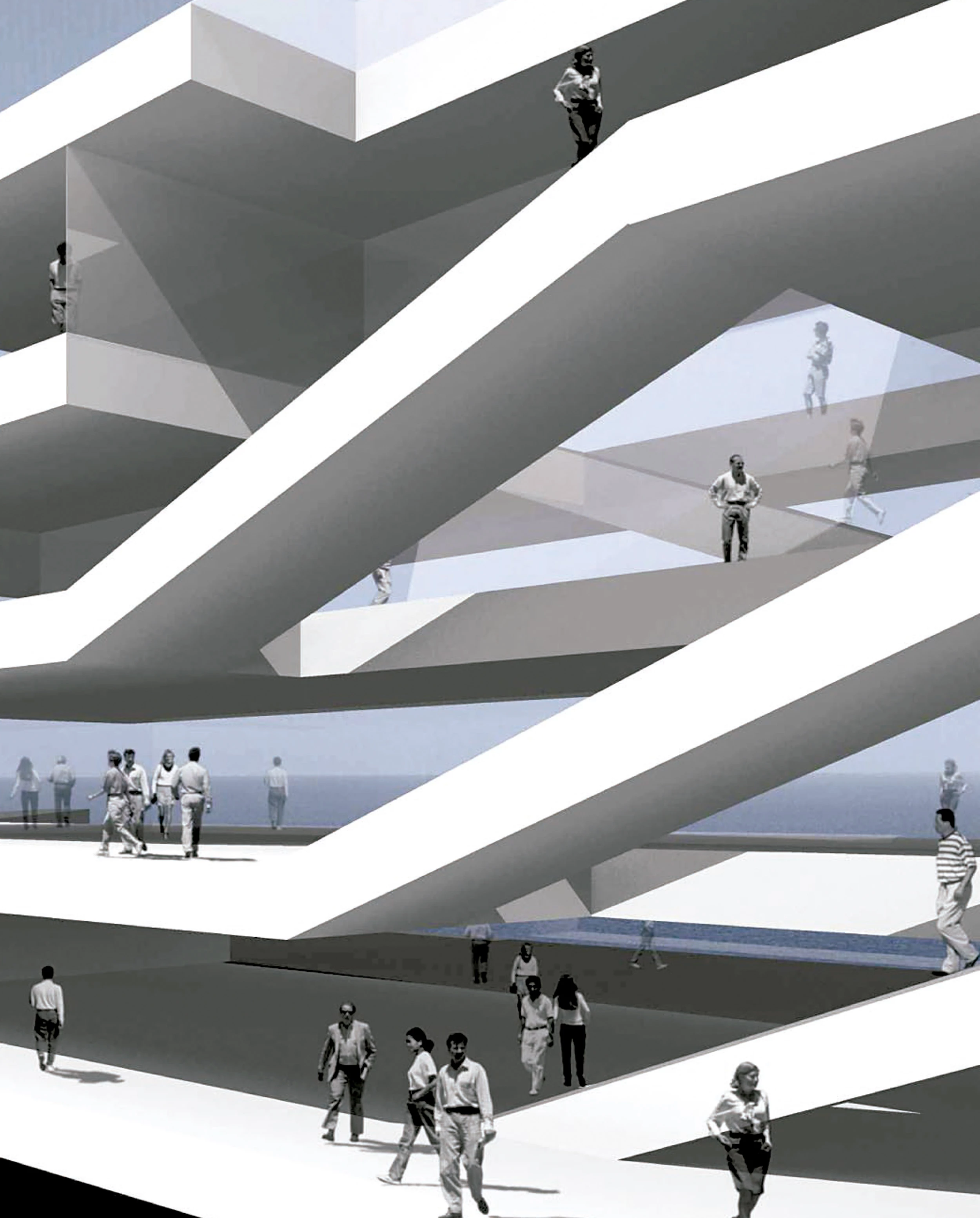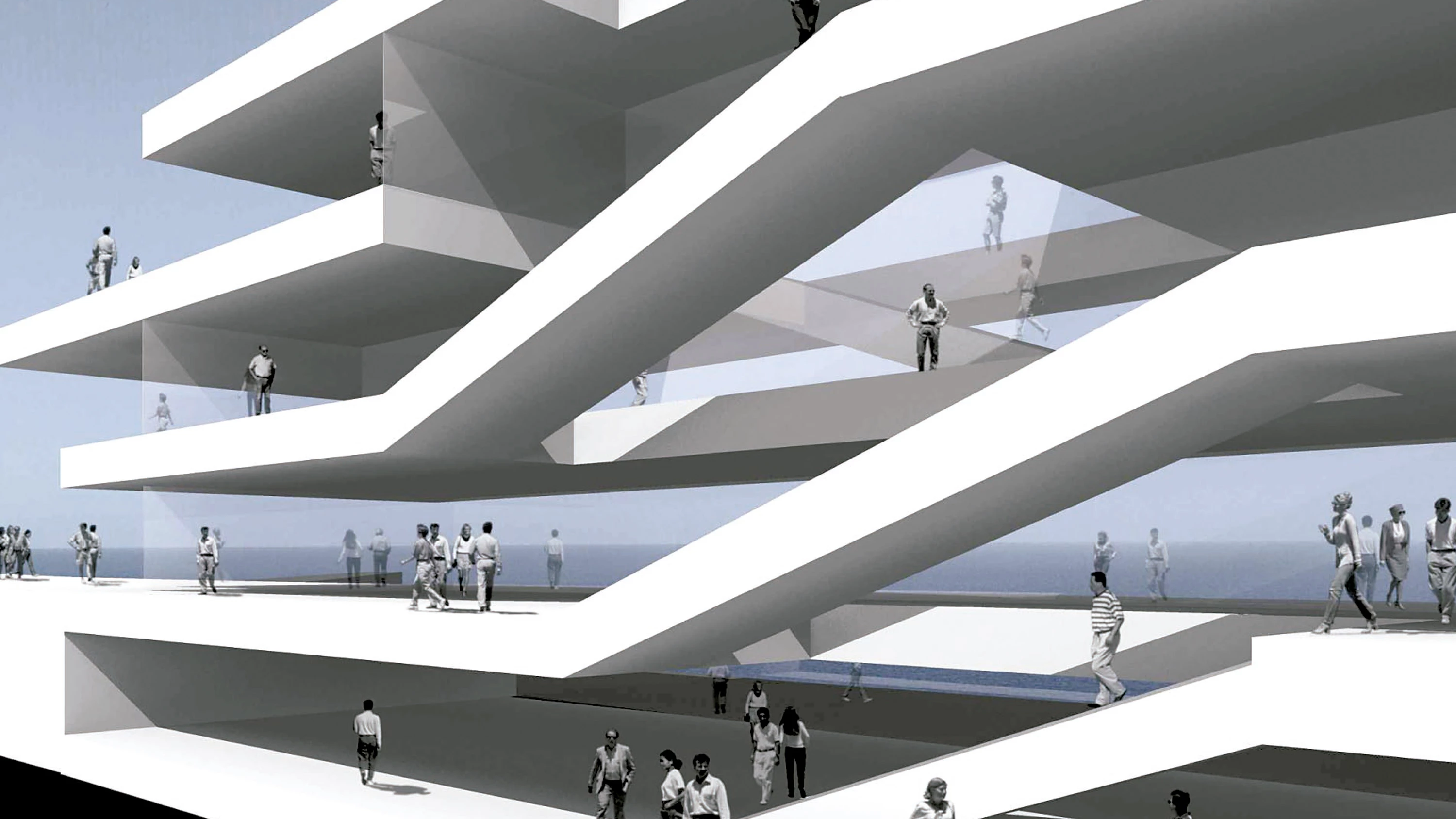 Situado en el punto de entrada al canal de la dársena interior del puerto, el edificio se compone de cuatro plataformas apiladas y desplazadas unas de otras estratégicamente para ofrecer espacios a la sombra con vistas panorámicas. En el zócalo se ubica el aparcamiento que se extiende por debajo de la topografía del nuevo parque.