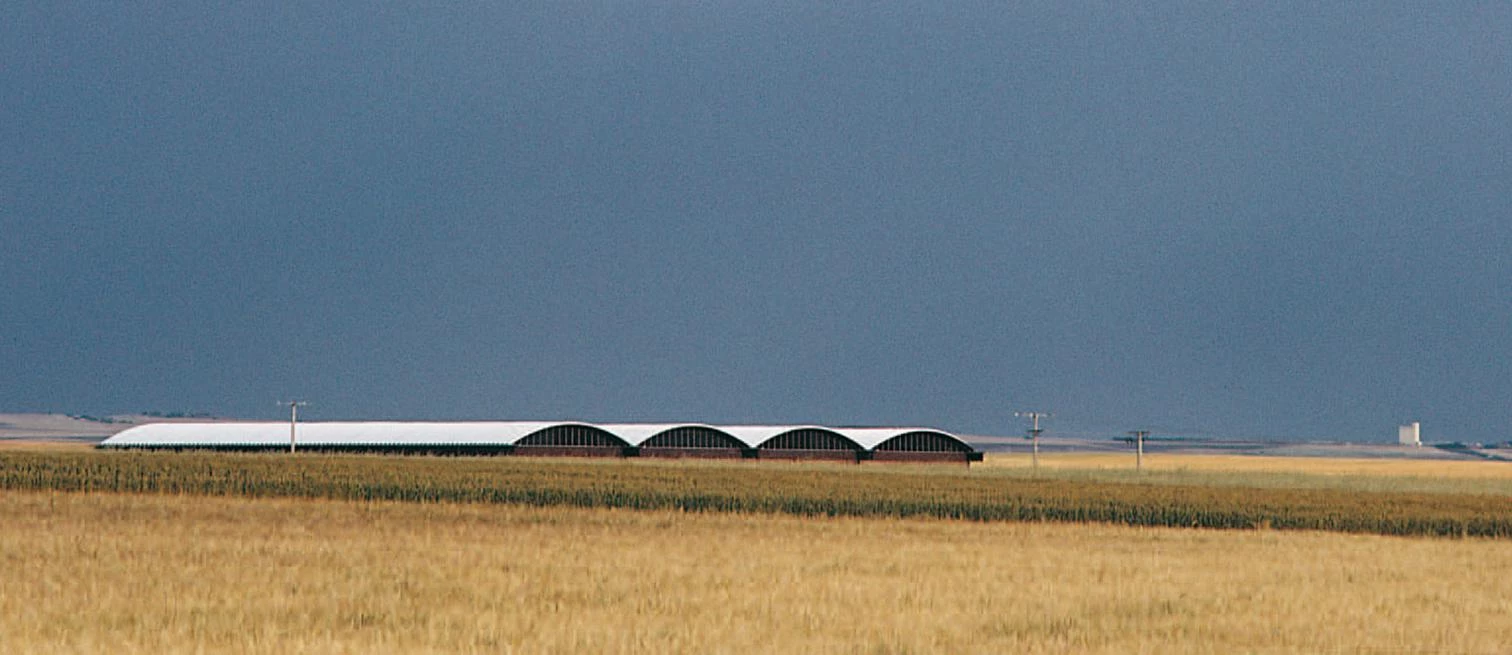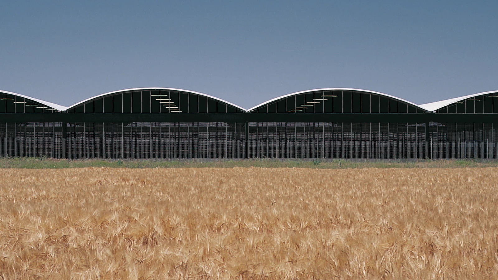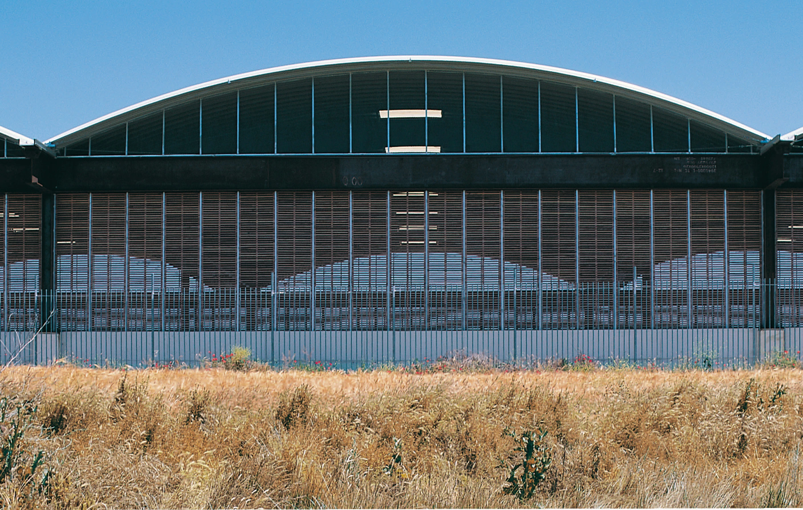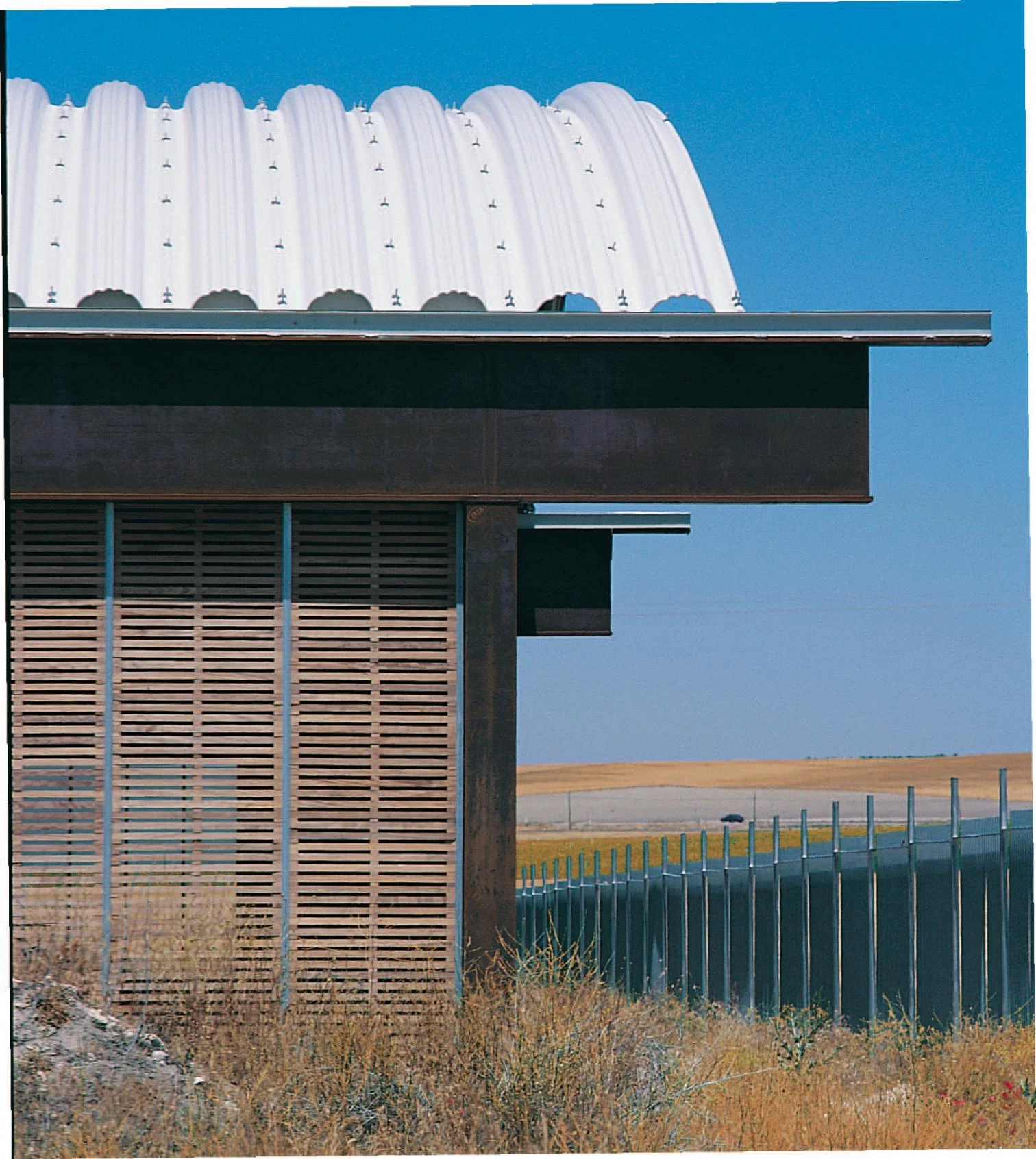 La primera parte de la actuación ha consistido en cercar el recinto y cubrir las ruinas ya excavadas, dejando para una segunda fase la construcción de un edificio para exposiciones con una sala de proyección que apoye con medios audiovisuales la visita. Además de un ajustado presupuesto, reducir al mínimo el número de apoyos necesario para cubrir los 4.800 metros cuadrados del área a proteger ha sido el principal reto de la primera parte del proyecto. Una solución comercializada para la construcción de naves industriales —capaz de salvar vanos de hasta veinte metros— ha permitido cubrir una planta de 60 x 80 metros con tan sólo tres pilares interiores. Con la ligereza de las protecciones provisionales utilizadas en las excavaciones arqueológicas, el nuevo techo está formado por una chapa nervada y lacada por ambas caras que se comba para formar un arco tensado por cables en su parte inferior. Los cuatro fragmentos cilíndricos definidos por la chapa descansan sobre una retícula de vigas de sección en H y un metro de canto que, como los pilares, están realizados en acero cortén. Un zócalo perimetral y unos dados de hormigón blanco actúan de zapatas de los pilares sin apenas tocar las ruinas. En la lejanía, el edificio se presenta como un plano extenso cuyo perfil ondulado evoca el de la topografía de la zona.