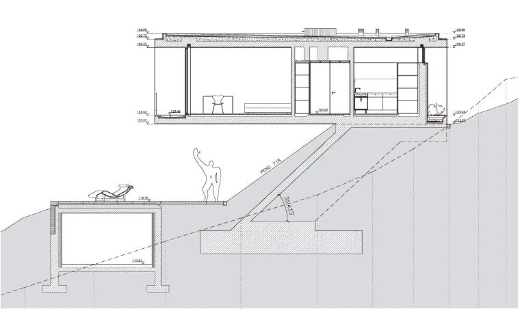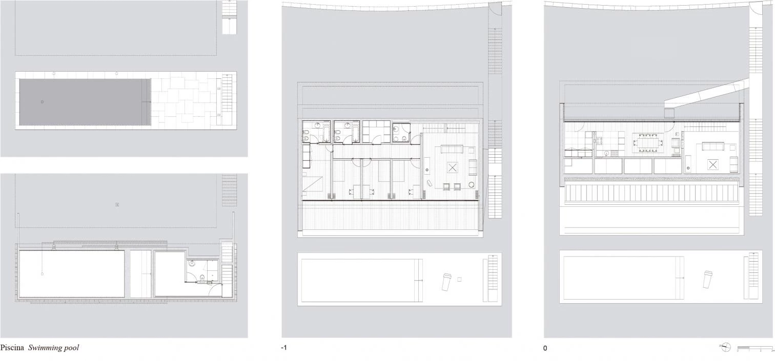 Con un programa similar —vivienda unifamiliar de cuatro habitaciones— las dos casas hunden sus cimientos a media ladera, por lo que son dos estrechos caminos de piedra los que conducen desde la carretera hasta el punto de acceso a cada edificio. La ‘casa horizontal’, como se identifica a la que se encuentra al norte, aloja el conjunto del programa en una planta única que vuela sobre la colina; cocina y servicios se alinean en una banda orientada hacia el terreno, permitiendo así que el salón y las habitaciones se abran al paisaje. El espacio bajo el voladizo, a priori residual, se pone en valor cubriendo su pendiente con una capa de césped —lo que la convierte en una extensa tumbona natural— y situando a continuación la piscina, generando así una estancia semi-exterior a caballo entre naturaleza y arquitectura. La ‘casa inclinada’, en la parcela más meridional, se desarrolla en dos niveles: la planta superior aloja la cocina-comedor y un cuarto para la colada; la planta inferior sitúa contra el muro de contención los servicios y la escalera, con lo que la sala de estar (a doble altura) y los dormitorios, vinculados por una terraza corrida, disfrutan de las mejores vistas. A la piscina, en la parte más baja, se llega desde la escalera lateral. Esta segunda casa, que se desarrolla como un espacio bajo cubierta, se percibe exteriormente —desde donde no se observan terrazas ni ventanas— como una versión de la casa horizontal ‘caída’ sobre la pendiente.