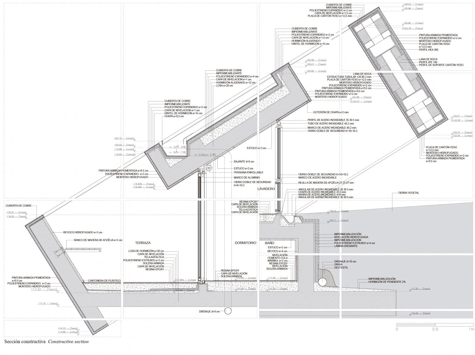 La construcción de ambas viviendas, de dimensiones similares, se ha resuelto empleando materiales idénticos: estructura de hormigón (muros y losas), acabados interiores a base de revoco de estuco en los paños verticales y de imprimación de resina en los suelos, carpinterías de aluminio y cubierta de chapa de cobre. La diferencia final entre las dos casas —si bien una se enfrenta a la pendiente y la otra se adapta a ella— es exteriormente muy pequeña. Pintadas íntegramente de blanco, adquieren la impronta de una composición escultórica al aire libre, una suerte de land art habitable.
