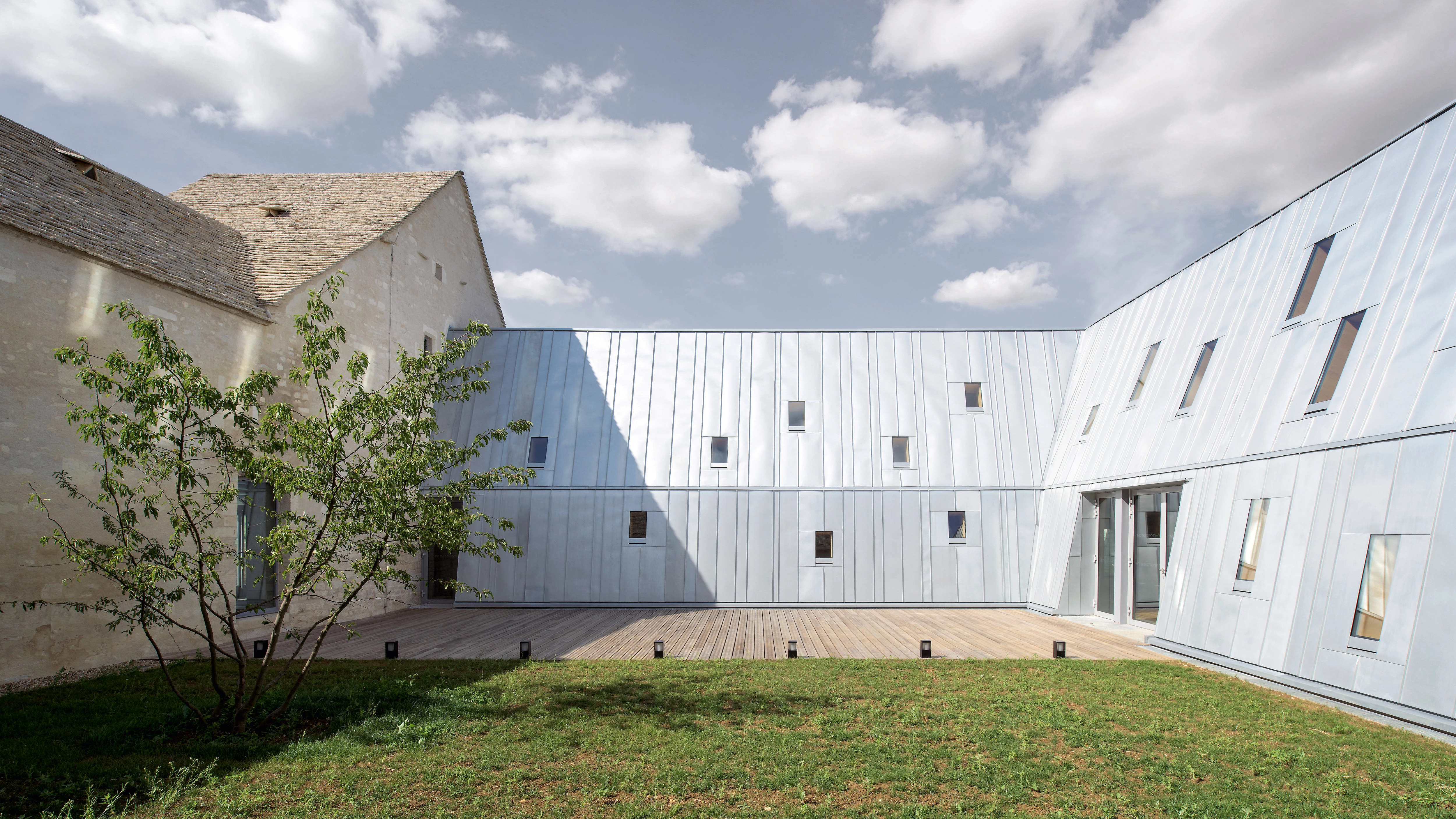La segunda parte consistió en la ampliación del conjunto mediante un nuevo pabellón en forma de L que conecta las piezas preexistentes y que se integra en ellas a través de su volumen austero, casi esquemático, cuyas cubiertas inclinadas aluden a los tipos constructivos originales del edificio. Sin embargo, esta integración no recae en la simple copia del pasado: los materiales empleados permiten distinguir lo nuevo de lo viejo, sin romper la armonía geometría y visual del conjunto. Entre estos materiales resulta protagonista el zinc, colocado en paneles que dibujan un rayado sobrio a lo largo de la envolvente, y a los que se le ha dado un acabado rugoso y un sí no es basto, que apaga los reflejos metálicos para establecer de este modo un diálogo armonioso con los severos muros de piedra y las cubiertas de teja.