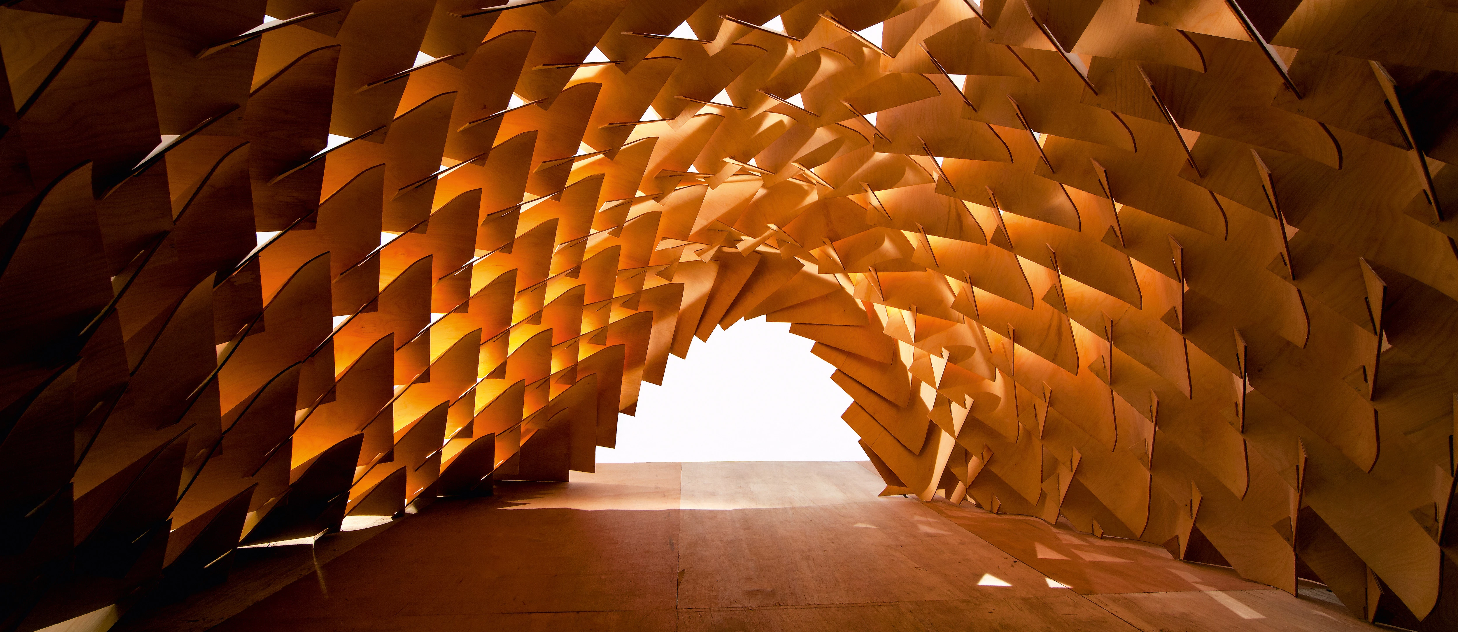 Emmi Keskisarja Pekka Tynkkynen LEADLa superficie se genera mediante dos curvas catenarias que intersecan con el plano del suelo; unas capas internas de película adhesiva permiten la curvatura de las piezas de madera contrachapada termoformable a una menor temperatura.