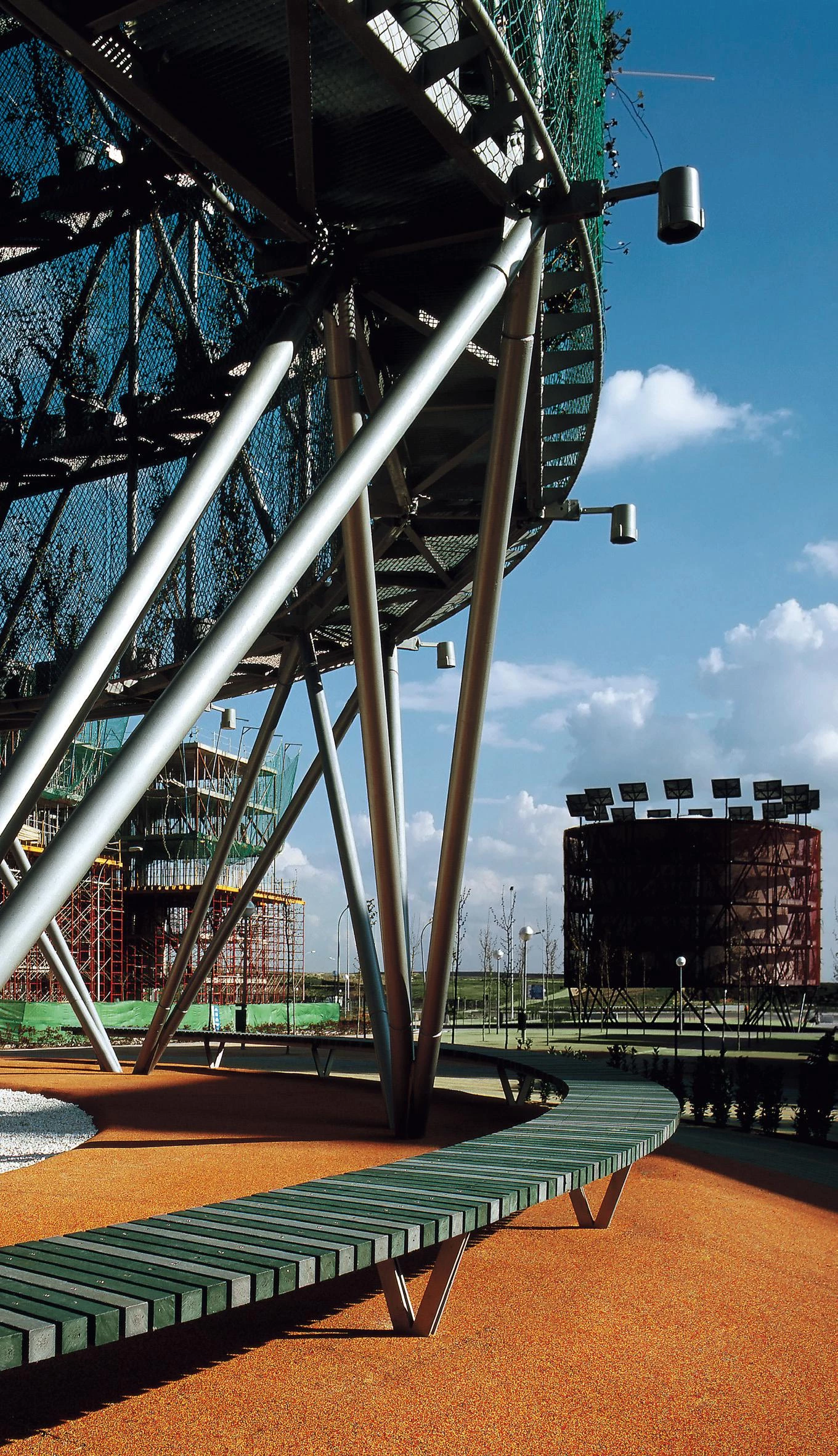 Constituida por tres pabellones, esta construcción de estructuras metálicas ligeras sirve de hito visual urbano que da cobijo a numerosos acontecimientos alrededor de pequeñas operaciones de tratamiento de pavimento y mobiliario. Nombrados como árboles climático, mediático y lúdico, sus de-nominaciones aluden a los cometidos para los que se destinan, a la vez que se les emparenta con las especies vegetales que suplantan.