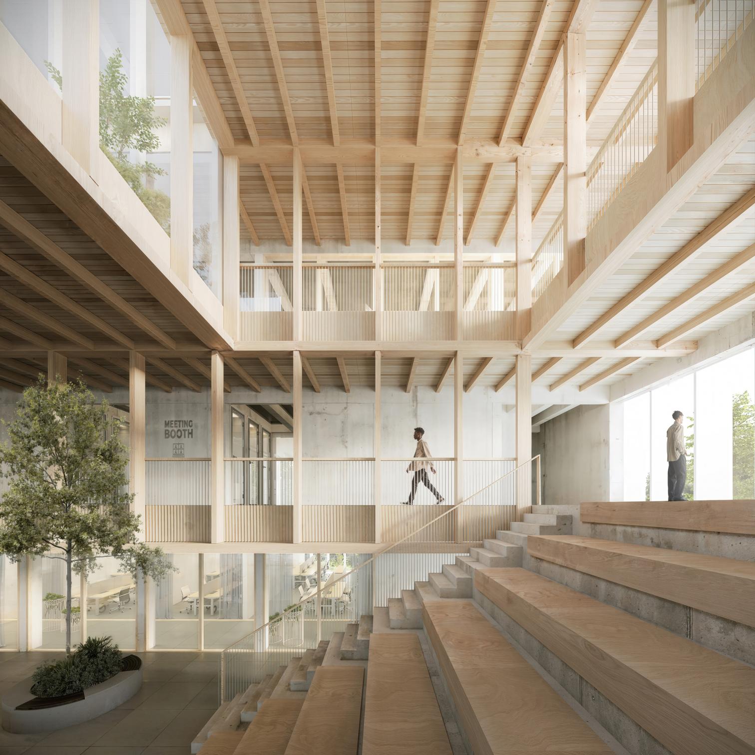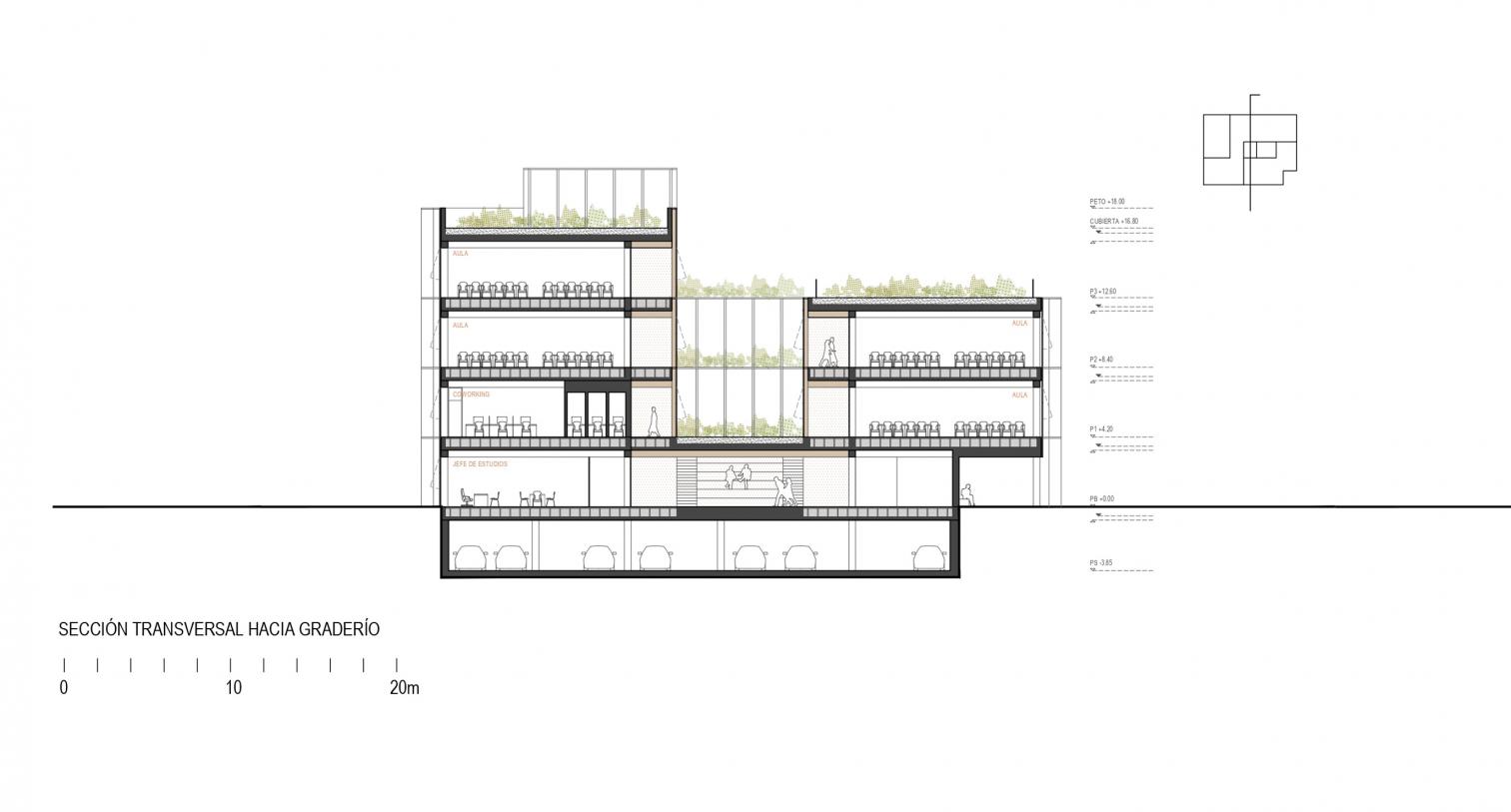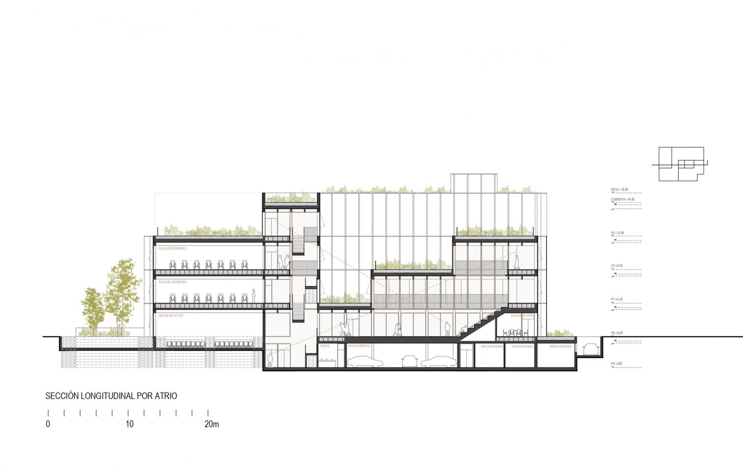 El proyecto plantea una organización espacial clara, eficiente y flexible, estructurada en una crujía perimetral que rodea un gran espacio central de circulación y convivencia. Este núcleo está formado por un atrio-patio escalonado, que conecta en diagonal los distintos niveles del edificio y ofrece vistas directas a las cubiertas ajardinadas.
