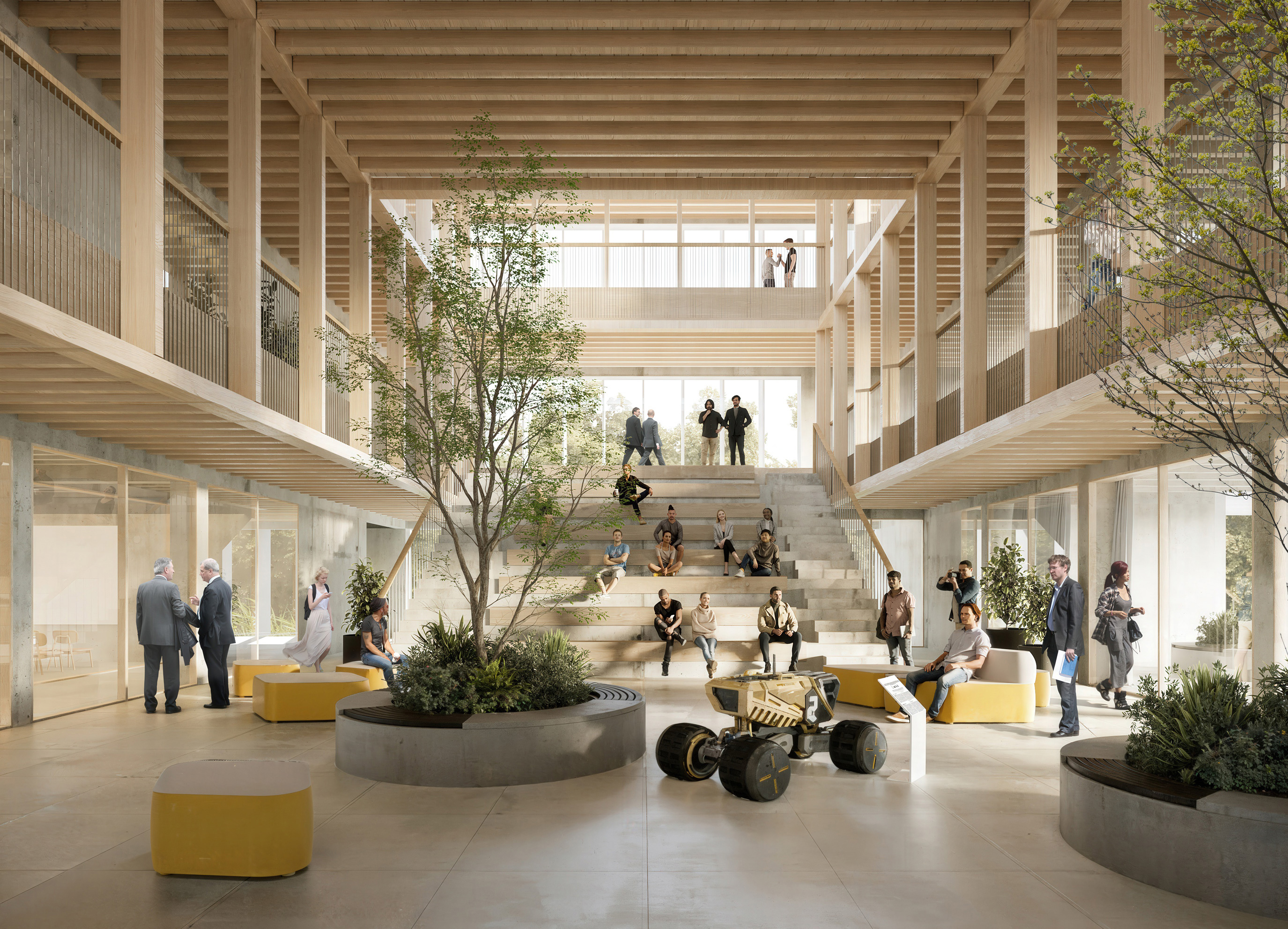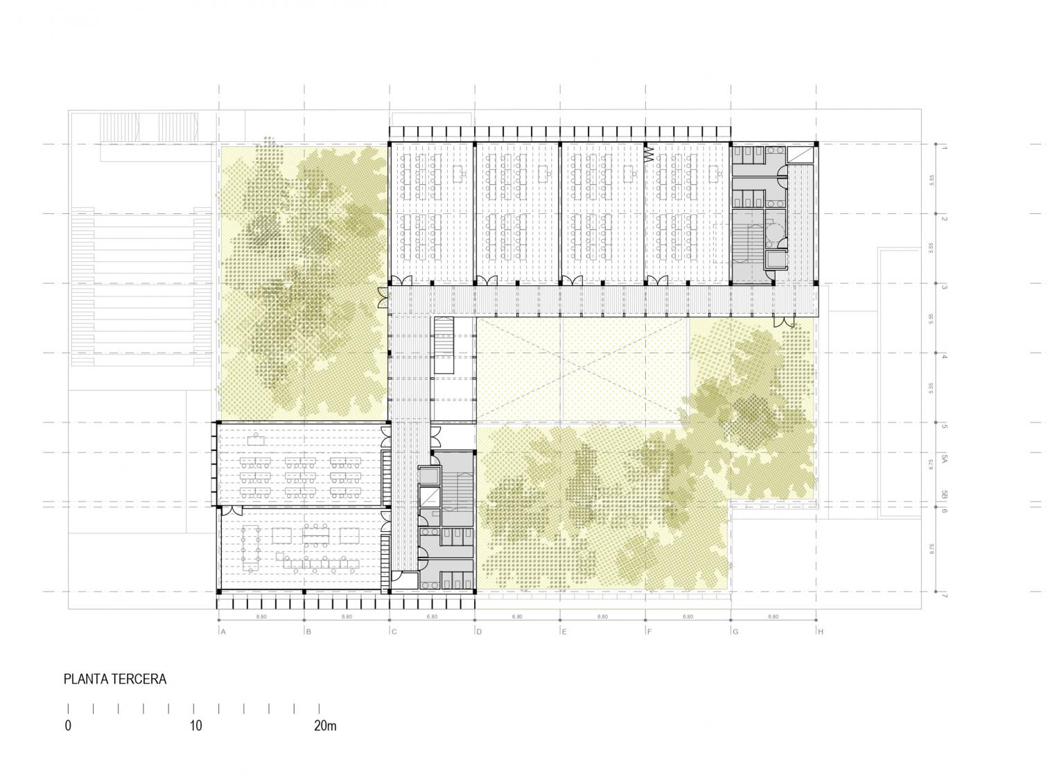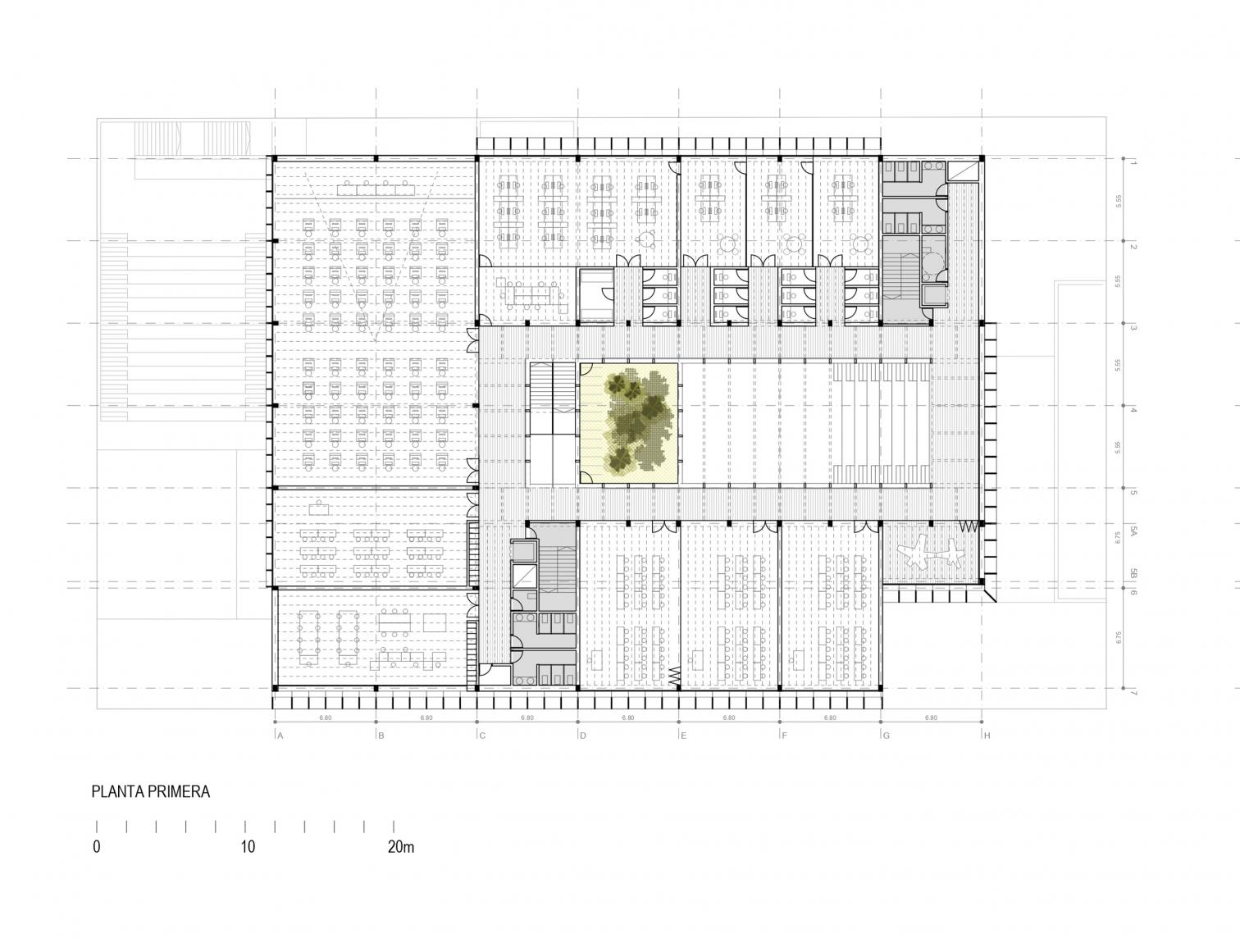 El proyecto plantea una organización espacial clara, eficiente y flexible, estructurada en una crujía perimetral que rodea un gran espacio central de circulación y convivencia. Este núcleo está formado por un atrio-patio escalonado, que conecta en diagonal los distintos niveles del edificio y ofrece vistas directas a las cubiertas ajardinadas.